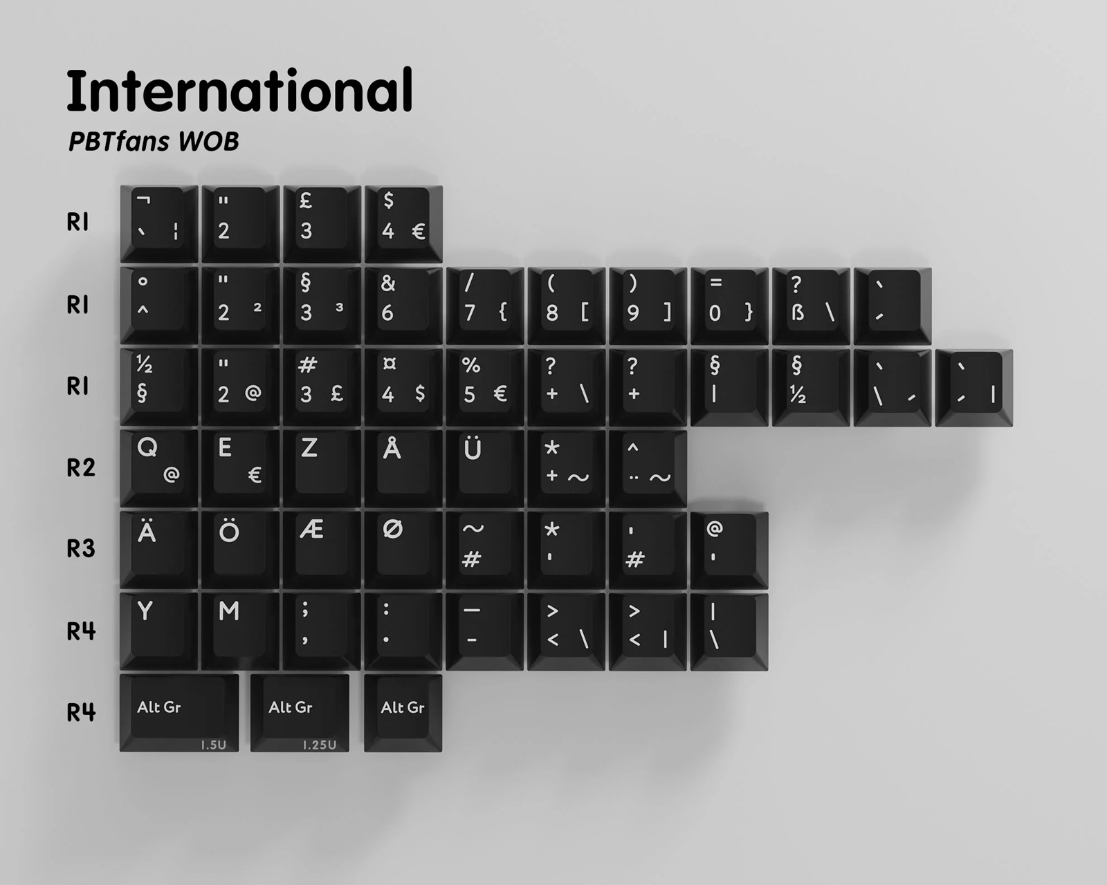 PBTFans keycaps are the perfect accessory for your mechanical keyboard. These keycaps are made of high-quality PBT material and have a Cherry profile for a natural and comfortable feeling. The double-sided production method guarantees that your keycaps will never fade or wear out during use. These keycaps are compatible with Cherry MX switches and MX-style clones and are a must-have upgrade for anyone who loves mechanical keyboards. With the international kit you can complement your PBTFans Base kit.If you are looking for high-quality keycaps that will make your keyboard stand out or need to find the perfect gift for a keyboard enthusiast, keycaps from PBTFans are an excellent choice.