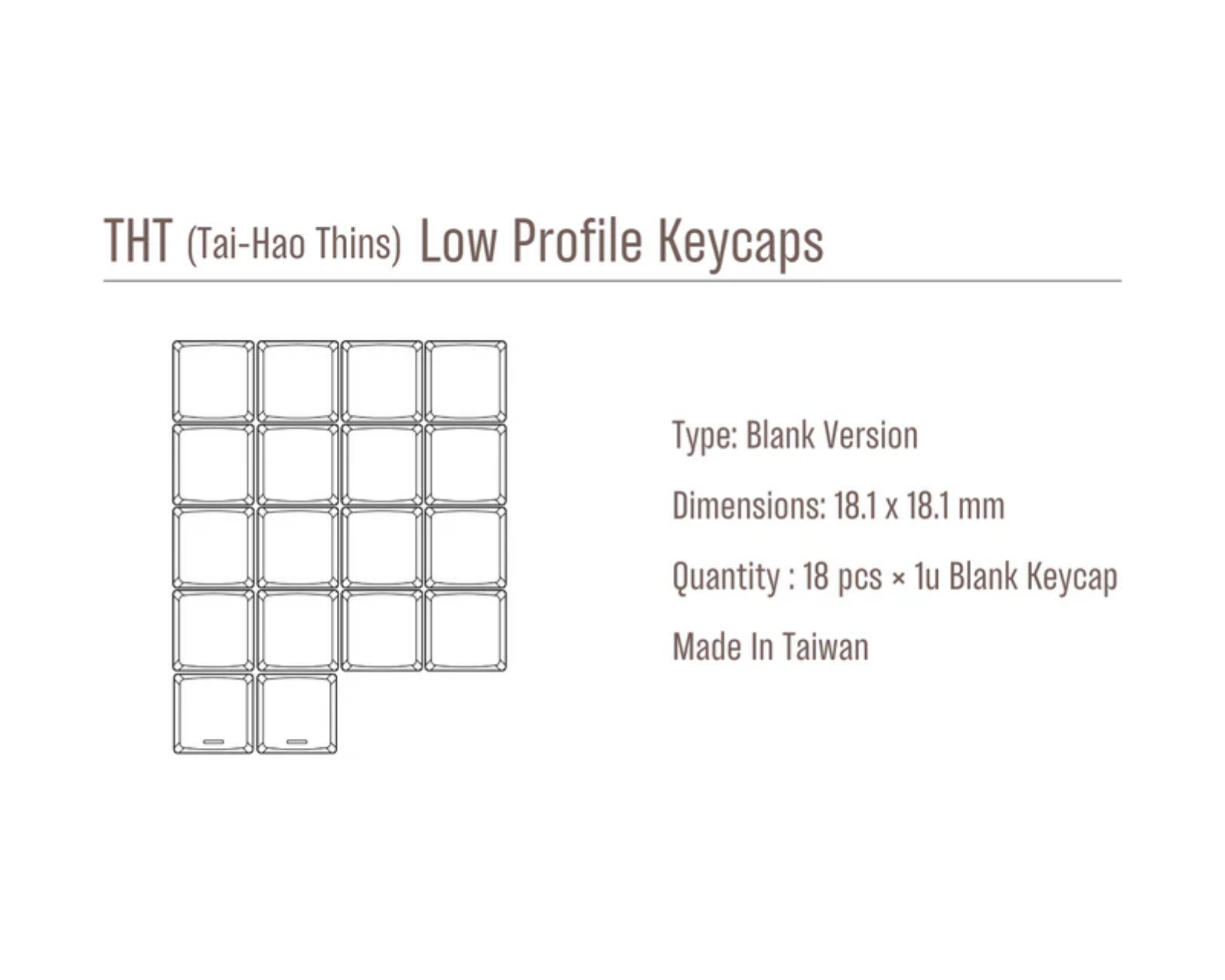 Low-profile keycaps are a set of 18 glossy keycaps from Tai-Hao, made from PBT material. The set includes 16 keycaps and 2 bonus keys and is designed for use with Choc V1 switches. The keycaps have a THCS profile and the dimensions are 16.5 × 17.5 mm. The specific PBT material provides high durability and wear resistance, which is particularly important for gamers looking for long-lasting performance.The low profile contributes to an ergonomic typing experience, while the silent key presses minimize noise levels. The minimalist design without markings offers a sleek aesthetic that fits various setup configurations.