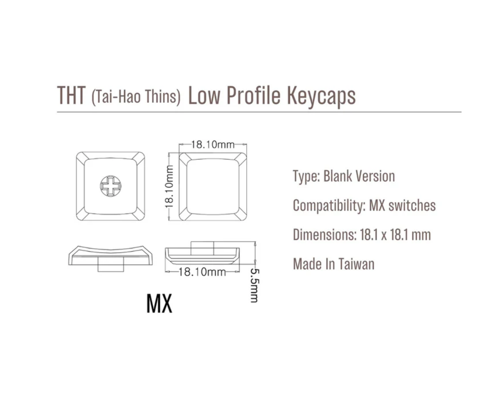 Low-profile keycaps are a set of 18 glossy keycaps from Tai-Hao, made of PBT material. The set includes 16 keycaps and 2 bonus keys and is designed for use with Choc V1 switches. The keycaps feature a THCS profile and the dimensions are 16.5 × 17.5 mm. The specific PBT material provides high durability and wear resistance, which is especially important for gamers seeking long-lasting performance.The low profile contributes to an ergonomic typing experience, while the quiet key presses minimize noise levels. The minimalist design without markings gives a sleek aesthetic that fits various setup configurations.
