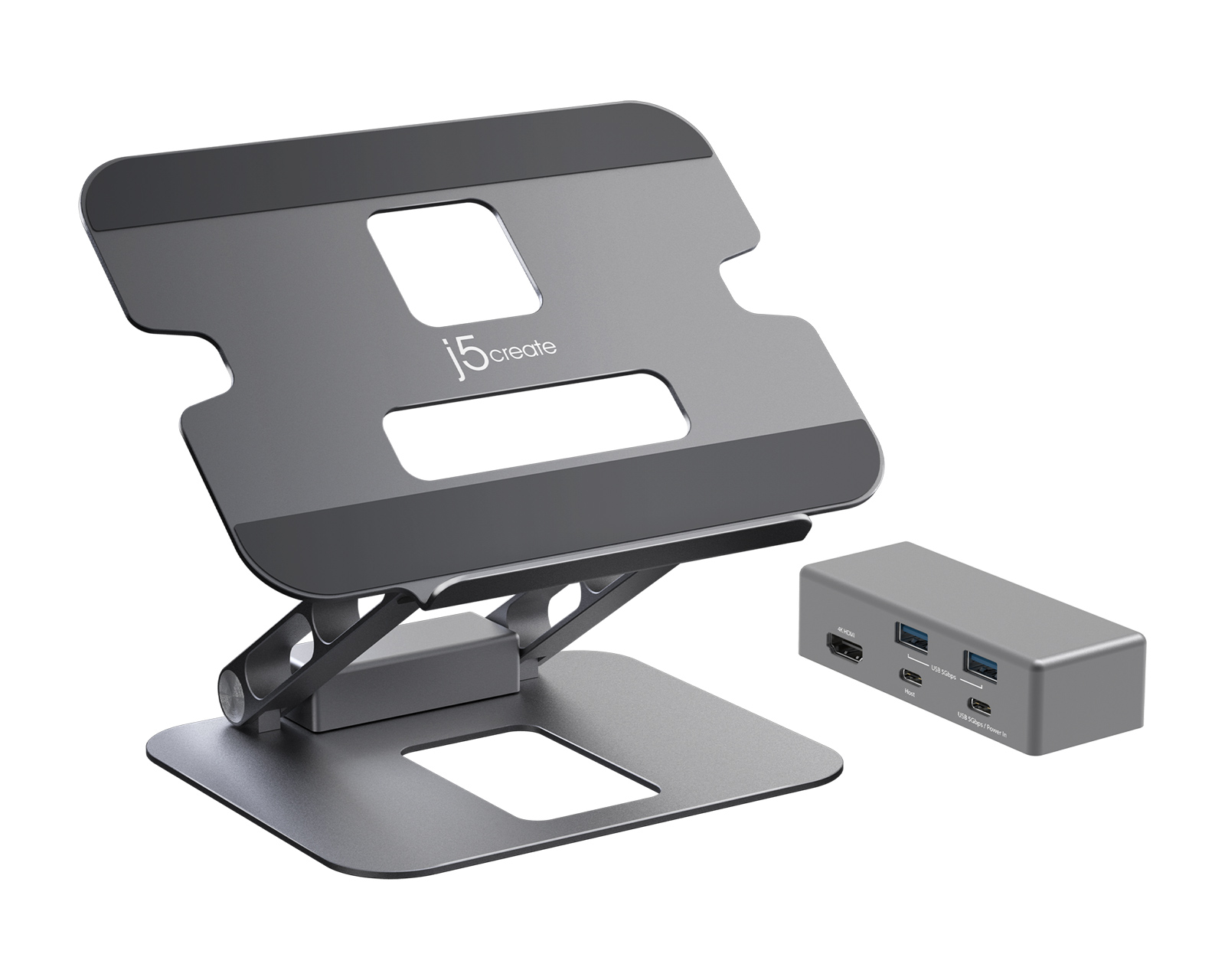 JTS327 is an adjustable laptop stand from j5create, with its aluminium body, anti-slip silicone pad and protective hook you get a premium laptop stand. Besides your laptop, you can also place other devices and things on it like tablets and books. The perfect option for those who want to promote health and have a more ergonomic working position at work or if you are playing games. The stand elevates your device so you don't have to look down and have bad neck and back posture for an extended period, it simply makes it easier for you to get better posture at your workplace or home. It has a maximum weight of 4 kg and works for laptops that are 16" and smaller.The integrated USB-C mini docking station has 4K HMDI output, two USB 5Gbps Type-A ports and also a USB-C port that supports 5Gbps data transfer speed and has a Power Delivery of 100 W. The JTS327 has all the connectivity you need to easily and smoothly build your workplace at home and connect your computer accessories for increased productivity and improved gaming experience.