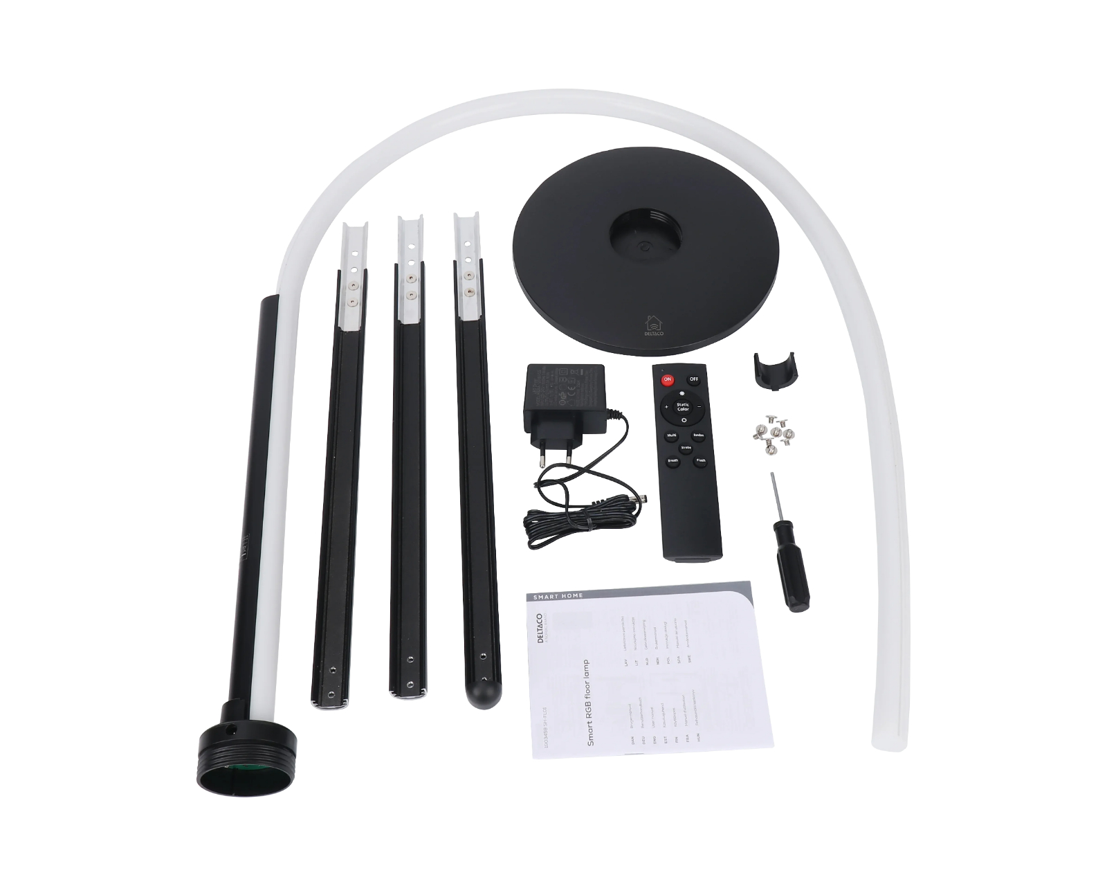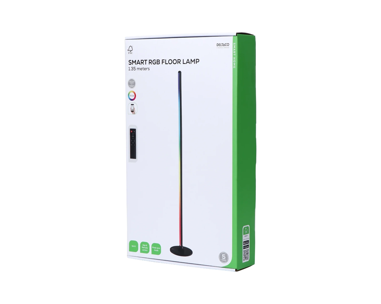 Smart Home Floor Lamp is a floor lamp from Deltaco Smart Home that offers remote and app control. With a height of 1.35 meters and support for RGBIC technology, it displays multiple colors simultaneously, creating impressive lighting effects and transitions. It is designed to fit into modern homes and is used in everything from living rooms to offices.The lamp is equipped with 93 LED lights and has a lifespan of 20,000 hours. It operates with WiFi 2.4 GHz and IEEE 802.11b/g/n standards. Control can be done either via the included remote control for instant settings of color, brightness, and various modes, or through the Deltaco SMART HOME app, which allows for adjustment of the lamp from a smartphone for more convenience. The lamp is also compatible with Google Home and Amazon Alexa for voice control.