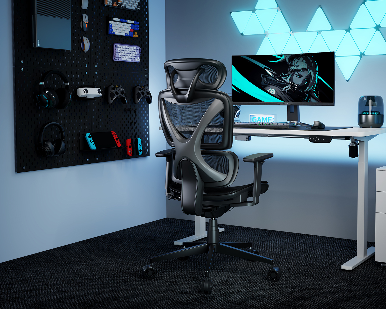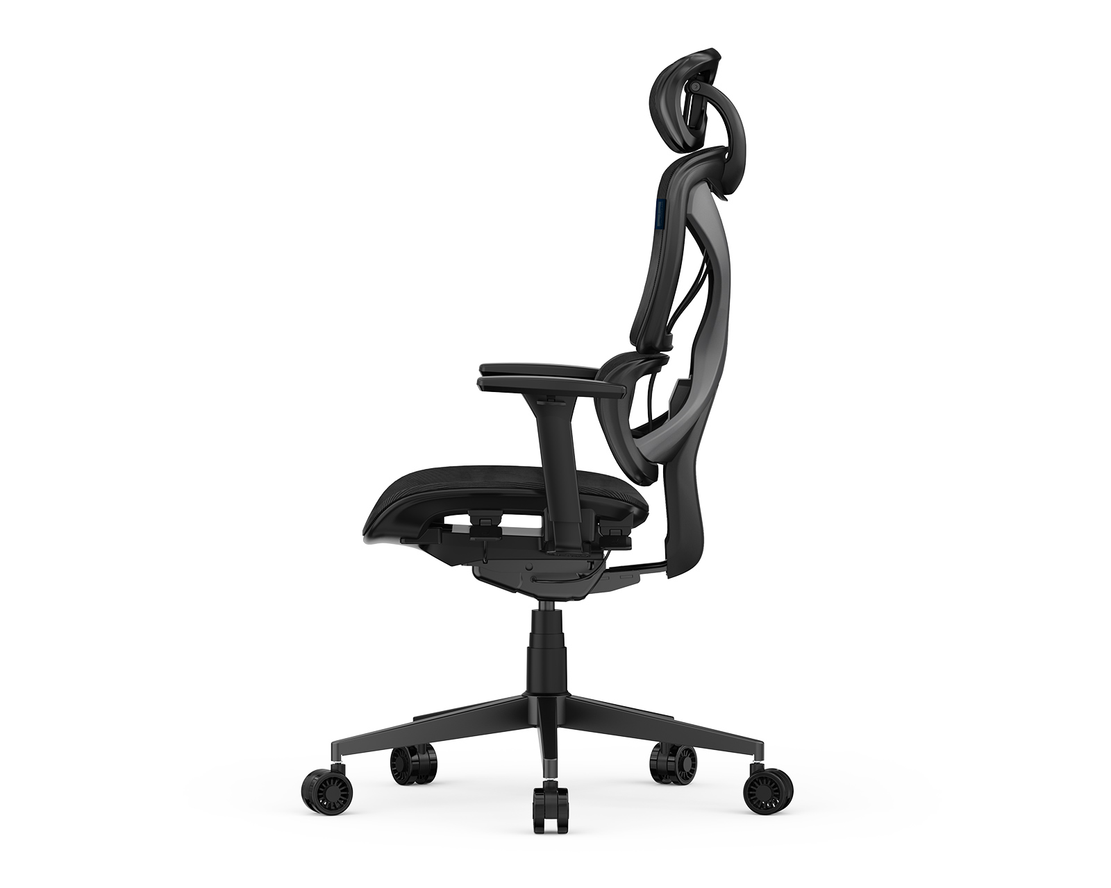 SpineX Pro is a gaming chair from MaxMount that combines advanced ergonomics and functionality. The chair has a maximum load of 130 kg and a weight-balanced tilt mechanism for a customizable sitting experience. This makes it suitable for both gaming and office work.The chair is covered in a breathable mesh material that provides a flexible and comfortable surface. The adjustable headrest is made of PU with discreet embroidery, allowing for both height and rotation adjustments to improve body posture. The armrests have 3D functionality with soft PU-colored padding and adjustments for height, depth, and rotation. The central element is the weight-balanced cable control mechanism, which synchronizes the chair's and backrest's movements. Adjustments are easily made with cable levers located on the edge of the chair. The chair also offers a sliding seat to customize the seat depth and fits various users.
