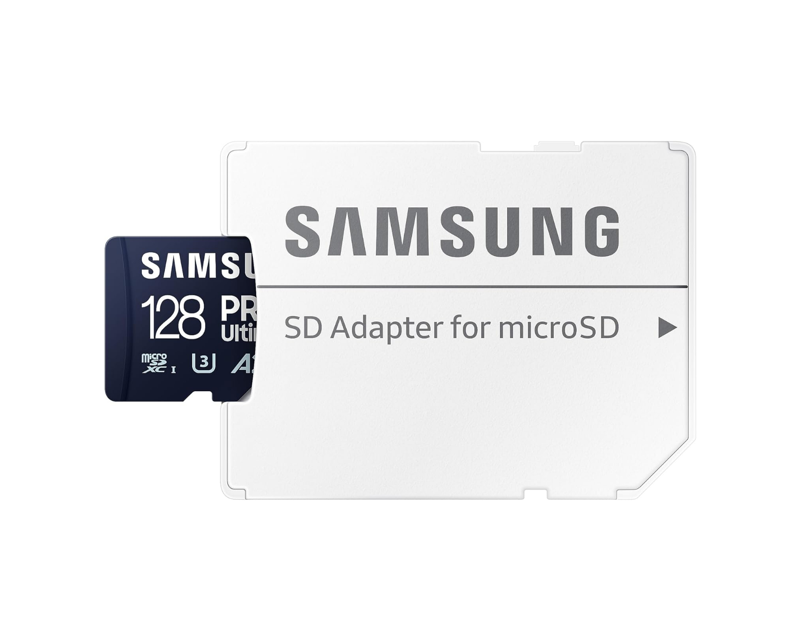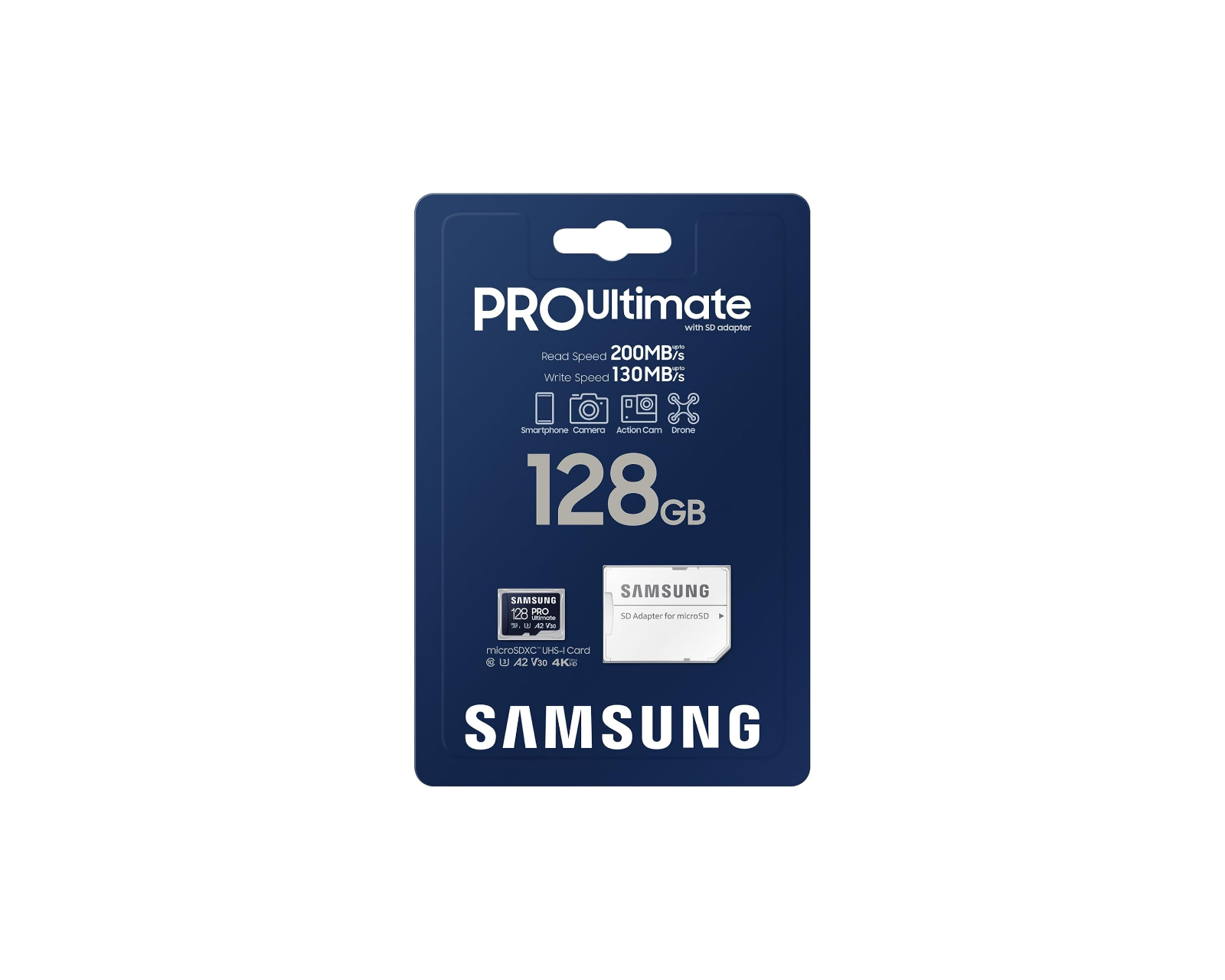 MicroSD PRO Ultimate is a high-performance memory card from Samsung, designed to meet the needs of gamers and creators. With an impressive storage capacity of 128 GB, this card allows for storage of up to 7.5 hours of 4K/UHD video or 67,518 photos in FHD. Equipped with a read speed of up to 200 MB/s and a write speed of 130 MB/s, this card is perfect for smartphones, drones, and action cameras.The PRO Ultimate card offers robustness and versatility, with six protection features including waterproofing, temperature resistance, X-ray safety, and shock resistance. It measures 15 x 11 x 1 mm and weighs only 0.26 g, making it both lightweight and easy to carry. With its UHS-I U3 rating, it guarantees high speed for 4K/UHD and continuous shooting, allowing users to capture and store the most intensely detailed moments without compromising performance.