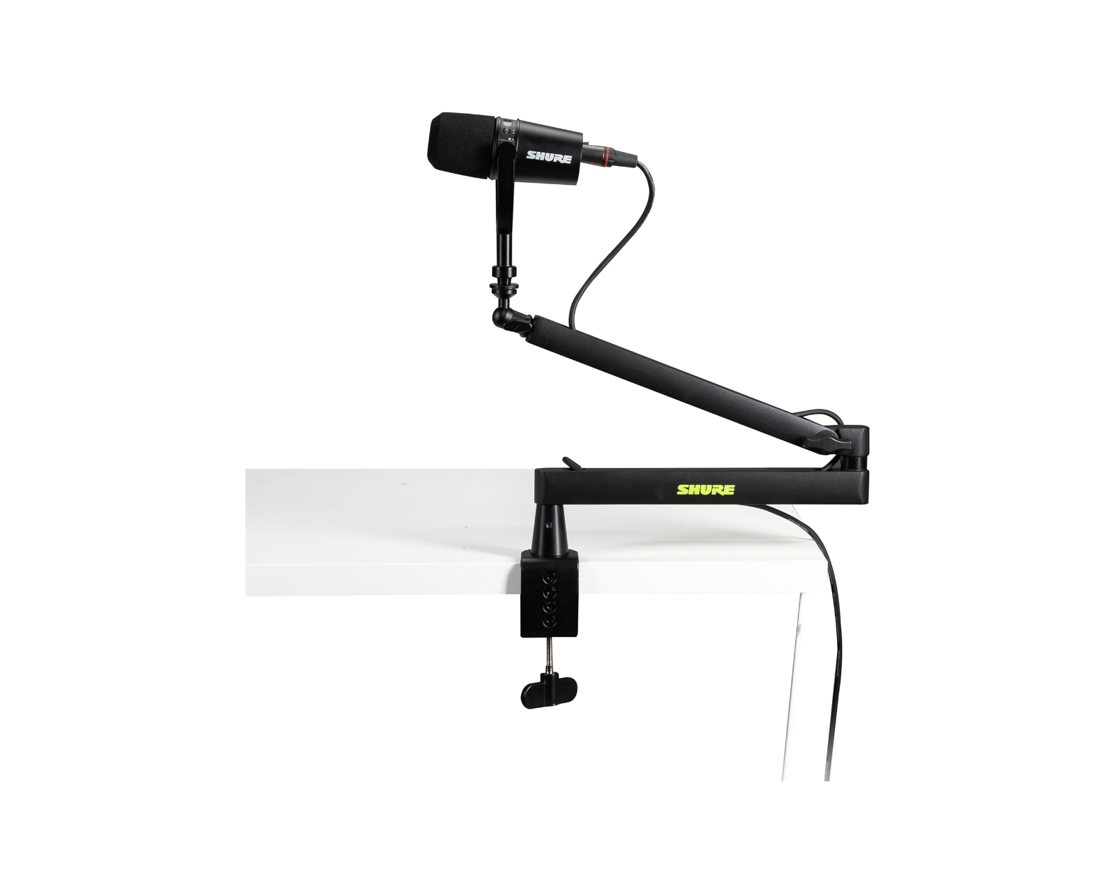 Maximize your studio or workspace with the Shure by Gator Low Profile Boom Microphone Arm, the perfect solution for podcasters, streamers, and broadcasters seeking discreet elegance and functionality. With a low-profile design, the microphone arm sits below eye level to avoid obstructing your view, making it ideal for both small and large desks. The silent 360-degree rotation and 90-degree vertical adjustment provide exceptional flexibility, while the sturdy steel construction supports microphones weighing up to 2 kilograms.Easy to mount with optional clamp or screw mount, along with integrated magnetic cable channels, contributes to a neat and organized workspace. Compatible with microphone series such as Shure SM7 and MV7.