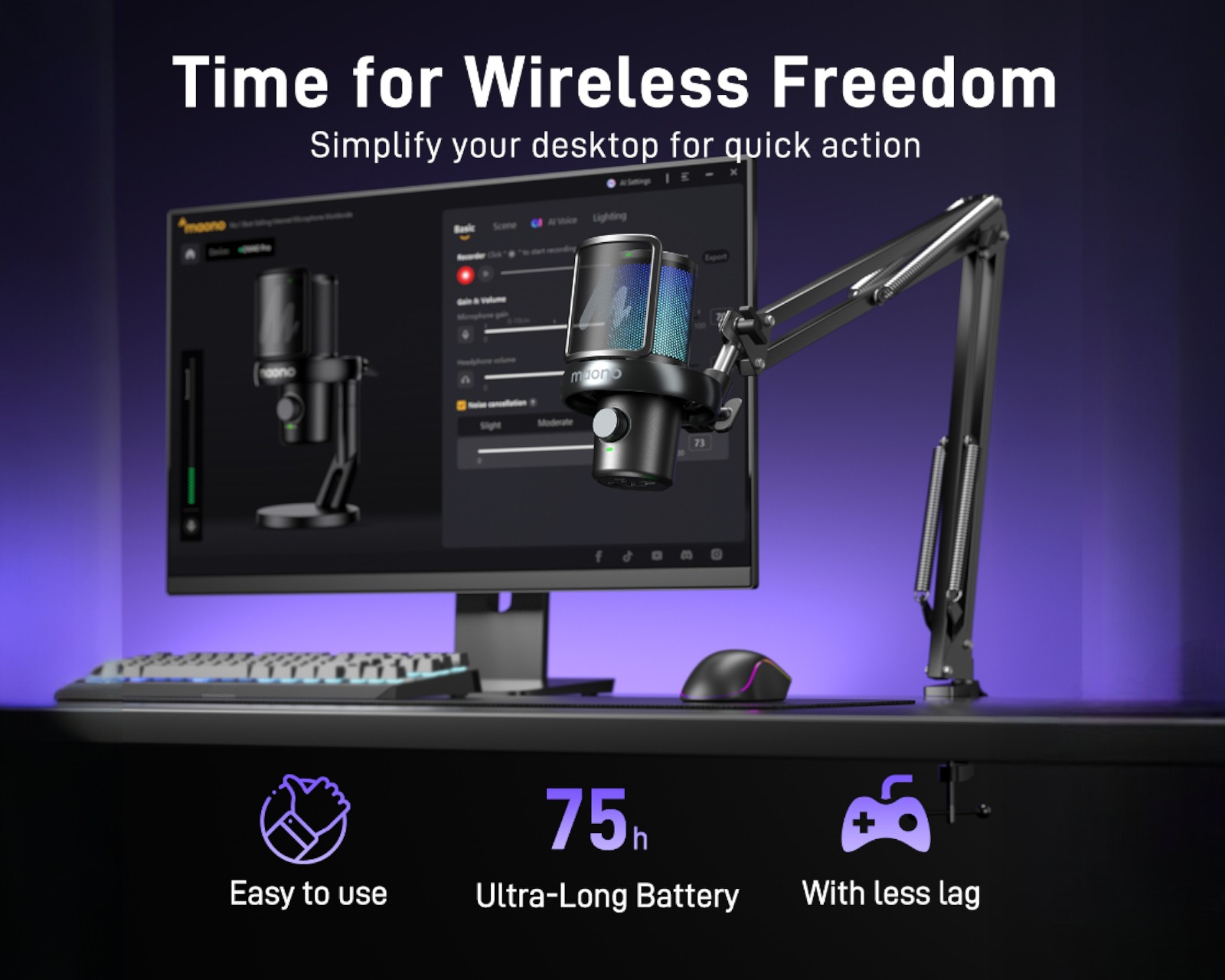 DM40 is a condenser microphone from Maono and offers both USB and wireless connectivity. It is intended for game streaming and other audio recordings from various sound sources such as computers and smartphones. The device has a long battery life and supports up to 40 hours of continuous use, giving gamers the freedom to play uninterrupted. The microphone is also equipped with 10 different AI voice effects, allowing for interesting and creative sound transformations during streaming.DM40 has a robust build quality and a smart design that makes it easy to adjust audio settings and choose between different sound filters. With four adjustable levels of noise reduction, the microphone delivers clear sound reproduction regardless of the environment. According to specifications, it is compatible with both Windows and macOS, providing great flexibility for various users. Through Maono Link, users can unlock more features such as EQ, limiter, and compressor adjustments to further optimize the sound.