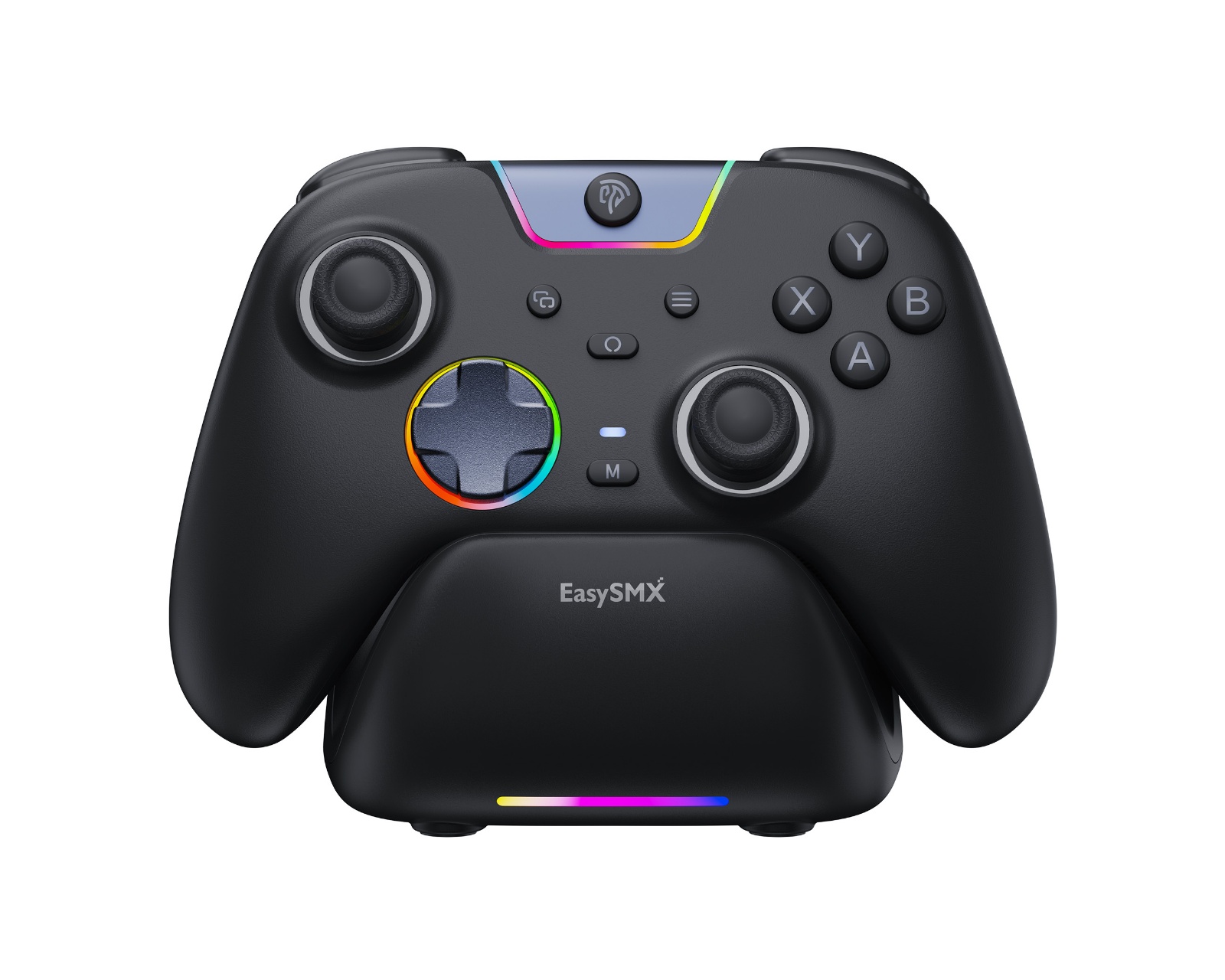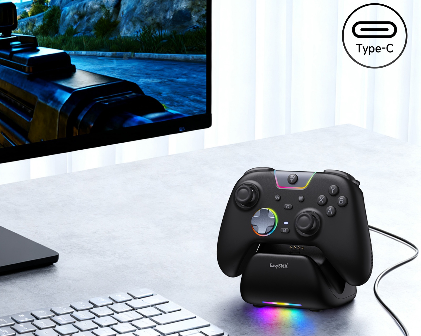 EasySMX X05Pro Charging Dock is a docking solution aimed at users of the EasySMX X05Pro wireless controller. The product offers a secure and form-fitting stand that stabilizes the controller and is easy to use with a USB-C connection. The dock is designed to provide a clean and reliable power source without complicated installations.The dock is equipped with a dedicated compartment for storing the wireless receiver, preventing the loss of important components. The stable, non-slip base with silicone pads ensures that the dock stands securely on all surfaces, minimizing the risk of it sliding or tipping over during use. An elevated viewing angle allows the controller to be easily displayed on desks, shelves, or in gaming rooms.
