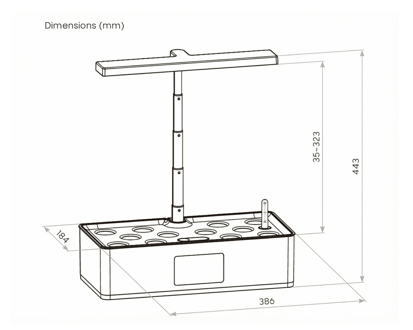 Hydroponic growing system with LED lighting from MaxMount is an efficient indoor gardening solution designed to maximize the cultivation of up to 12 plants. It offers comprehensive LED lighting that provides full-spectrum light for faster growth, making it ideal for city dwellers or enthusiasts who want to grow plants in limited spaces. With a water reservoir capacity of 4 liters and a digital control panel, users can easily manage the conditions for their plants.The system is built from durable ABS and aluminum construction, ensuring long lifespan and reliability. The silent high-capacity pump circulates water efficiently and increases the oxygen content in the solution, which is crucial for promoting strong root structures. The adjustable light bar can be customized according to the height of the plants, providing flexibility for different types of plants. The handy water level indicator makes maintenance easy by quickly providing an overview of the liquid levels.Summary