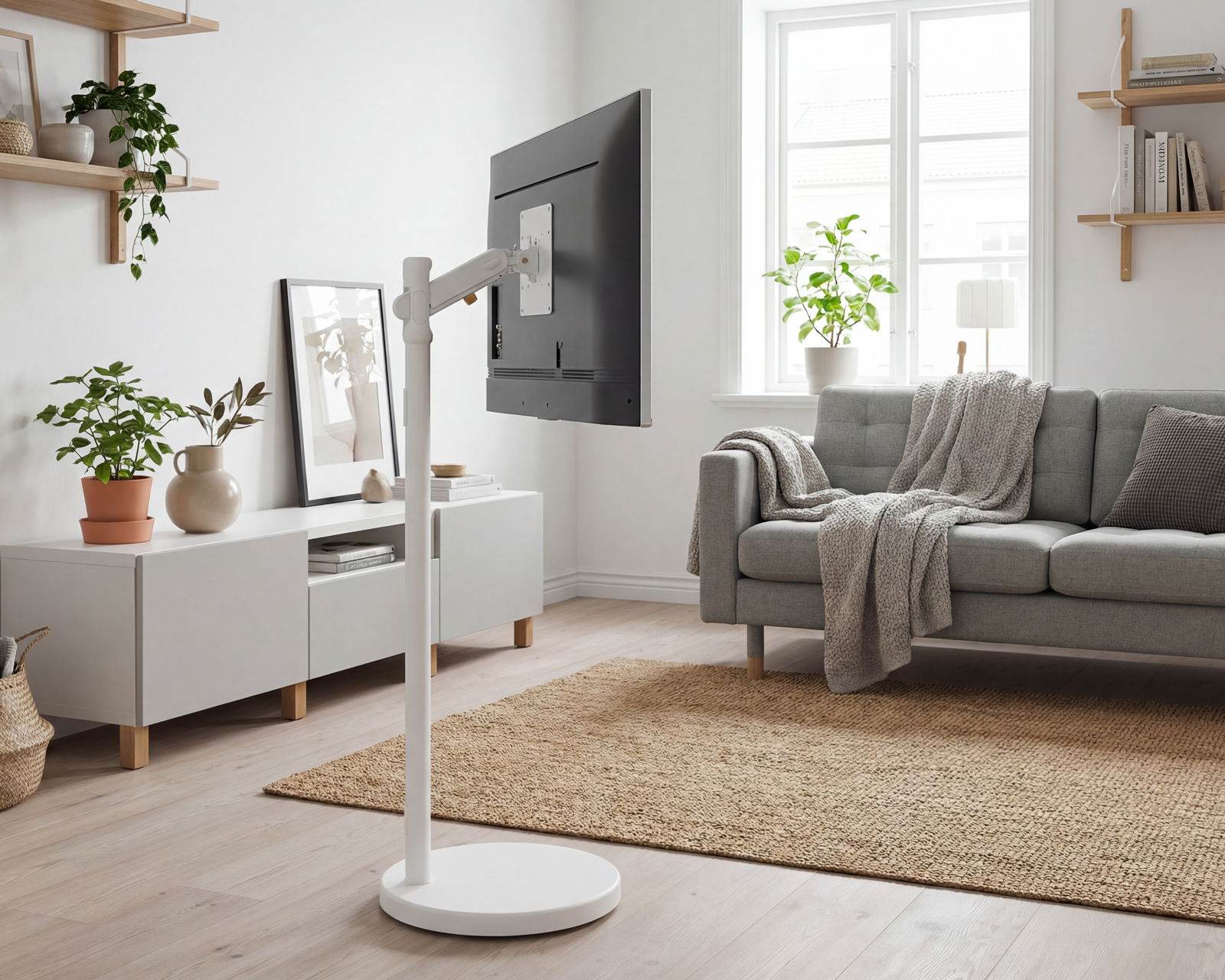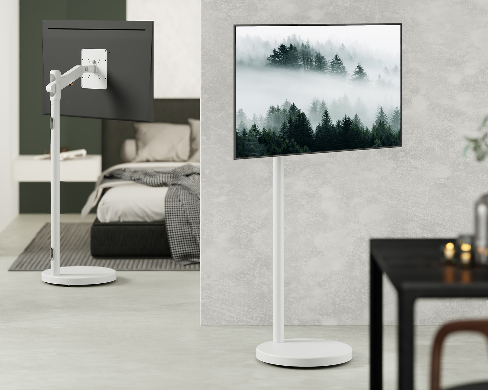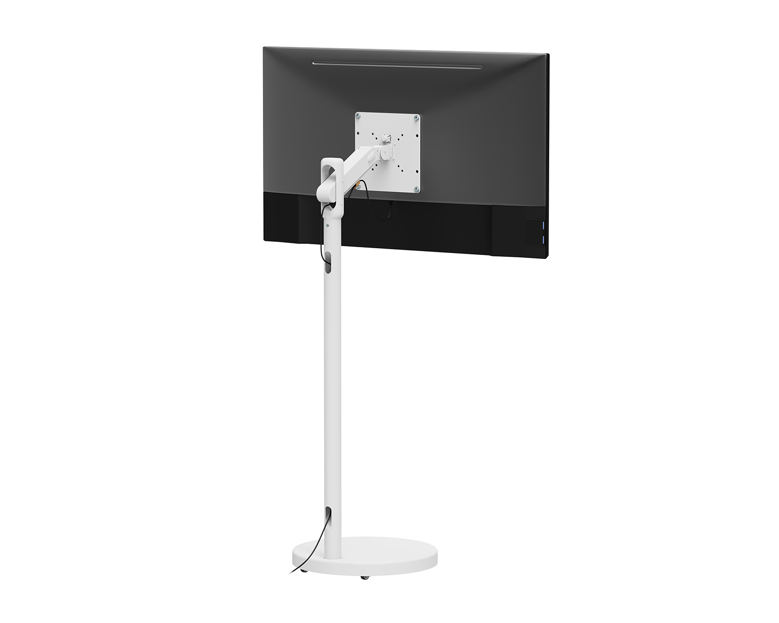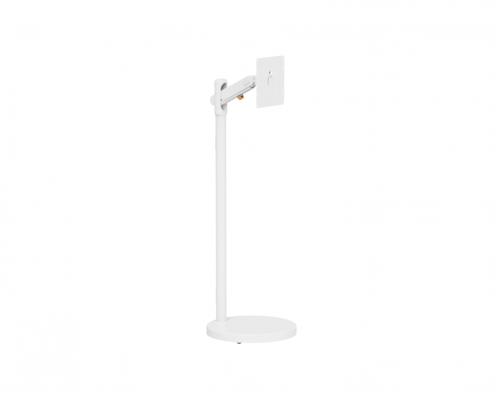 Floor stand for TV from MaxMount that offers optimal flexibility for both office and home use. With support for screens sized between 17 and 43 inches and a maximum load of 17 kg per screen, it is a versatile option for anyone looking for a stable and adjustable solution. The adjustable spring arm makes it easy to customize height and tilt to achieve the perfect viewing angle.The stand is made of high-quality materials such as plastic and aluminum, ensuring both durability and low weight. With purposeful design integrated into the construction, it also includes integrated cable management that keeps cables organized and hidden. This provides a clean and professional appearance, which is especially important in work environments. Its large rotation ability between +180° and -180° and tilt from +75° to -45° allows for adjustment for different viewing angles. Hidden wheels under the stand make it easy to move without compromising stability.