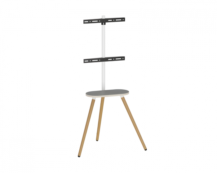 Easel Studio TV Floor Stand is a TV stand from MaxMount that combines style and function. It is designed to create a comfortable viewing experience, perfect for home theaters, offices, and exhibition centers. With a swivel screen that moves between +45° and -45°, you can easily adjust the angle to suit your audience. The glossy melamine shelf is placed directly under the TV and offers practical storage for remote controls, portable speakers, and other small items.The stand is made from robust materials, including steel, aluminum, and melamine, providing a stable construction with a weight capacity of up to 35 kg. With compact dimensions of 735x508x1365 mm, it can accommodate screens between 43 and 65 inches while being VESA compatible for easy installation. The integrated cable management system keeps cables organized and out of the way, contributing to a neat and clean setup. Safety features included ensure that the stand does not tip over.