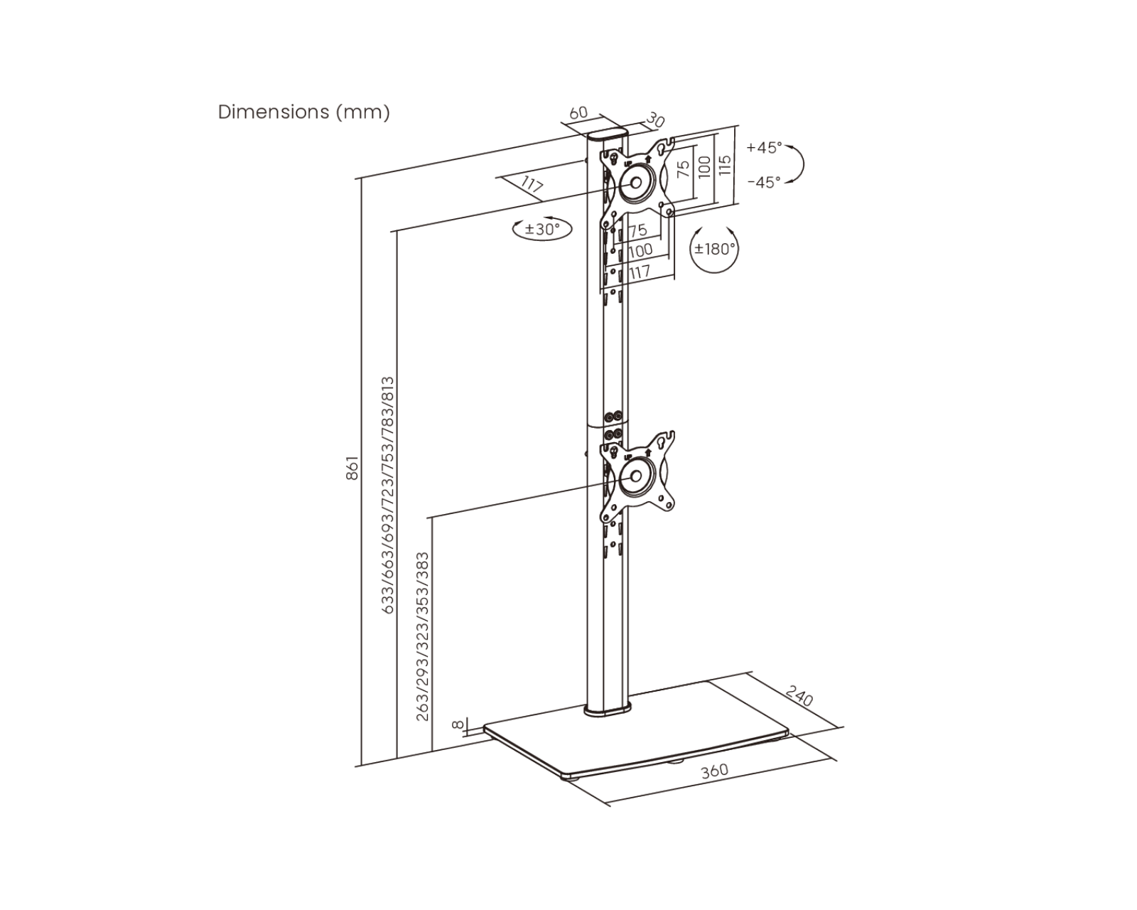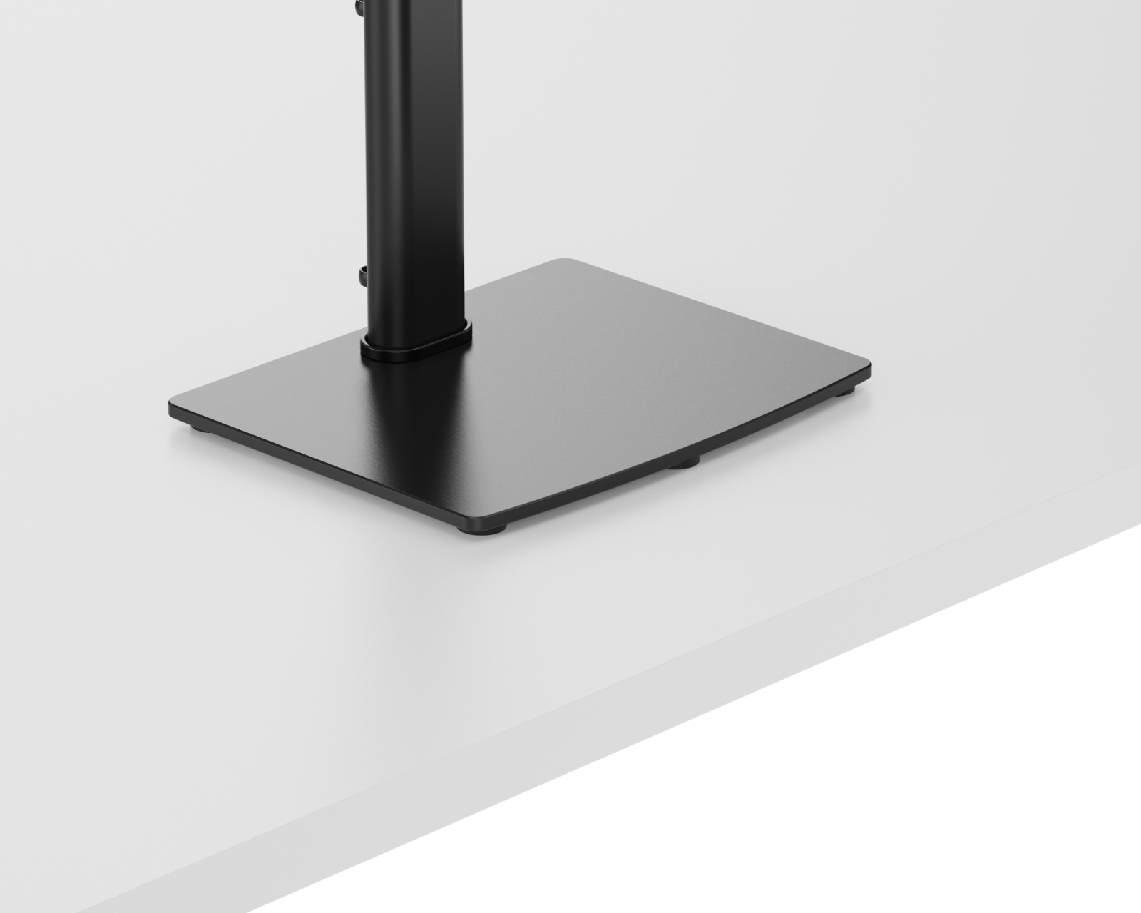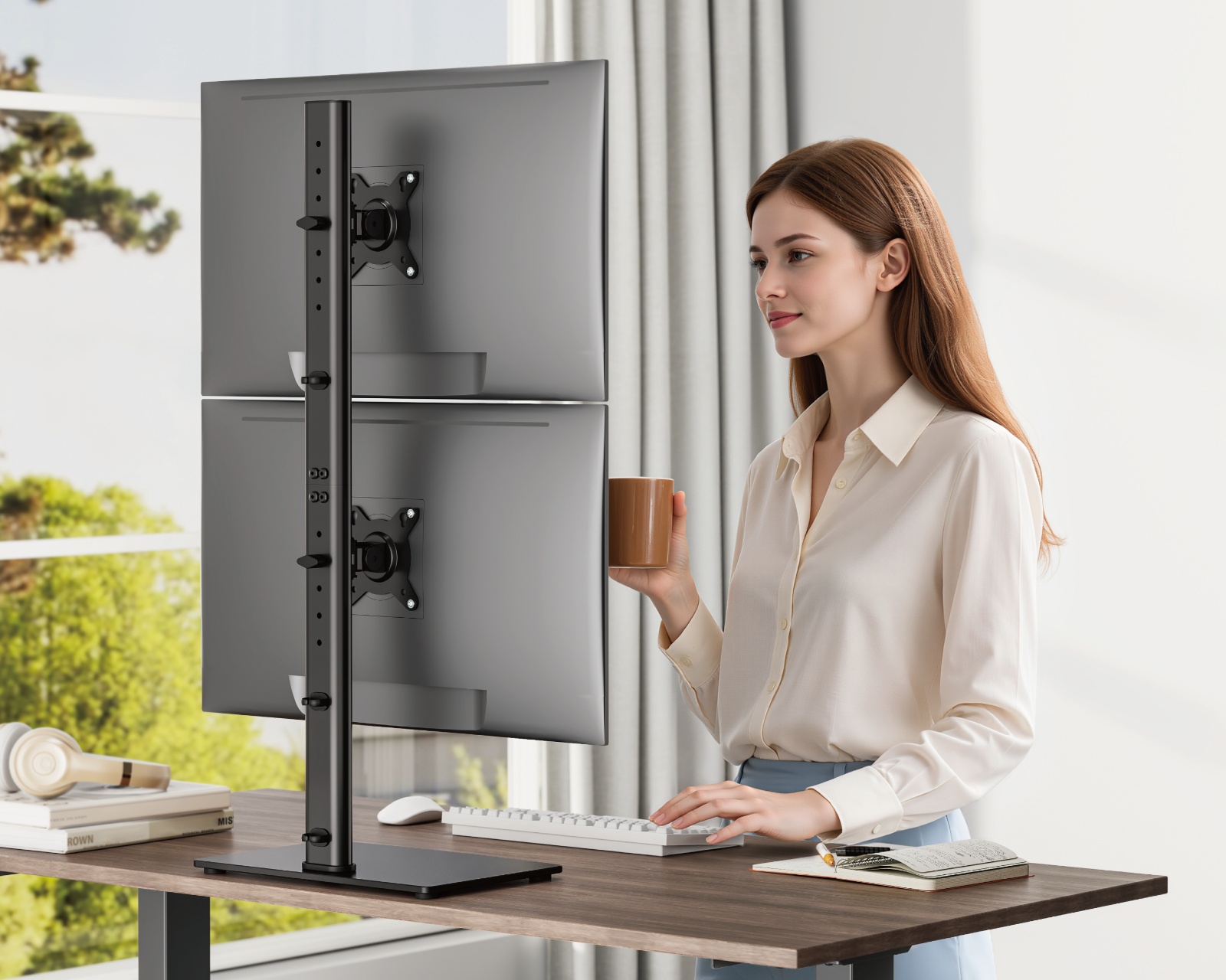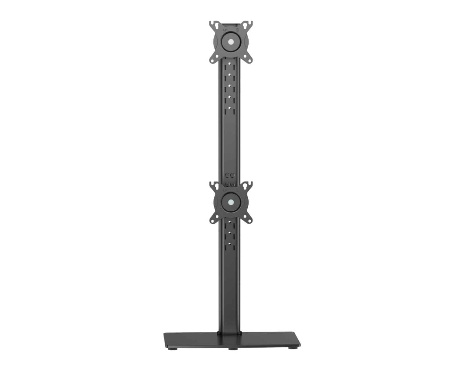 Vertically Mounted Monitor Stand for 2 Monitors 17"-34" 12 kg - Black is a monitor stand from MaxMount designed to support two monitors with a weight capacity of up to 12 kg per monitor. This stand offers a compact and stable construction with a sleek appearance, thanks to the tempered glass base. The stands also have multiple height adjustment settings that allow for fitting into various work environments and user preferences. Thanks to the tool-free tilt system, the monitor can be easily adjusted between +45° to -45°, providing the user with an optimal viewing angle.The build quality of the Vertically Mounted Monitor Stand is high, with materials of plastic and steel offering both durability and stability. The VESA compatibility (75x75 and 100x100) makes it easy to attach monitors, and the 360° rotating plate provides flexibility in usage. The stand is designed for both gamers and office workers, meaning it combines functionality with style. The cable management system ensures that cables are kept organized, creating a clean and efficient workspace. In addition, stability is ensured by the large base, so the unit will not tip over regardless of how it is adjusted.