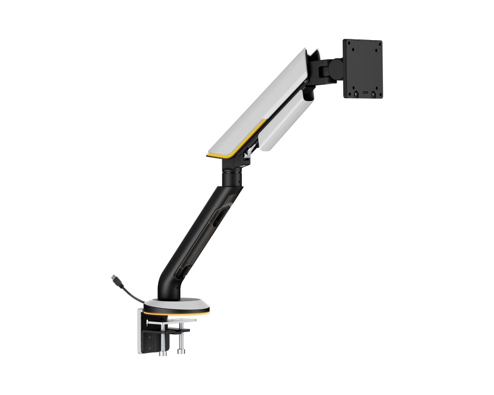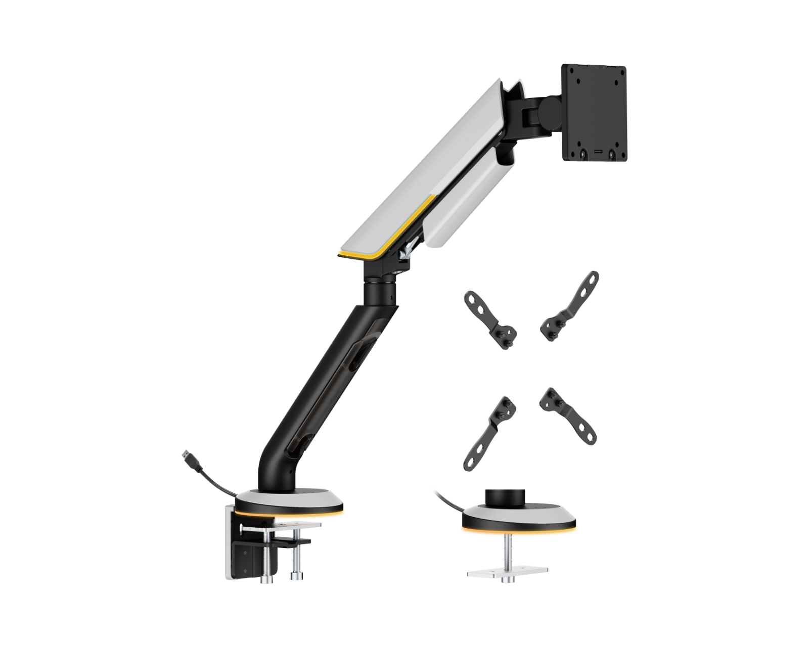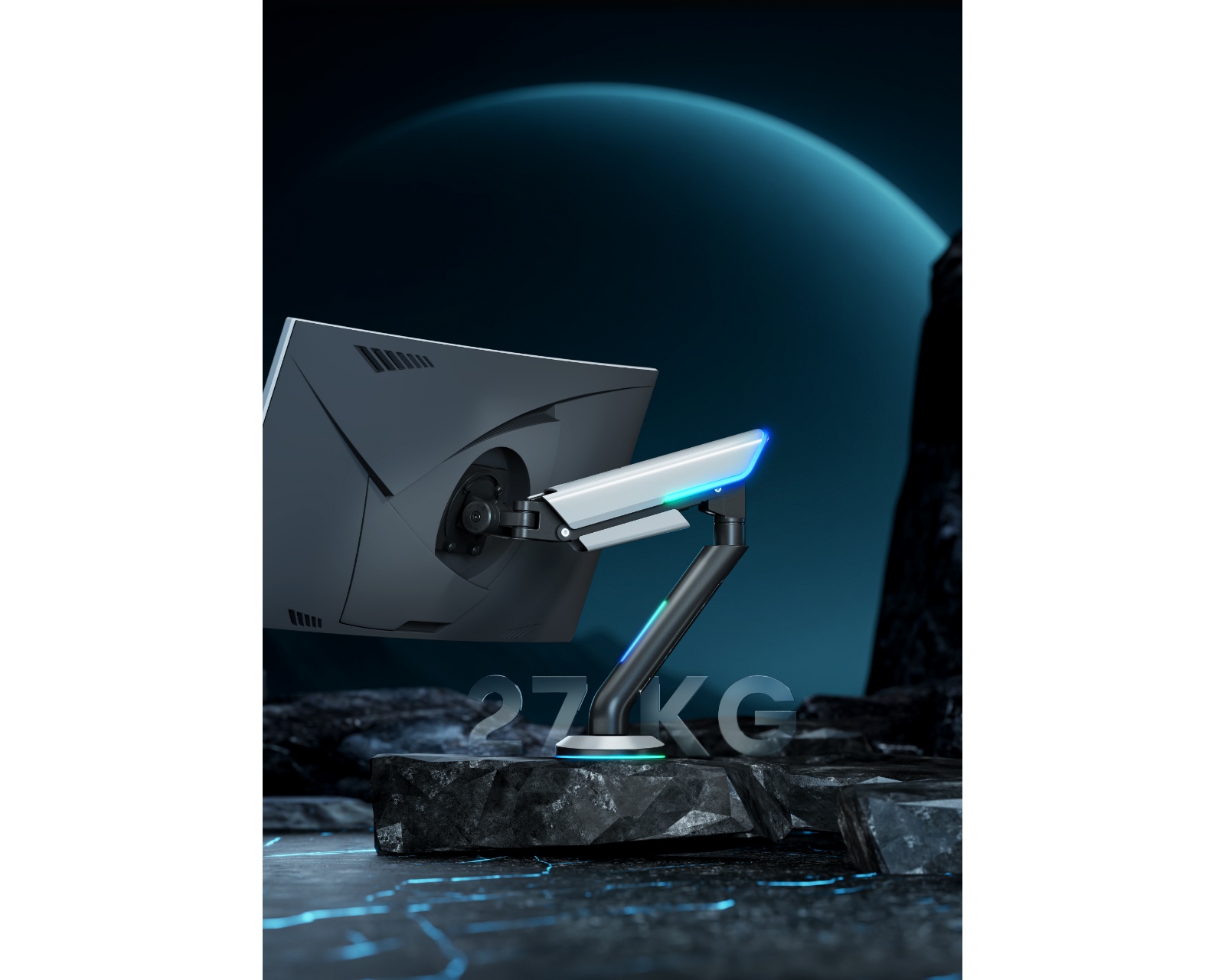 Titan Heavy-Duty Gas Spring RGB Lighting Monitor Arm is a monitor mount from MaxMount that supports massive monitors up to 57 inches and 27 kg. This arm provides a stable platform for optimally positioned screens and has a range of adjustment options to enhance the viewing experience.Equipped with 20 dynamic RGB lighting modes, it creates a custom gaming atmosphere. The mounting is secured via a quick-release VESA plate, which also facilitates the installation and removal of the monitor. The arm's construction ensures stability and safety even for larger displays. The arm's design includes a built-in spring tension mechanism that allows for precise adjustments of weight and movement. It allows for screen utilization through tilting, swinging, rotating, and height adjustment to meet user demands. Mounting options include both desk clamp and grommet for flexible installation. The VESA support goes up to 200x200 via the included adapter, allowing for the use of various monitor formats.