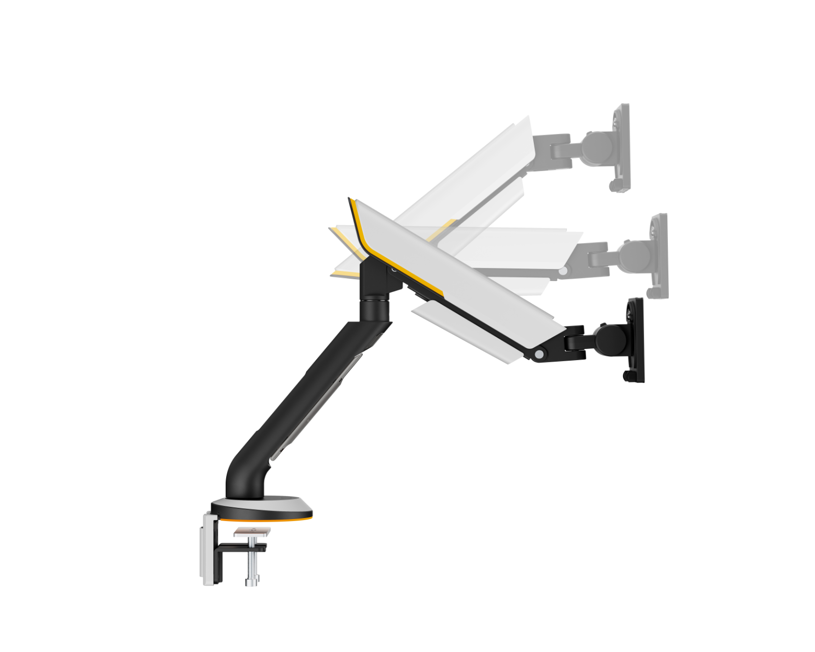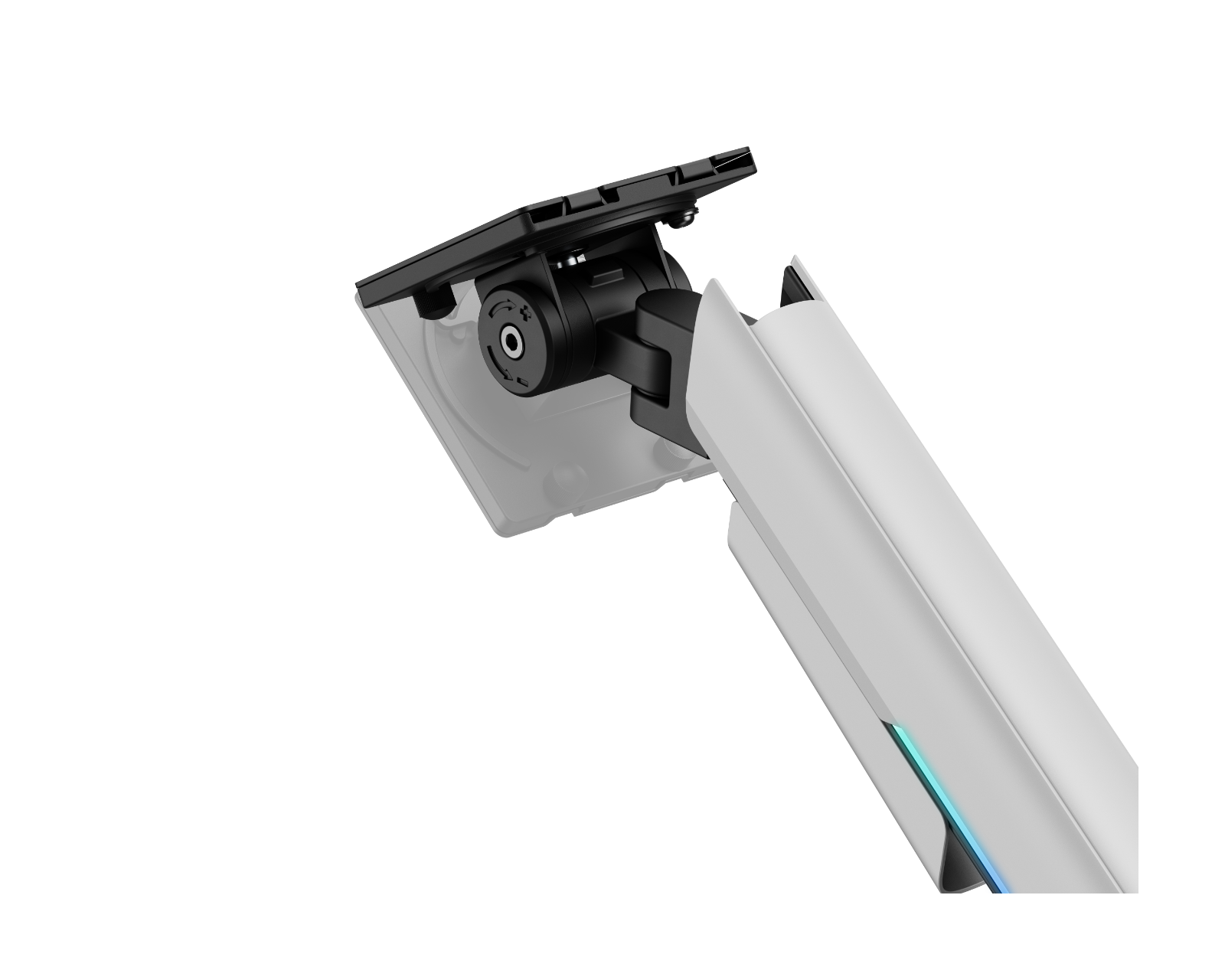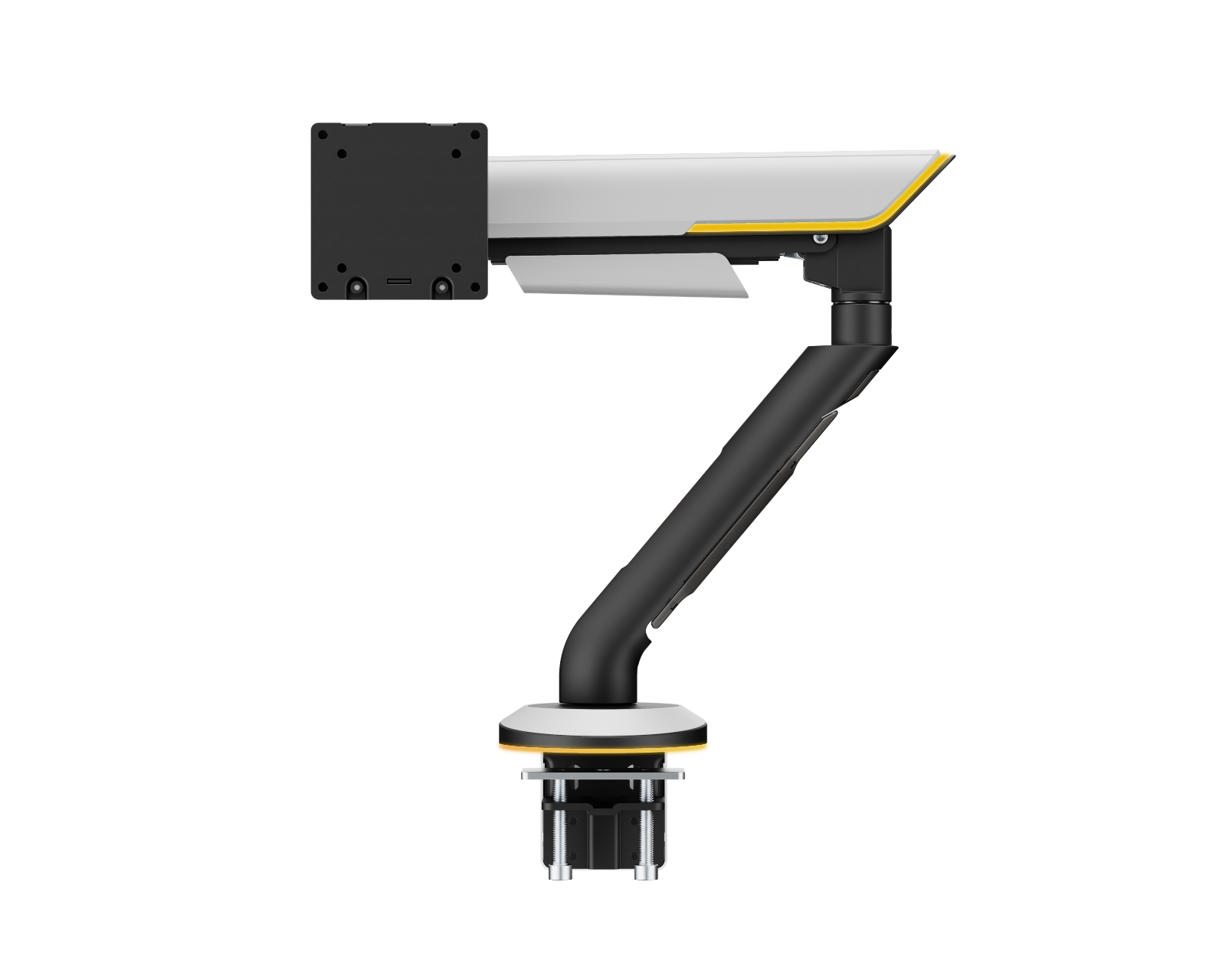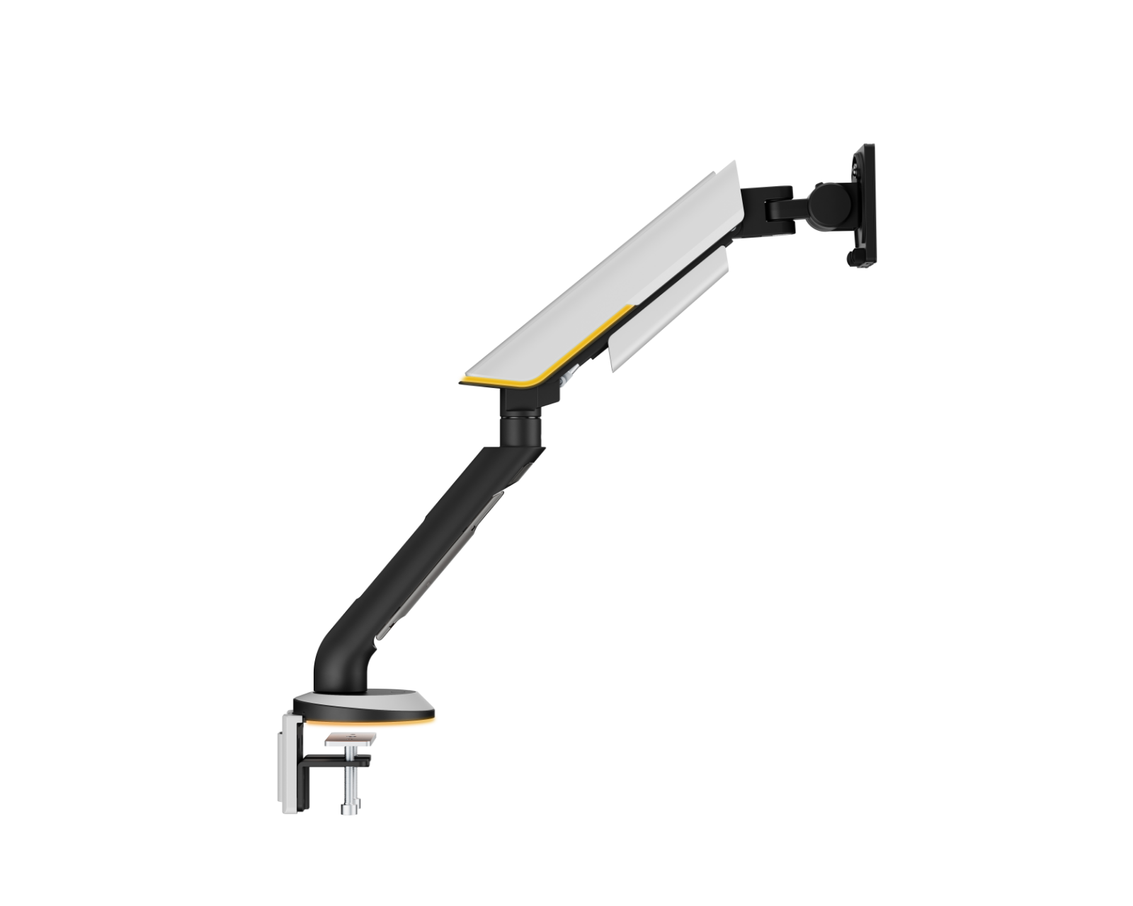 Titan Heavy-Duty Gas Spring RGB Lighting Monitor Arm is a monitor mount from MaxMount that supports massive monitors up to 57 inches and 27 kg. This arm provides a stable platform for optimally positioned screens and has a range of adjustment options to enhance the viewing experience.Equipped with 20 dynamic RGB lighting modes, it creates a custom gaming atmosphere. The mounting is secured via a quick-release VESA plate, which also facilitates the installation and removal of the monitor. The arm's construction ensures stability and safety even for larger displays. The arm's design includes a built-in spring tension mechanism that allows for precise adjustments of weight and movement. It allows for screen utilization through tilting, swinging, rotating, and height adjustment to meet user demands. Mounting options include both desk clamp and grommet for flexible installation. The VESA support goes up to 200x200 via the included adapter, allowing for the use of various monitor formats.