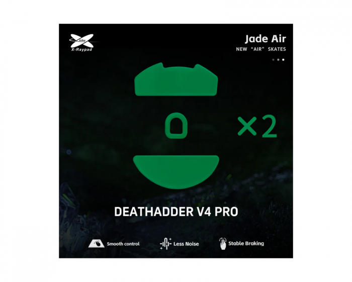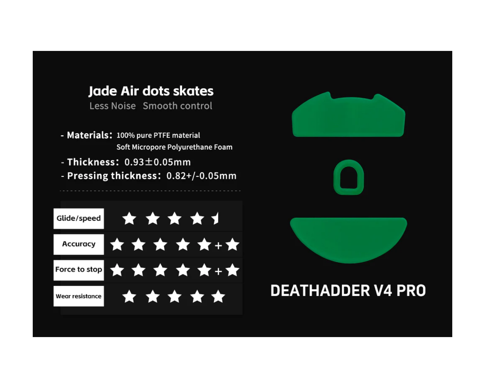 Jade Air Skates are a set of mouse skates from X-raypad designed for Razer Deathadder V4 Pro. These skates provide a smooth and silent control and are made of PTFE material, which offers a slick surface and precise fit that allows the mouse to move effortlessly. The skates are compatible with both cloth and plastic mouse pads, making them versatile for various usage scenarios.The choice of materials and build quality contributes to an enhanced user experience by minimizing noise levels during use. The stable and controlled glide facilitates precision in gaming as well as office work. The package includes two sets of skates, two alcohol pads, and two cleaning wipes for adhesive removal, making installation and maintenance easier.