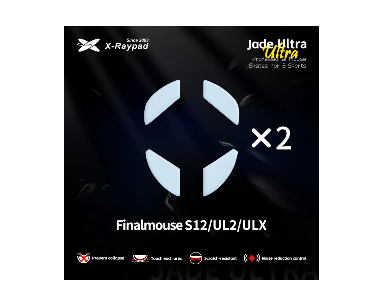 Jade Ultra Series Mouse Skates is a set of muscularly designed mouse feet from X-raypad, specifically designed for gamers and users of Finalmouse Ultralight 2, Starlight-12, and UltralightX (ULX). These mouse feet have a thickness of 1 mm (+/-0.1 mm) and are made of pure PTFE material that provides an extremely smooth surface for optimal glide. They also include an additional padding layer for improved sound and vibration dampening.Mouse skates are designed to prevent collapse and are scratch-resistant, contributing to durable and reliable performance. Their design ensures that they touch every area of the mouse foot, ensuring minimized friction and increased precision. These skates work well with both cloth and plastic mouse pads, but are not recommended for glass surfaces. The package includes two sets, giving the user the option to switch or replace as needed.