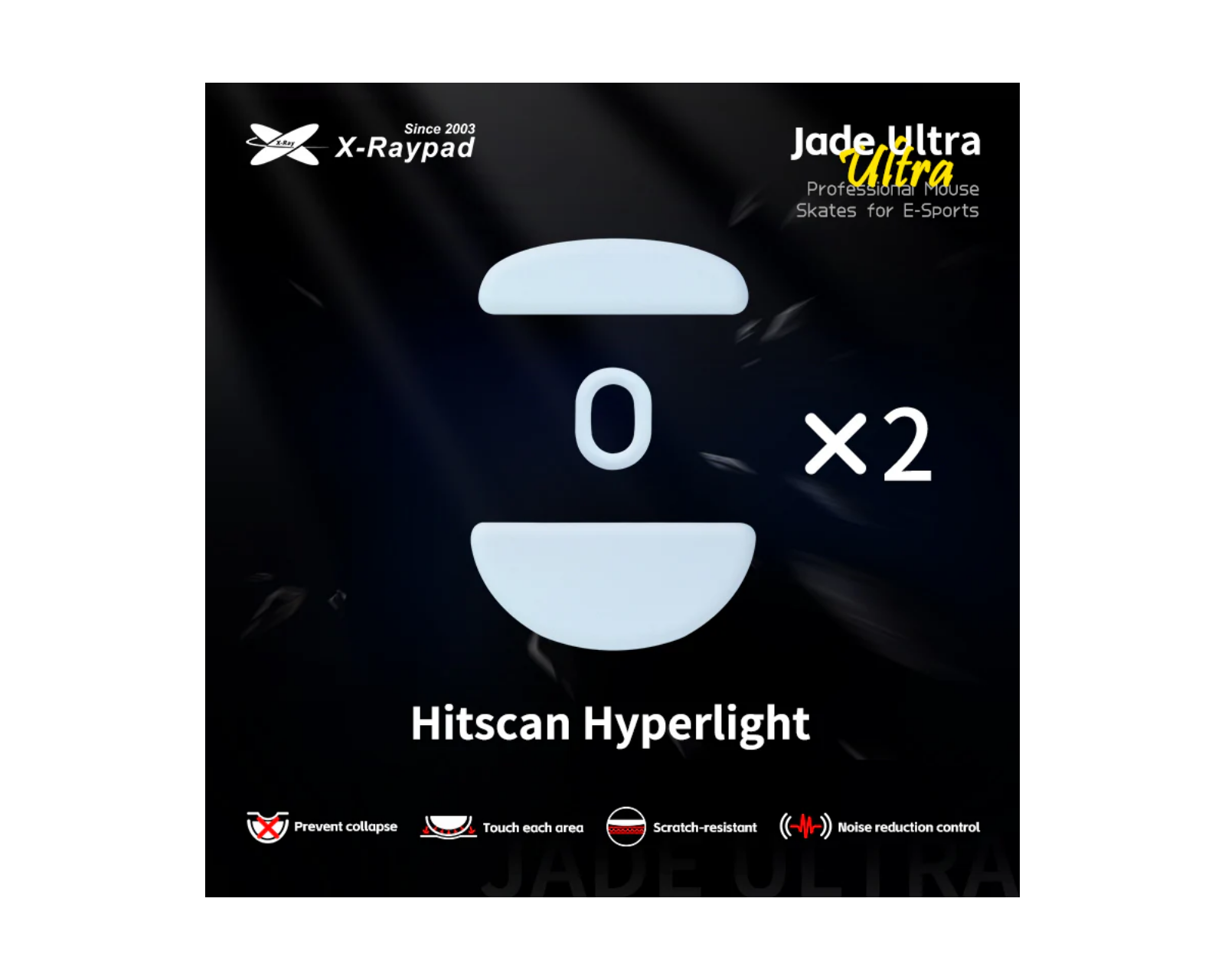 Jade Ultra Skates for Hitscan Hyperlight are non-slip mouse skates from X-raypad, designed to enhance the user experience during gaming. With a thickness of 1 mm (+/-0.1mm), these skates offer a smooth PTFE surface that allows the mouse to glide effortlessly over the surface. The product is developed for gamers who seek high precision and reduced friction, which is crucial during fast-paced gaming moments. The skates are adapted for both cloth and plastic mouse pads, providing flexibility and usage on different surfaces.Jade Ultra Skates are constructed with an extra anti-collapse moisture-conducting filling layer that helps prevent disintegration and filling of skates under heavy use. The surface is scratch-resistant and withstands wear, extending the lifespan. At the same time, the acoustic damping technology results in reduced noise and vibrations during use, increasing comfort and focus for the user.