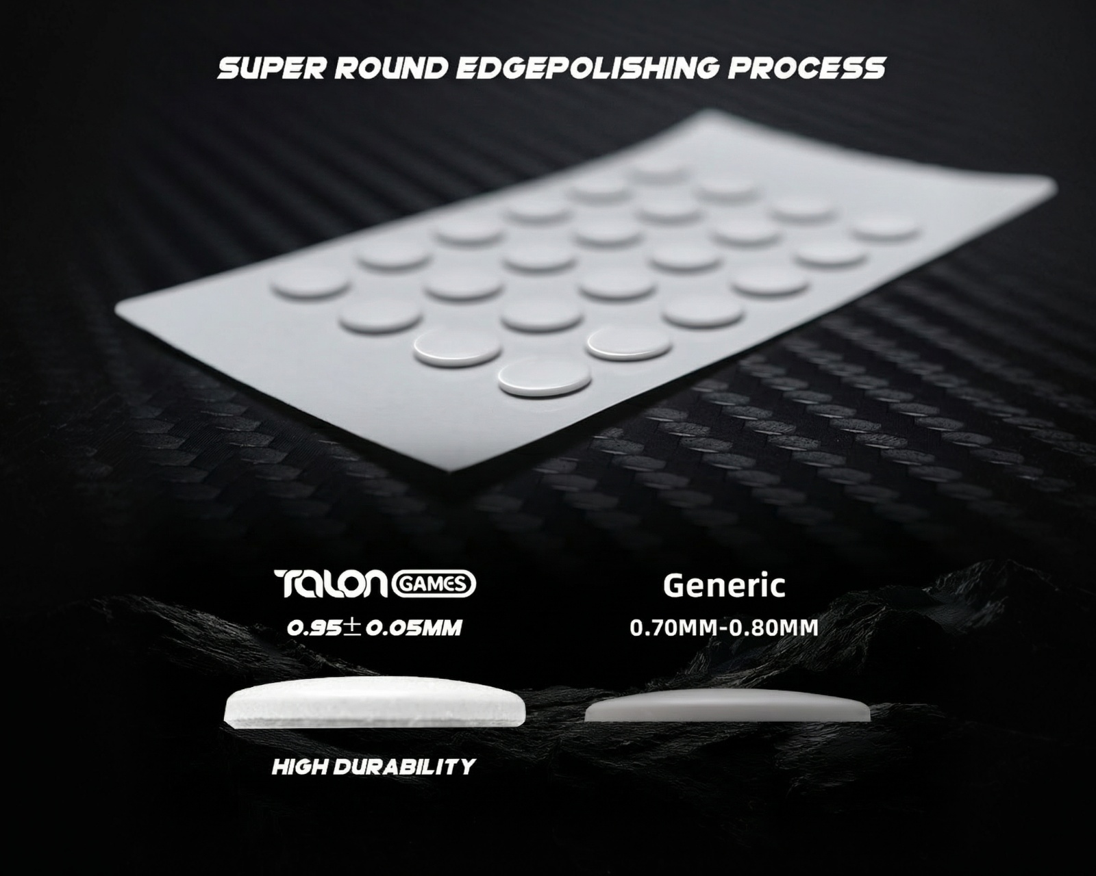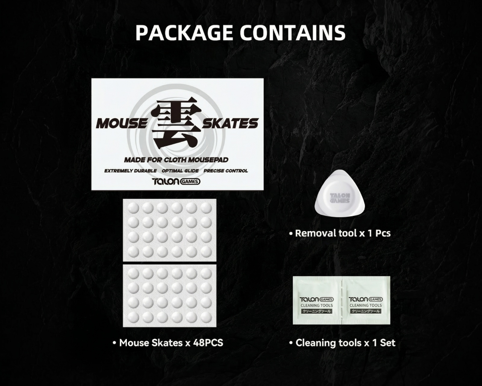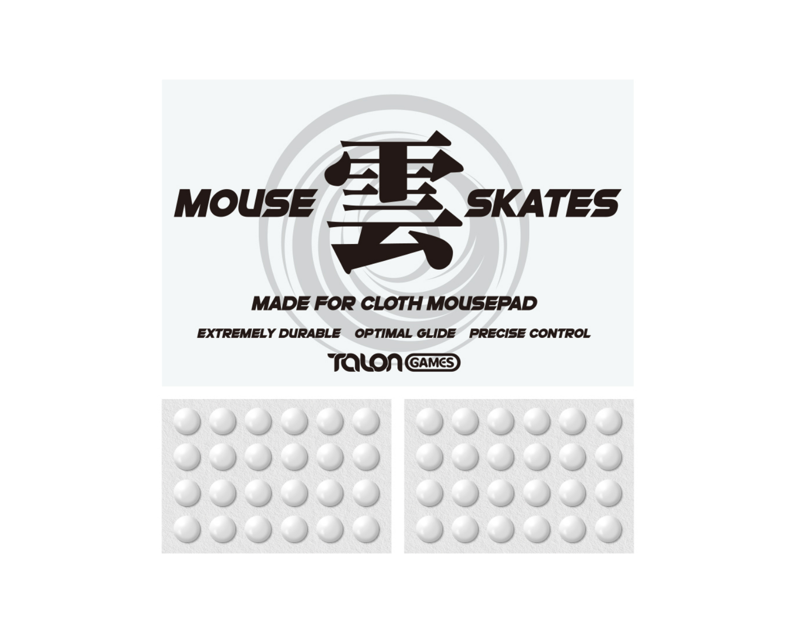 Kumo - Speed Mouse Skates from Talon Games, specially designed for use on cloth mouse pads. These skates offer extreme durability and optimal glide performance, ensuring precise control during gameplay. With a thickness of 0.95±0.05 mm, they provide a perfect balance between speed and stability.The product is made from reinforced PTFE material, which offers durability that surpasses traditional PTFE without affecting glide performance. The technology for sound and vibration reduction minimizes noise and vibrations during gliding, improving control. With the help of 3M adhesive, the skates are easy to install and remove without leaving any scratches or residue. Kumo - Speed Mouse Skates come with 48 skates and tools for installation and cleaning, making it easy to maintain your equipment.