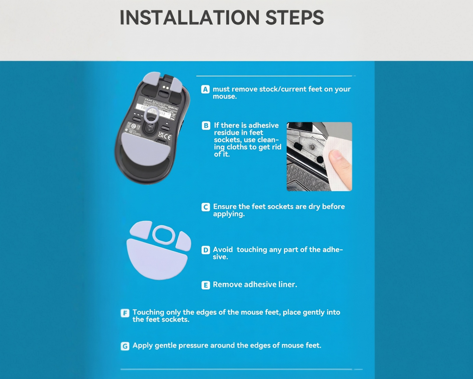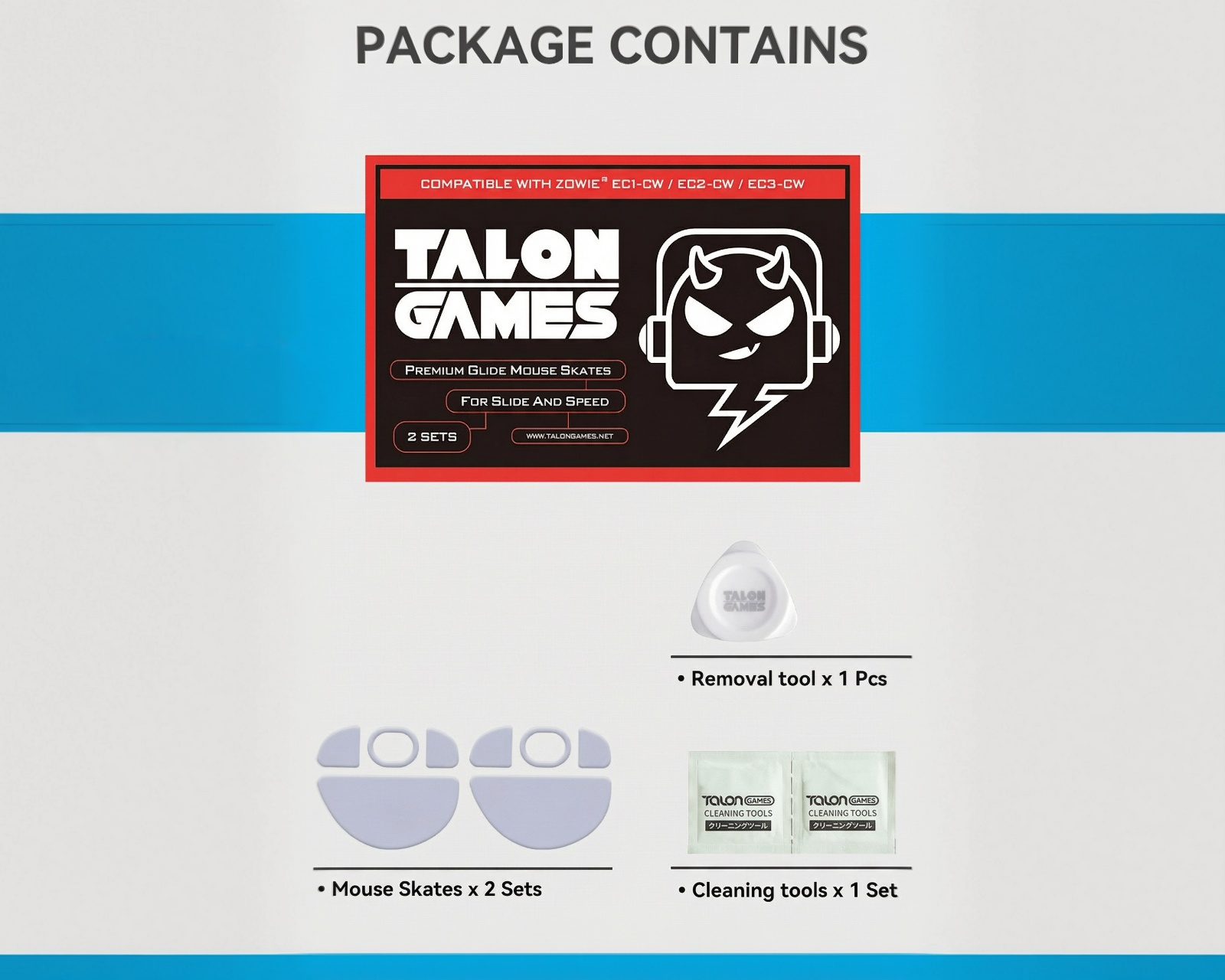 Mouse Skates from TalonGames provide a high-quality solution for increased precision and control during use. These mouse feet are made from a specialized Teflon material with a carefully calibrated thickness, providing smooth and consistent gliding. By replacing the original feet on your mouse, you can significantly improve your gaming ability.The product is made from 100% virgin PTFE material, which minimizes friction and is environmentally friendly. The rounded edges on each foot allow for durable gliding and easy installation with 3M adhesive to avoid residue. The well-balanced thickness has been calibrated with respect to the durability and accuracy of the mouse's sensor, which is important for players with different play styles. These feet also enhance the gaming experience by reducing grip tension and wrist strain during long sessions.
