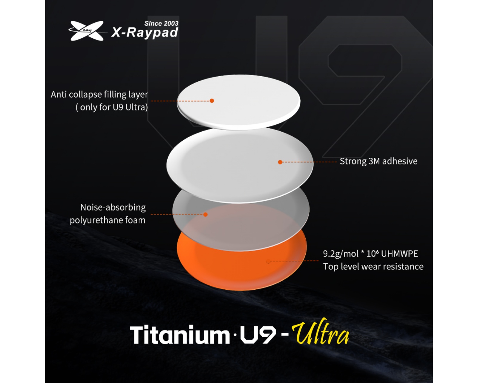 The U9 Ultra 8mm are dot skates from X-raypad, combining high durability with stable performance. These skates are optimized for glass surfaces and are also compatible with cloth mouse pads. Made of ultra-high molecular weight polyethylene (UHMWPE) in a multi-layer construction, they offer consistent aiming and ensure reliability with every move.The material is of the highest durability and provides a long life for use on various surfaces. The skates are designed to reduce wobbling movements and offer a stable and smooth experience for the gamer. Mobility is increased by the carefully crafted design that also includes a layer for noise reduction, which reduces sliding noise and allows the user to focus better on the game. U9 Ultra is especially adapted for glass surfaces but also works excellently on fabric surfaces.