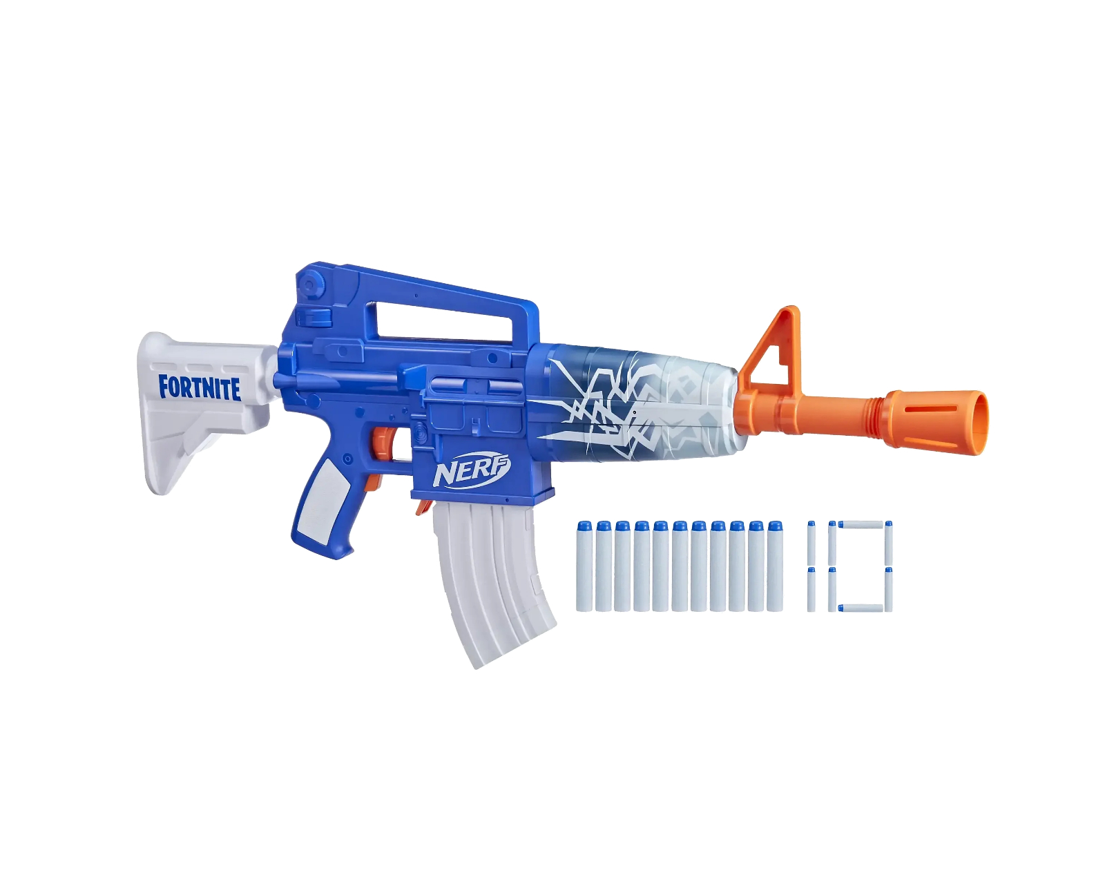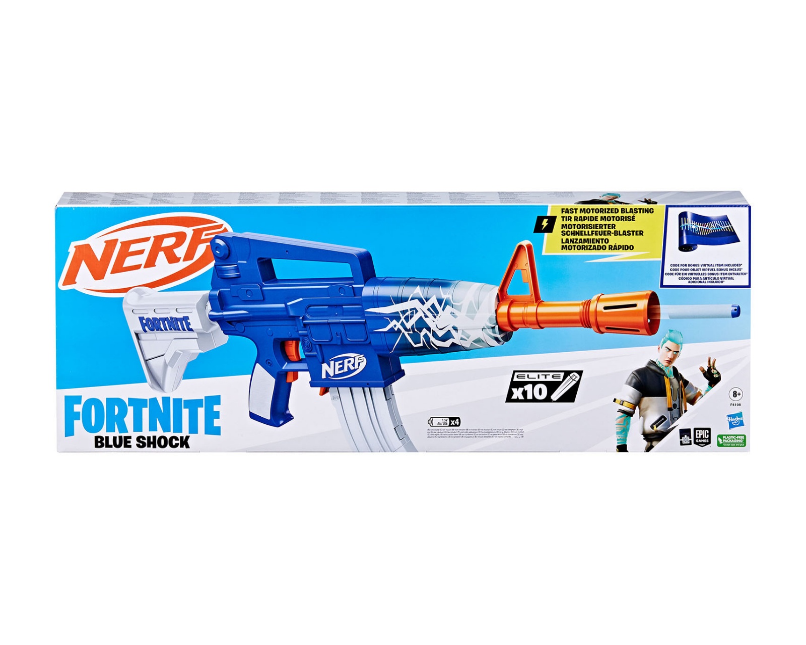 Nerf Fortnite Blue Shock is a motorized blaster based on the popular game Fortnite. It has a firing system that can shoot 10 darts in quick succession. The blaster comes with a removable magazine that holds up to 10 Elite foam darts and requires 4 AA batteries for operation. It is designed for both indoor and outdoor play and fits into a gamer's collection.The blaster construction is robust and practical for active use, with a focus on durability. The motorized mechanism provides rapid firing and allows for a smooth stream of shots. With a stylish Blue Shock Wrap design, the blaster is both aesthetically pleasing and functional. The included bonus code unlocks The Beat Wrap in the Fortnite game, allowing the user to customize their game character. Protective eyewear, which is not included, is recommended.