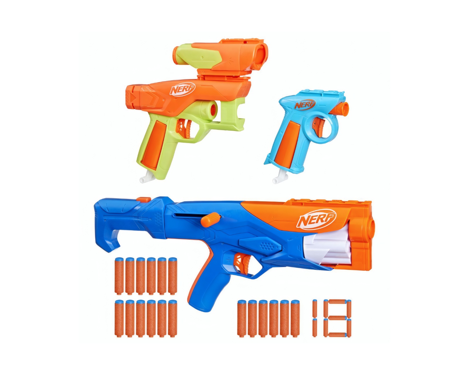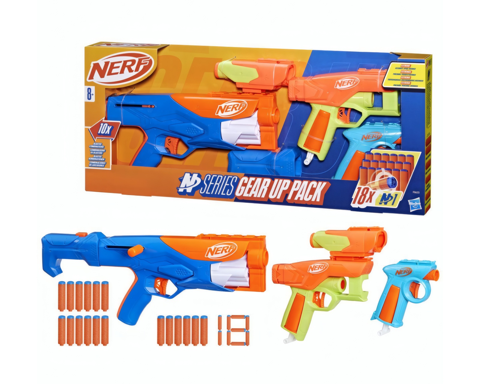 N-Series Gear Up Package is a gaming equipment pack from Nerf, which includes three different blasters and two accessories. The package offers the possibility to create up to ten unique blaster styles. The set includes 18 N1 foam darts and is intended for both indoor and outdoor play. The blasters feature a single-fire mechanism as well as a bolt-action mechanism for fast shot delivery.The blasters in the N-Series Gear Up Package have been built to ensure precise and optimized shots. The Flex and Dealer blasters use a pull-down firing system, while the Wielder blaster has a bolt-action mechanism that can fire up to four darts in succession. The included stock is designed to attach to two of the blasters, increasing stability and control during play. The sight can be used with all three blasters, improving accuracy. According to the manufacturer's instructions, only Nerf N Series N1 foam darts are compatible with these blasters.