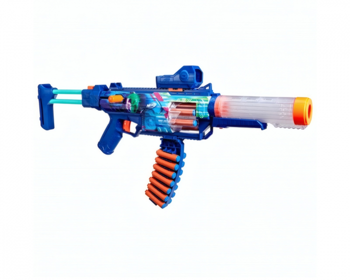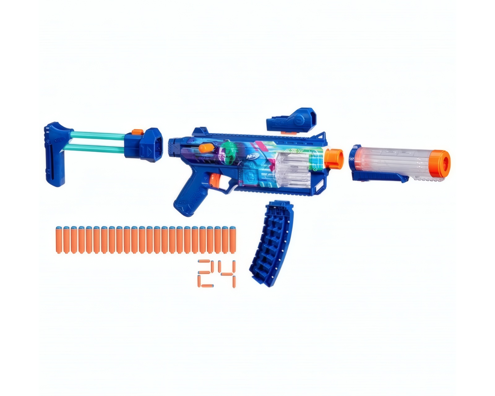 Nerf LoadOut Cyberlight Ghost is a bolt-action blaster from Nerf that offers customization options with over 1000 combinations of interchangeable parts. This blaster is designed for gamers seeking a dynamic and safe experience in their blaster battles. The LED-based lighting system illuminates the barrel and cylinder to provide a unique visual effect during use.The Cyberlight Ghost blaster is constructed with a rotating cylinder that holds 6 NERF N1 darts, contributing to fast and efficient firing. It features a piston and barrel, as well as a storage compartment for darts, making handling and storage easier. The bolt can be mounted on both sides of the blaster, allowing for use by both right- and left-handed gamers. NERF N1 darts are specifically designed to provide high precision, speed, and range and are only compatible with NERF N1 dart blasters.