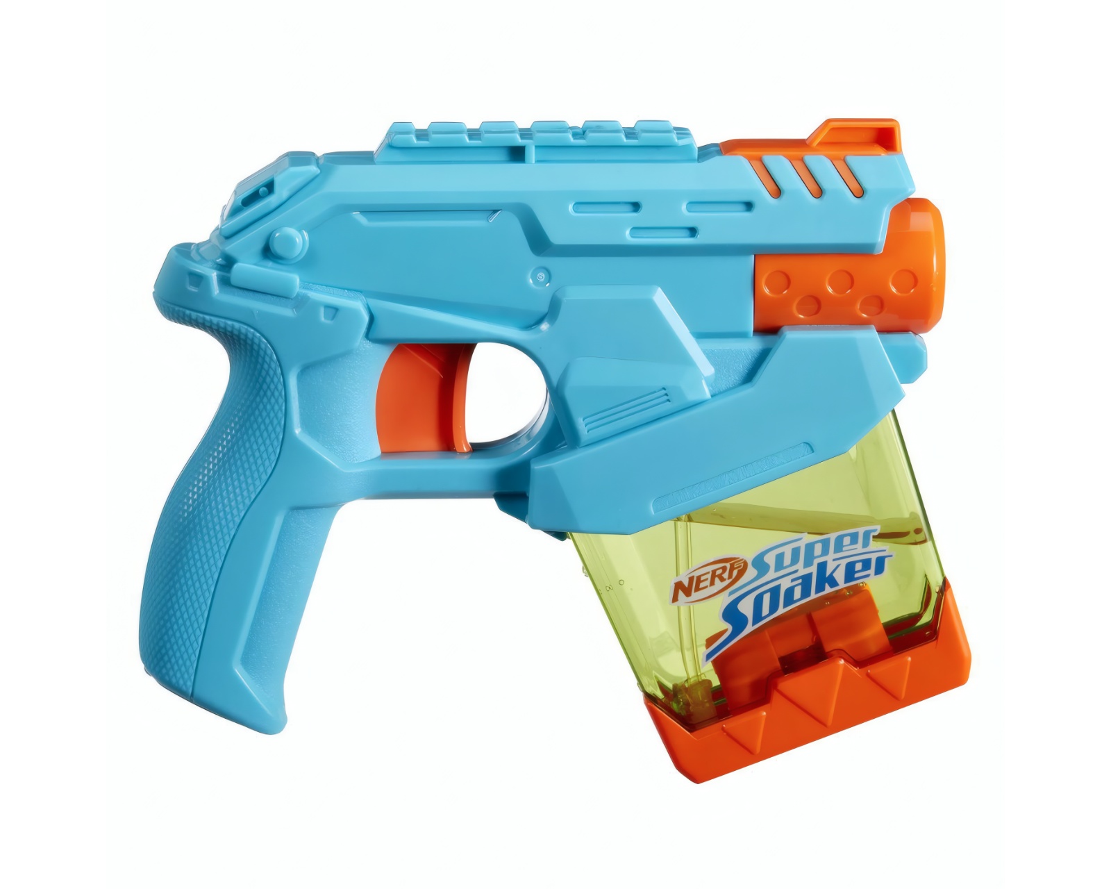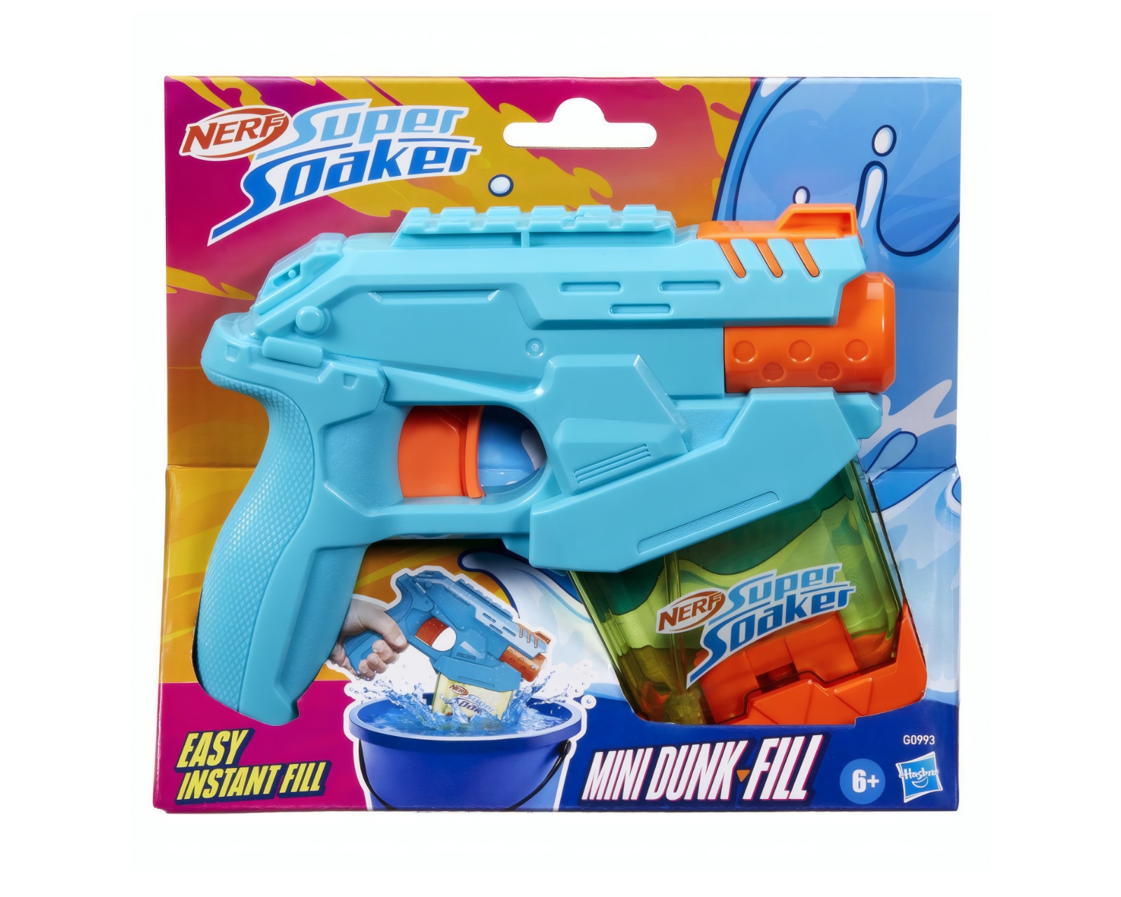 Super Soaker Dunk Fill Mini is a water blaster from Nerf that offers quick refilling for instant water fun. It has a capacity of 100 ml and a transparent tank design for easy refilling and visual control. It is intended for outdoor activities and water play, making it ideal for children seeking fun and active play.This water blaster is designed with user-friendliness in mind. To fill the tank, the user simply submerges it in water, and it fills up instantly. This fast system ensures that playtime is not interrupted. The transparent tank is practical for seeing when it is time to refill, minimizing the risk of unexpected interruptions during play. To fire the water stream, the user simply presses the trigger.