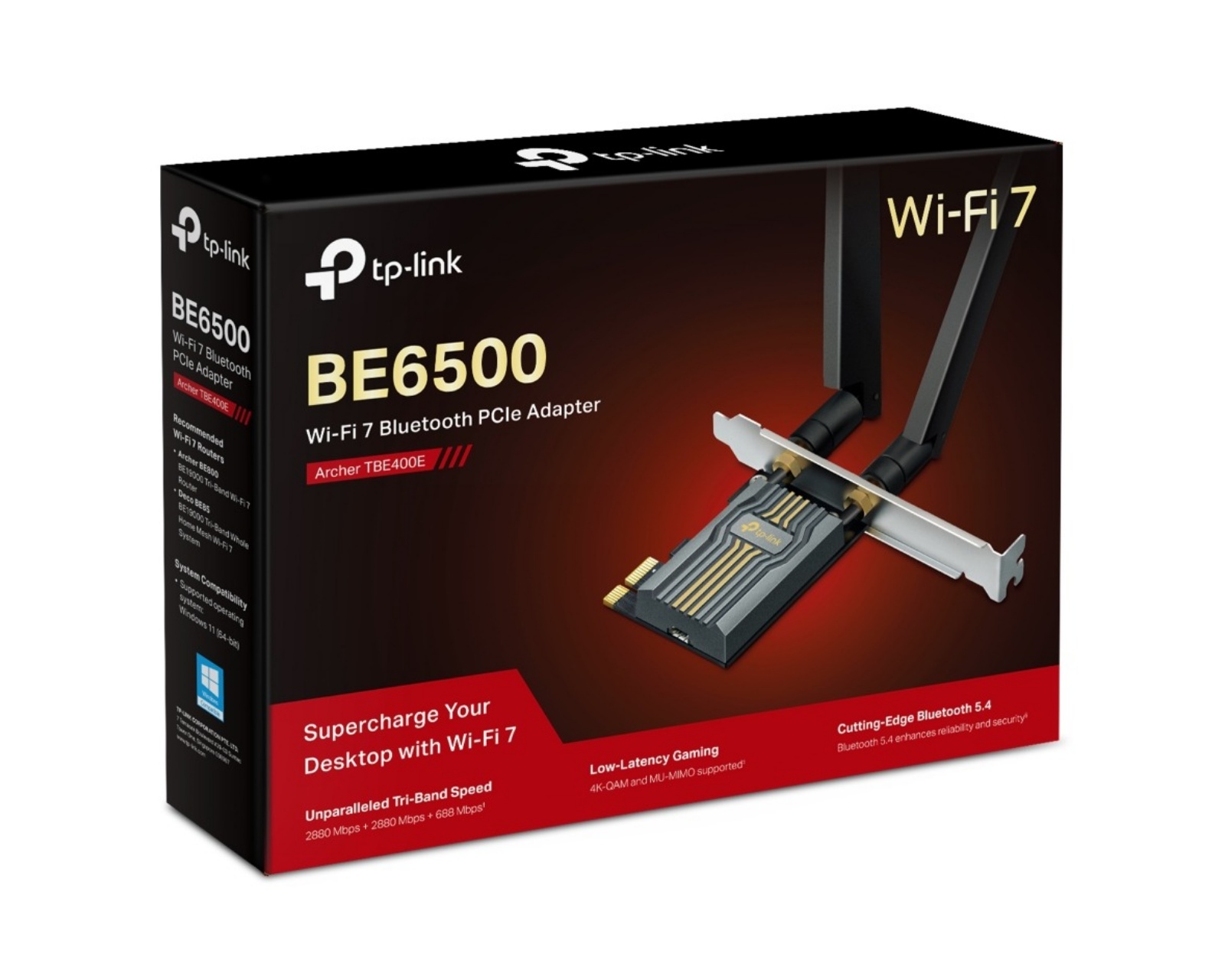 An adapter from TP-Link, designed to provide fast and stable internet connection. With an impressive speed of up to 2882 Mbps on both 6 GHz and 5 GHz bands, as well as 688 Mbps on 2.4 GHz, an efficient connection for all your devices is ensured.The build quality of the adapter is highlighted by the two powerful high-frequency antennas that provide enhanced signal strength and extended Wi-Fi coverage. OFDMA and MU-MIMO technology minimize latency and allow multiple devices to communicate with the router simultaneously, which is particularly beneficial for gamers and streaming. With the latest WPA3 security technology, your network information is effectively protected from intrusions. The adapter is also equipped with a low-profile bracket, making it fit into compact computer chassis, and installation is smooth thanks to user-friendly software installation.