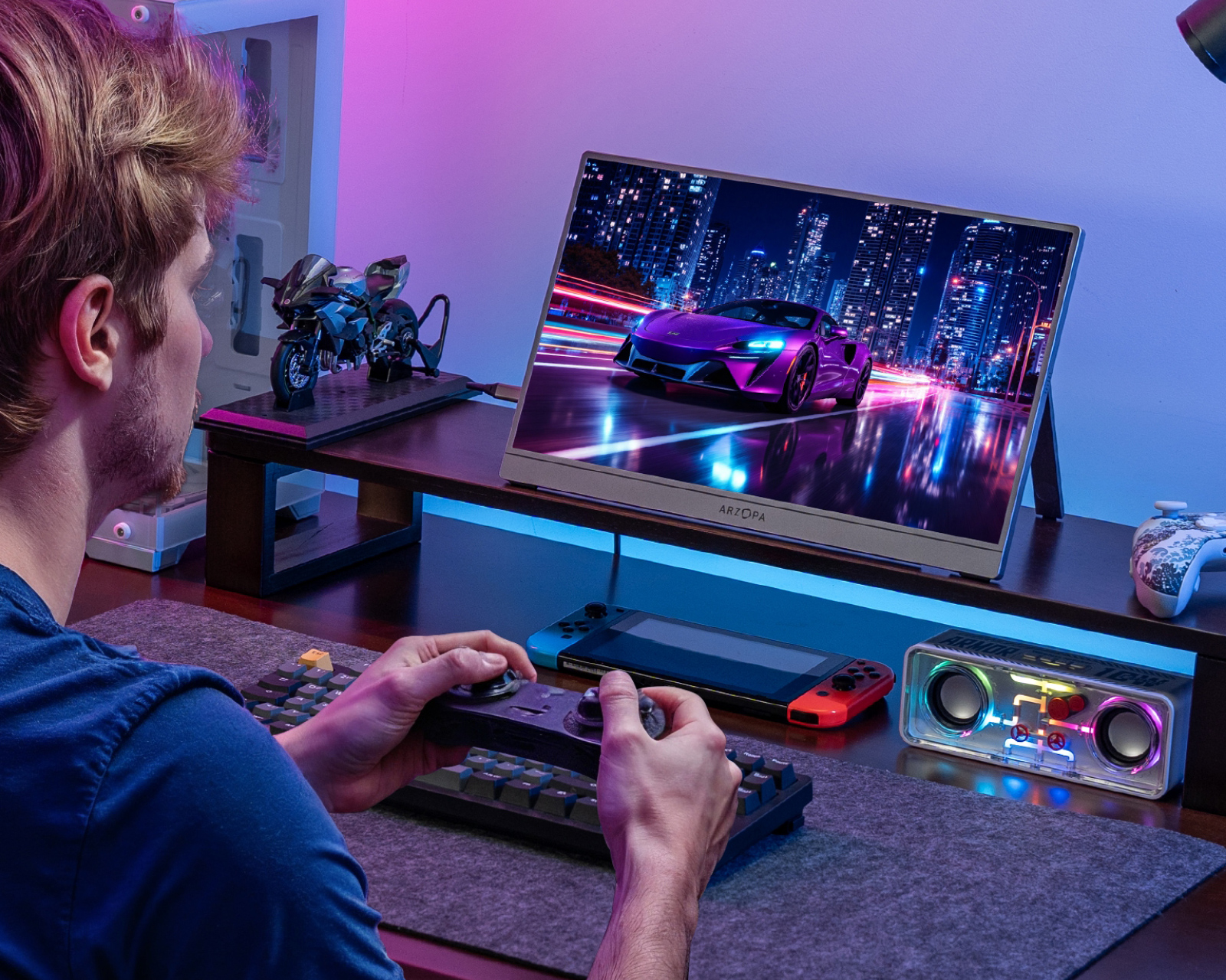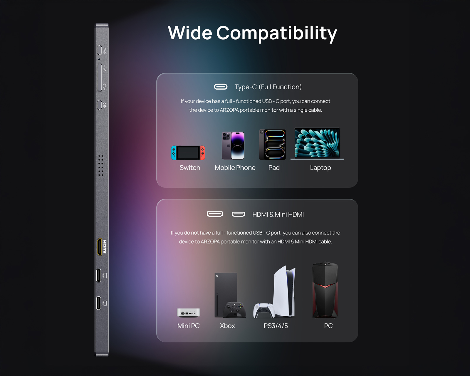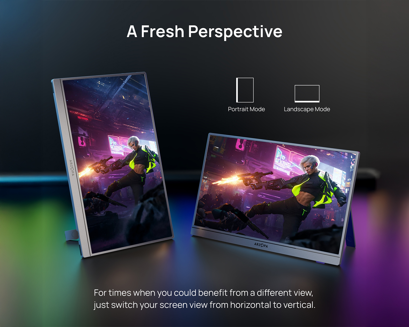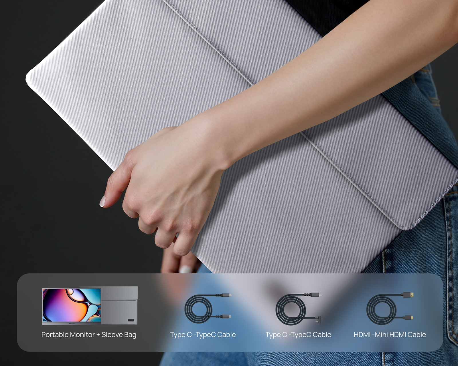 Z3FC 16.1" 180Hz QHD is a portable monitor from Arzopa that combines mobility with high performance. The 16.1-inch IPS screen offers an impressive WQHD resolution of 2560x1440 and a refresh rate of 180 Hz, ensuring smooth image reproduction and sharp details. With two USB Type-C ports with DisplayPort and power delivery, as well as a Mini HDMI 2.0 port, you get flexible connectivity options for your devices.The monitor is designed for gamers who need high-quality visuals, no matter where they are. Thanks to the color gamut of 107% sRGB and a contrast ratio of 1000:1, users can enjoy vibrant colors and high image quality. It also features low blue light and flicker-free technology to reduce eye strain during long gaming sessions. With a brightness of 400 nits, 2x 1W stereo speakers, and an integrated kickstand with portrait mode, this monitor is practical and customizable.