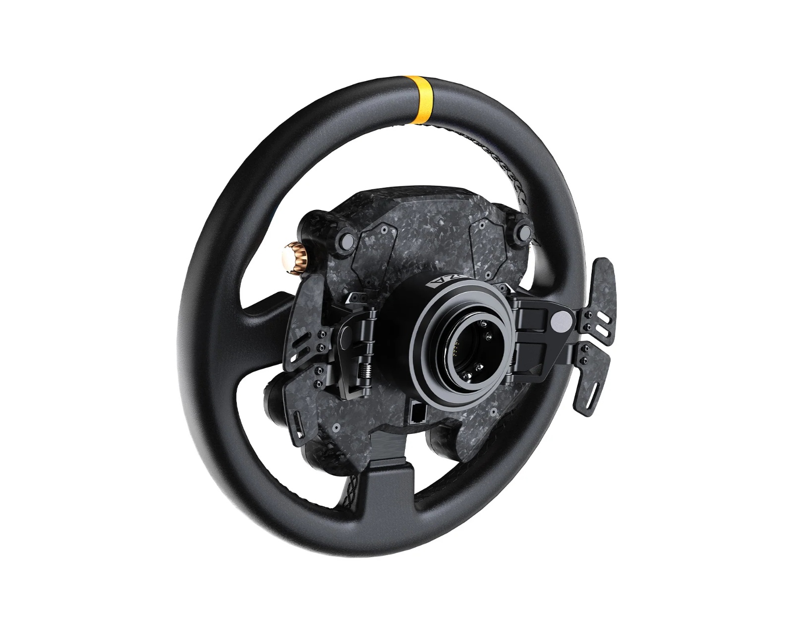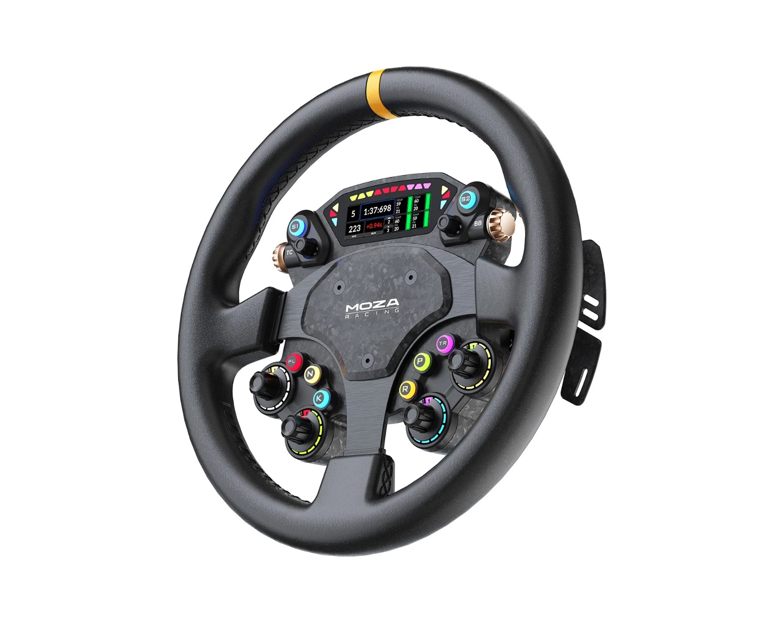 CS Pro Wheel is an advanced racing wheel from Moza Racing, designed for serious gamers seeking the highest possible performance and adaptability. The 325 mm wheel features a unique GT3 hub design that combines durability and comfort through hand-stitched, eco-friendly microfiber leather. With a 2.99 inches high-definition screen and UI customization options via MOZA Pit House software, users can create a tailored dashboard that meets their needs.The wheel is made of carbon fiber reinforced composite material that minimizes weight and maximizes performance through fast and accurate force feedback. It includes magnetic paddle shifters made of forged carbon fiber with Hall sensors, offering flexible usage as dual or single switches. The fully customizable lighting system includes 10 RGB rev lights and 6 flag lights, providing real-time data and signals that reflect real motorsport. Additionally, the wheel comes with an all-aluminum quick release for quick and secure wheel changes.