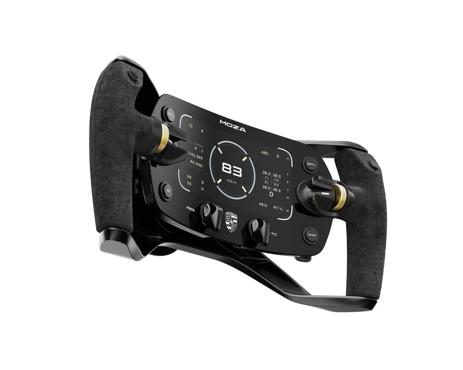 Porsche MISSION R Simracing Wheel is an advanced racing wheel from Moza Racing, designed for enthusiasts and gamers seeking an authentic and performance-oriented feel. With a sleek and robust CNC-machined aluminum frame, this wheel offers exceptional strength and stability. It features a 5.4-inch flexible OLED display with 720P resolution that provides real-time data on speed, lap times, and much more.The wheel is characterized by its grips, which are covered with a premium faux-suede material for optimal comfort and control. The built-in 1.3 GHz quad-core processor enables fast rendering with minimal latency, creating a seamless and responsive user experience while racing. With the flexibility of an open ecosystem, this wheel can easily connect to various sim-racing bases and be used in a wide range of racing applications. It also has a customizable UI system to allow individual customization of dashboards and displays.