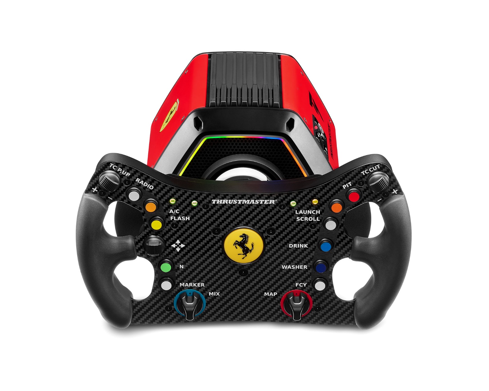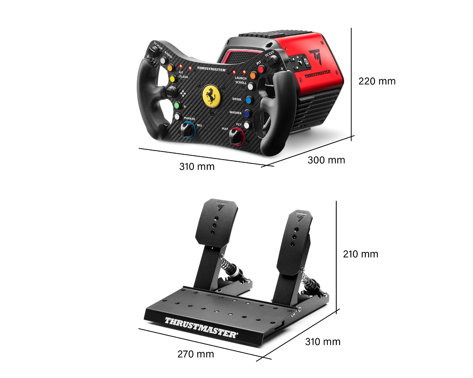 T818 Ferrari 488 GT3 Simulator is a racing package that combines advanced technology with official licensing from Ferrari. It consists of the T818 Direct Drive base, Ferrari 488 GT3 steering wheel, and Raceline Pedals LTE pedal set, making it ideal for serious gamers seeking an authentic racing experience. The T818 base delivers a constant torque of 10 N·m with exceptional responsiveness, providing immediate feedback and feel. The robust construction of the new T818 base implies an enhanced coupling and optimized motor for increased reliability.Along with the My Thrustmaster Panel software, users can customize Force Feedback and save their settings for a tailored gaming experience. The included Ferrari 488 GT3 steering wheel is a life-size replica of high quality, equipped with 11 buttons, 4 encoders, a D-pad, and Mag-Shift paddle shifters for quick and precise gear shifting. The Raceline Pedals LTE pedal set also offers air pressure and adjustable construction, allowing users to fine-tune their settings to match their driving style.