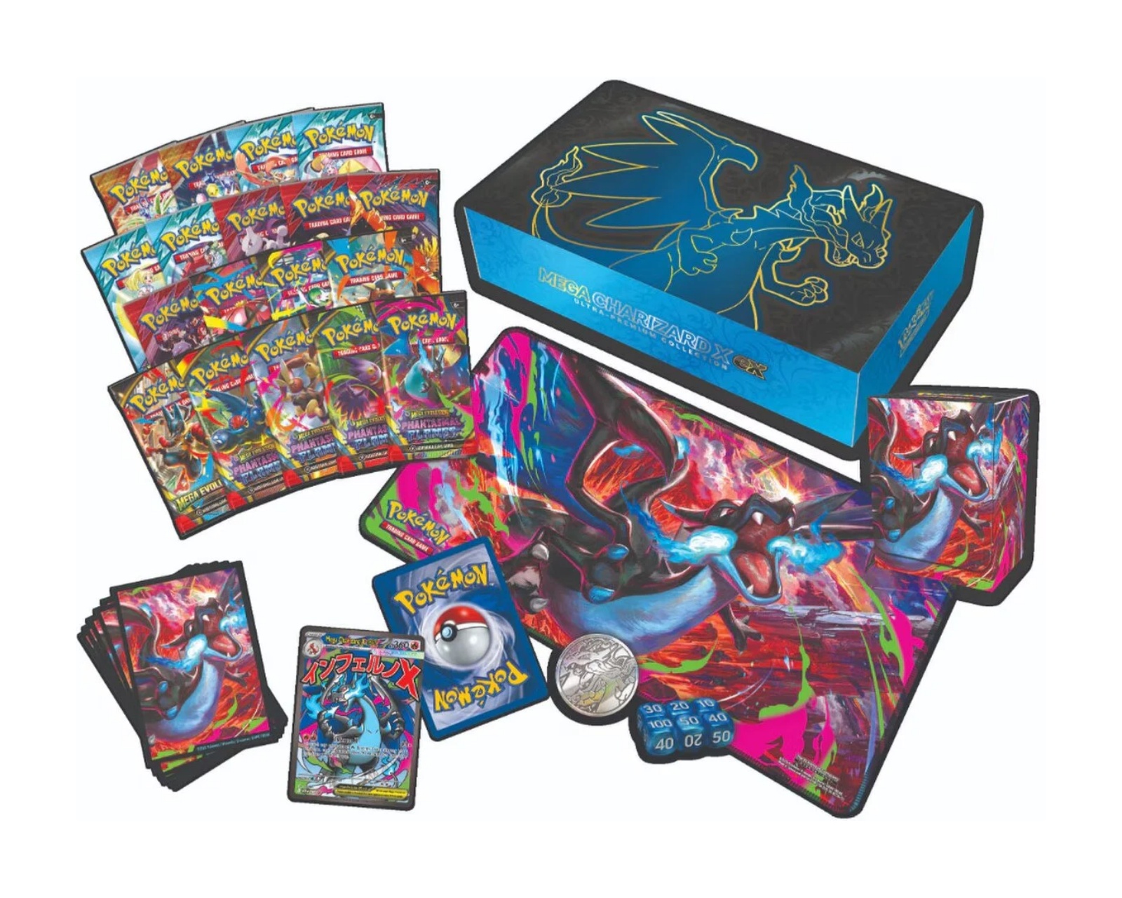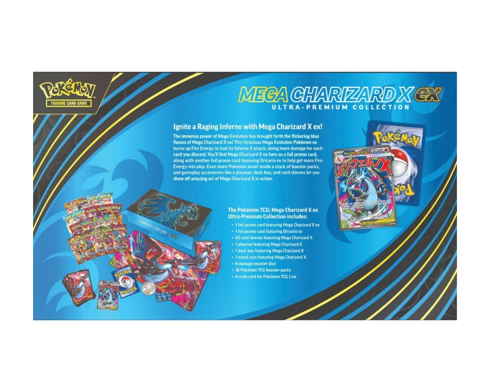 Mega Charizard X ex Ultra-Premium Collection is a product from Pokémon that offers a range of special cards and accessories for the collectible card game. The collection includes a foil promo card featuring Mega Charizard X ex and a foil promo card featuring Oricorio ex, as well as various game accessories. The contents of the box include 65 card sleeves adorned with illustrations of Mega Charizard X, a playmat with the same motif, a card box, a metal coin, and six damage-counter dice.Additionally, it comes with 18 booster packs, providing the opportunity to expand the collection. The quality of the cards is standard for Pokémon cards, and all cards are designed to protect the player and provide a unique gaming experience. The collection is designed to support both collecting and playing, making it ideal for both beginners and experienced gamers.