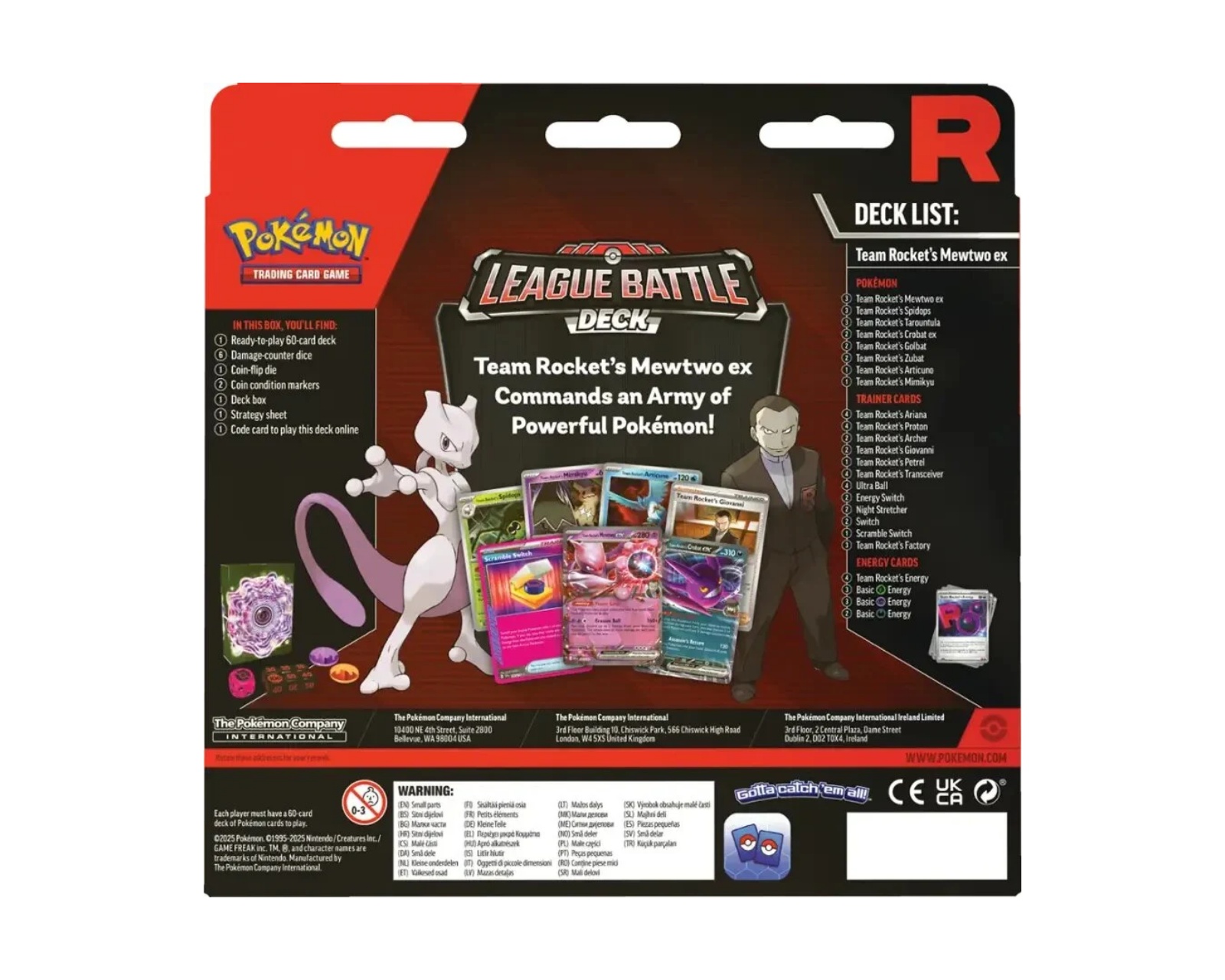 Team Rocket's Mewtwo ex League Battle Deck is a collectible card deck from Pokémon that includes a ready-to-play 60-card deck, designed for quick and easy gameplay. The package includes six damage-counter dice and a coin flip die, which facilitate the game's mechanics. The product title targets gamers and enthusiasts of collectible card games, and all components are designed to provide a complete gaming experience.The contents of the box also include two coin condition markers and a specially designed card box for safely storing the cards. Additionally, a strategy sheet is included that provides guidance on how to play the deck, as well as a code card that allows for online play with the specific deck included. Each component is designed for optimal play, making it easy for gamers to start playing right away.