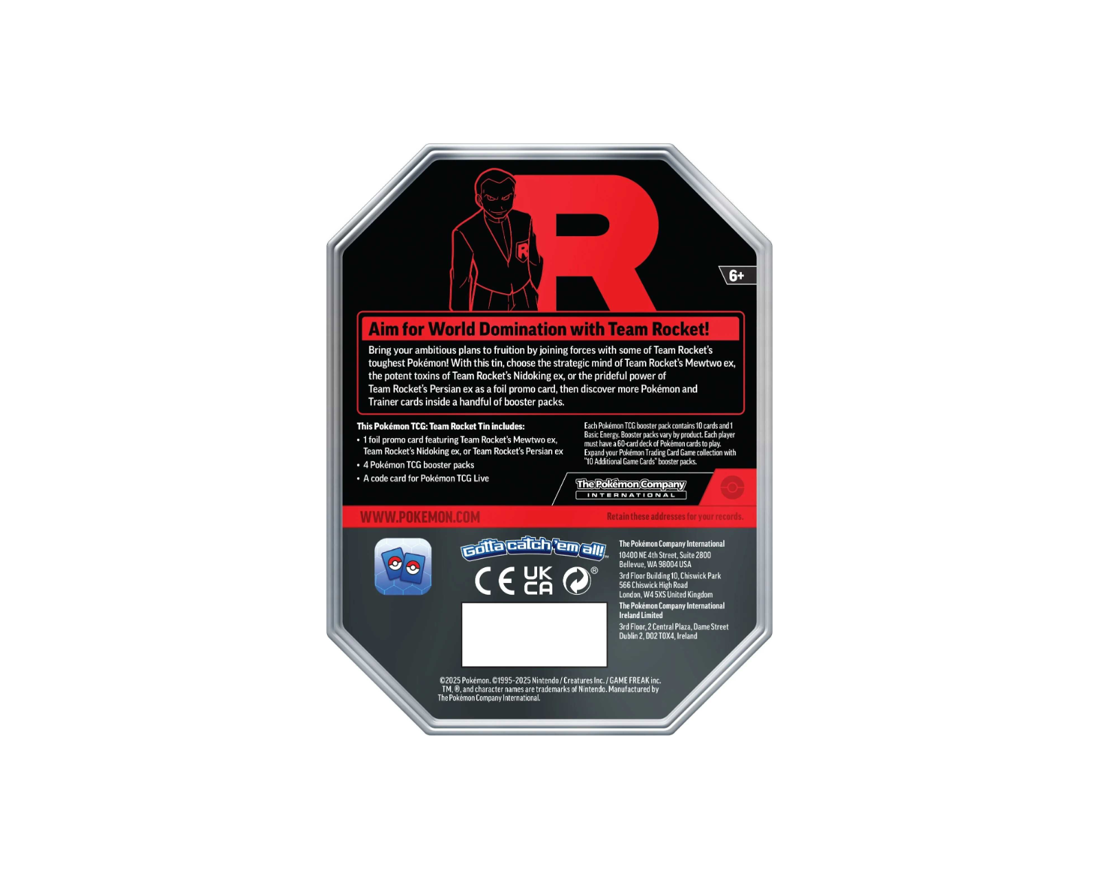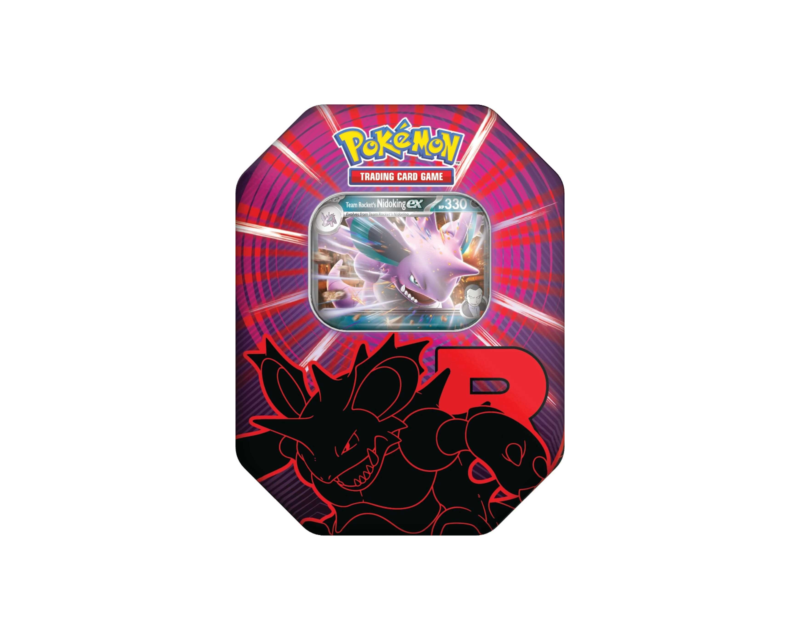 Pokémon TCG: Team Rocket Tin is a storage box for cards in the Pokémon Trading Card Game, from the manufacturer Pokémon. This box contains one of three possible foil promo cards, including Team Rocket's Mewtwo ex, Team Rocket's Nidoking ex or Team Rocket's Persian ex. It is aimed at collectors and players who want to expand their card collection and strategically use these powerful Pokémon. The box also contains four booster packs with more Pokémon and Trainer cards and a code for Pokémon TCG Live.The box is made of durable material that provides good storage for cards. Each tin is designed to protect the contents from damage, with a mechanism that ensures a secure closure. Booster packs have various cards that can include rare and valuable cards that can enhance a player's game. In addition, the included code is useful for unlocking content online, offering a digital dimension to the game.