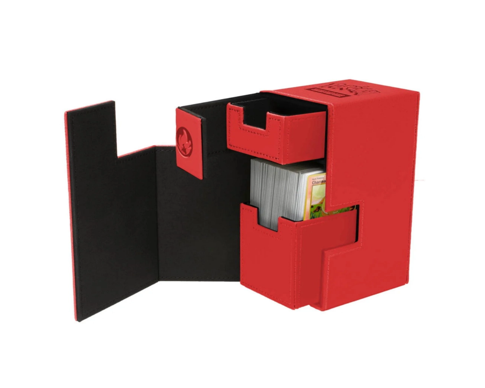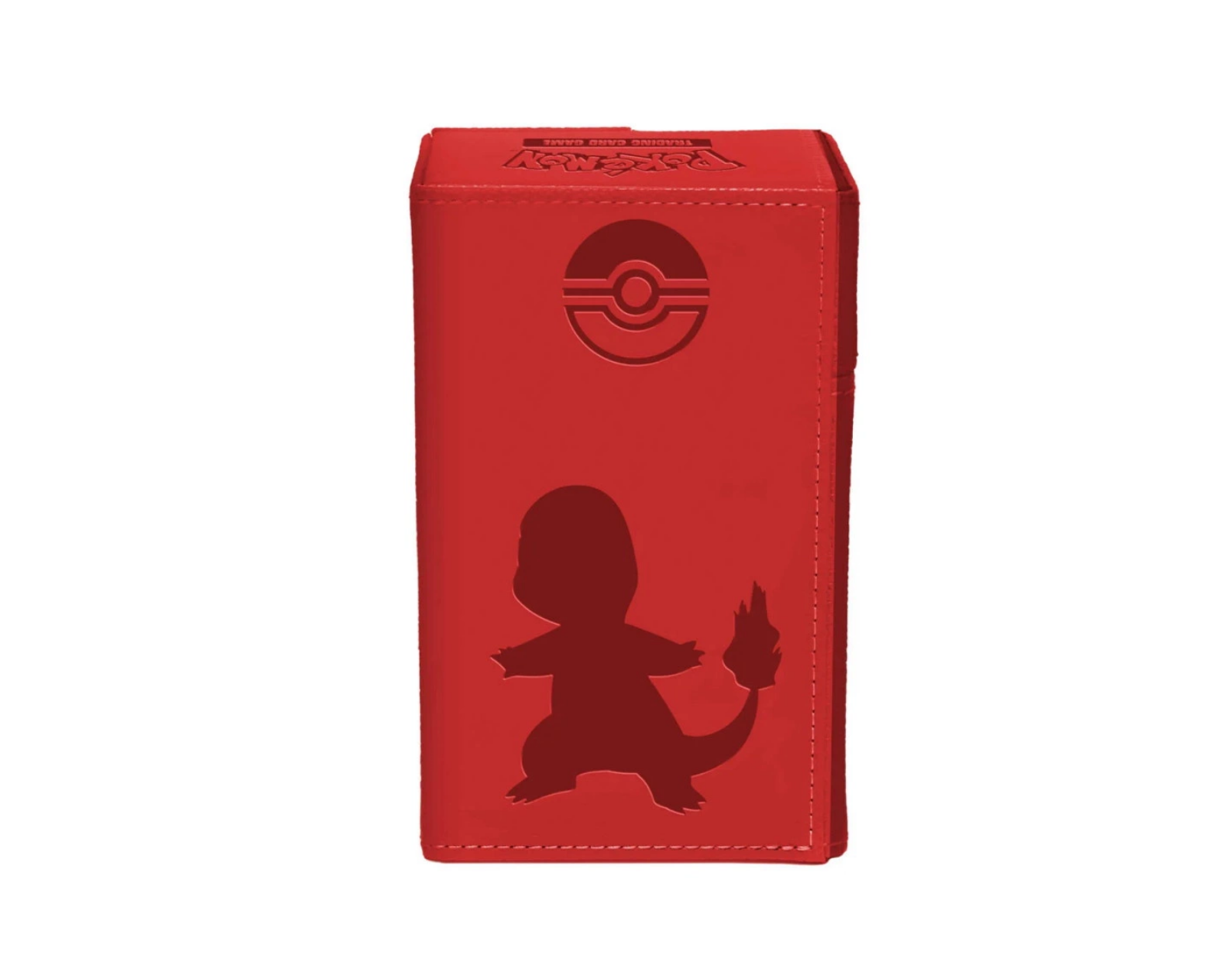 The Ultra Pro Charmander M2 Deck Box is a storage box for collectors of the Pokémon Trading Card Game. It offers a stylish design with an embossed Charmander illustration in red. Made of matte imitation leather and equipped with a magnetic closure, it provides security for the cards. The main compartment has a capacity for up to 75 standard double-sleeved cards.A pull-out drawer for dice, markers, and other accessories makes it easy to organize game items.