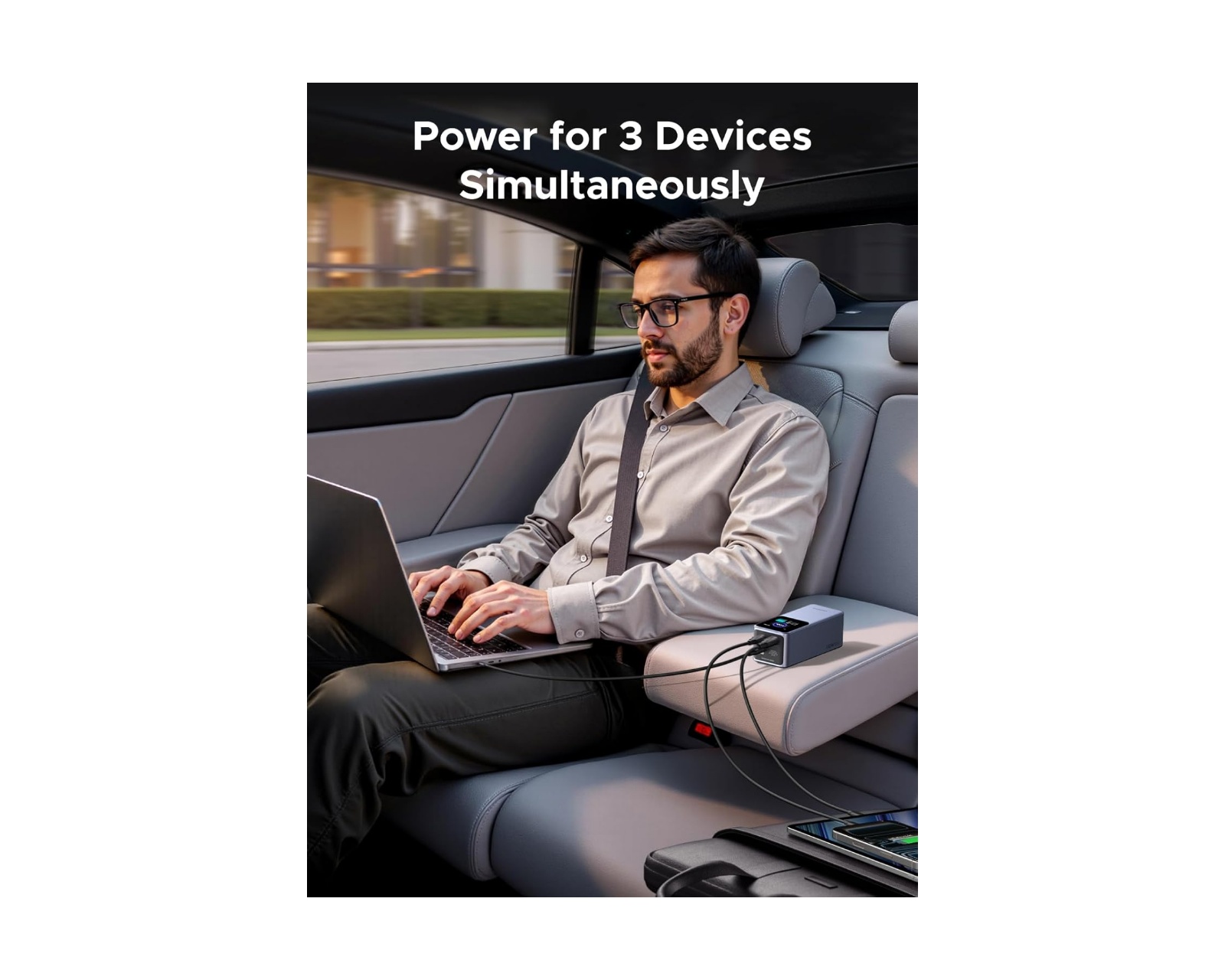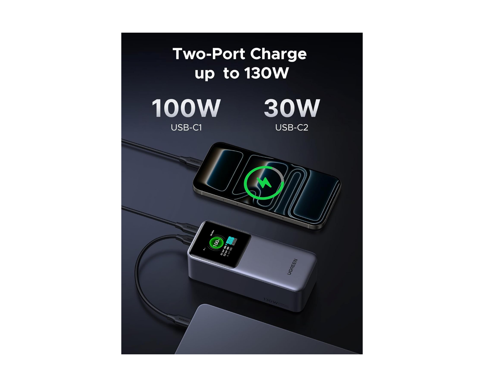 Power bank with fast charging that has an impressive capacity of 130W and 20000 mAh, making it perfect for keeping your devices charged throughout the day. It has two USB-C ports and one USB-A port, so you can charge multiple devices at the same time. In addition, it is equipped with a TFT screen that shows the current battery level and charging status, giving you a clear overview of how much energy is left.The lightweight design of the power bank makes it ideal for both travel and daily use. With its compact size, you easily find room to take it wherever you go, making it the perfect companion for both business trips and leisure adventures. Whether you're on your way to work, on a weekend trip, or just need to charge your device during the day, this power bank offers a practical and convenient solution to keep your devices charged and ready to go.