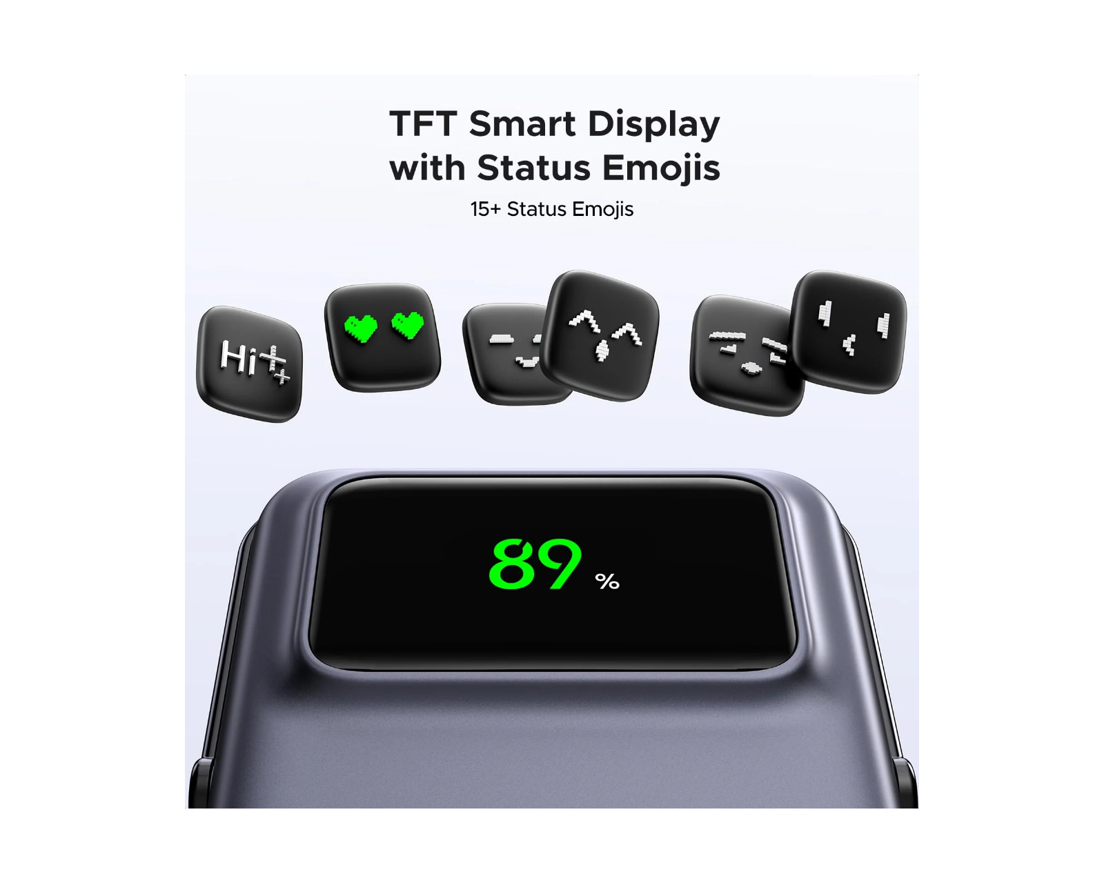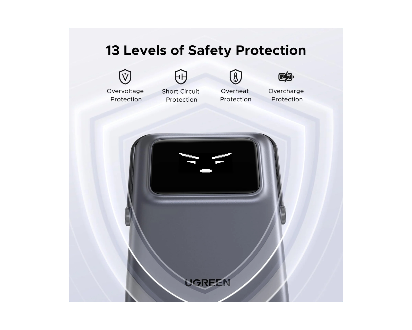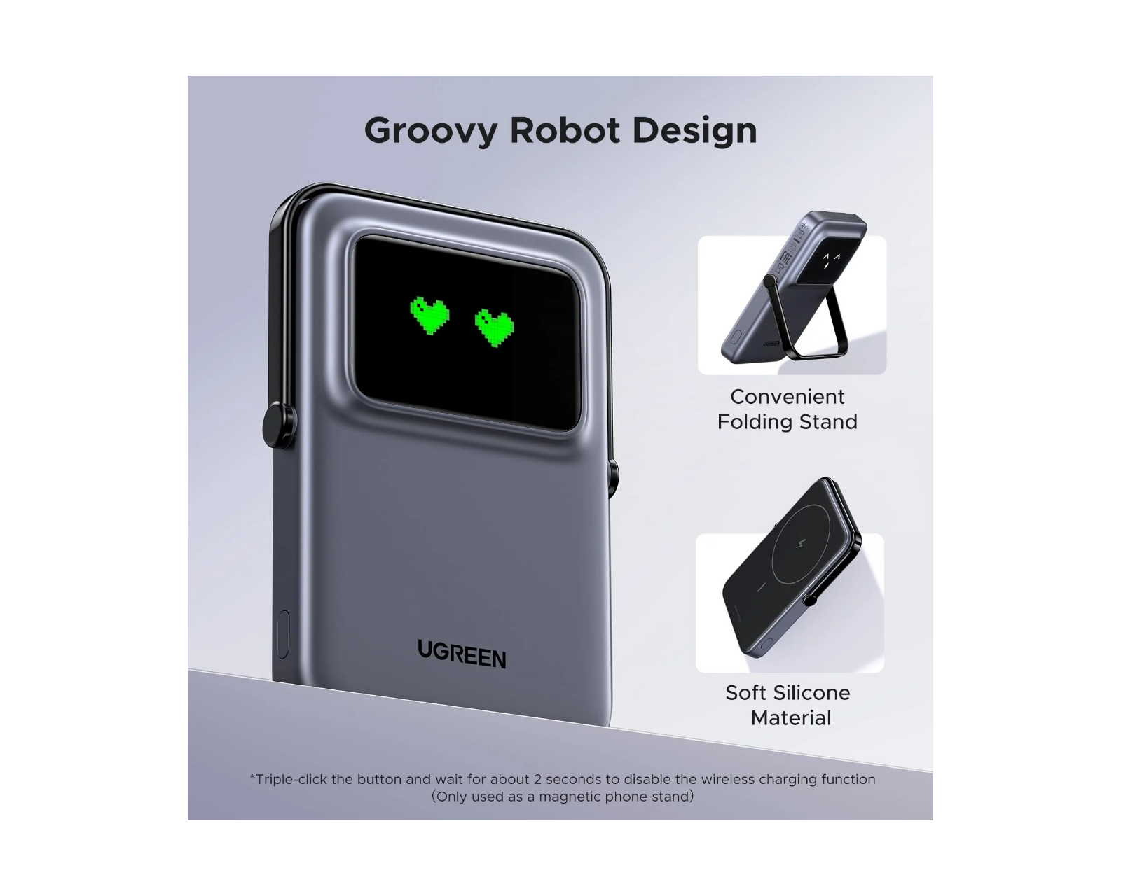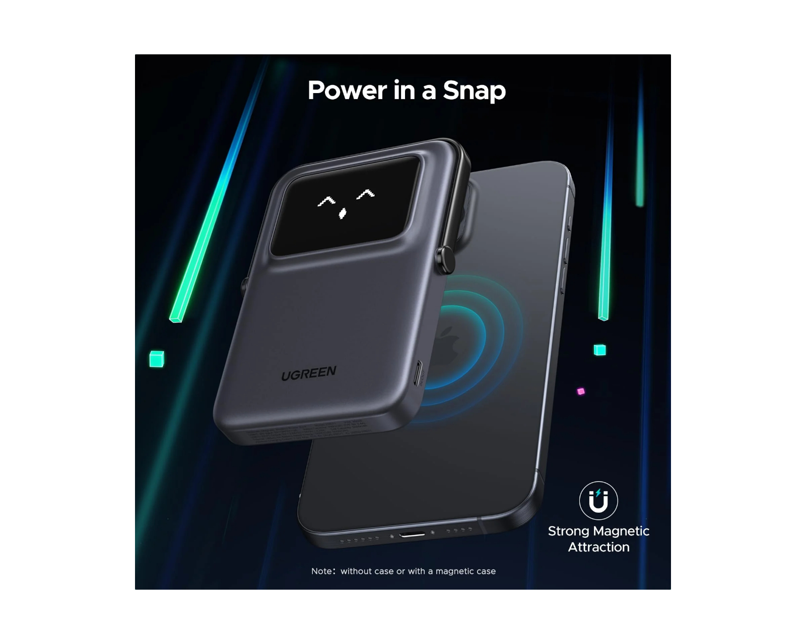 Uno 5000mAh Magnetic Wireless Powerbank is a powerbank from UGREEN that offers 20W efficient charging and wireless charging with magnetic function capability. With a battery capacity of 5000mAh, it is suitable for charging various devices efficiently. The powerbank is also equipped with a smart display that shows status through emojis. It is designed for both everyday and more demanding uses.The power bank has a USB-C input/output, which supports 5V/3A, 9V/2.22A, and 12V/1.5A, and a maximum output of 20W. In addition, it has wireless charging with an output of 7.5W. With multiple protection functions against overcharging, overdischarging, overcurrent, overpower, overvoltage, overtemperature, short circuit and electromagnetic fields, the device is both safe and reliable.