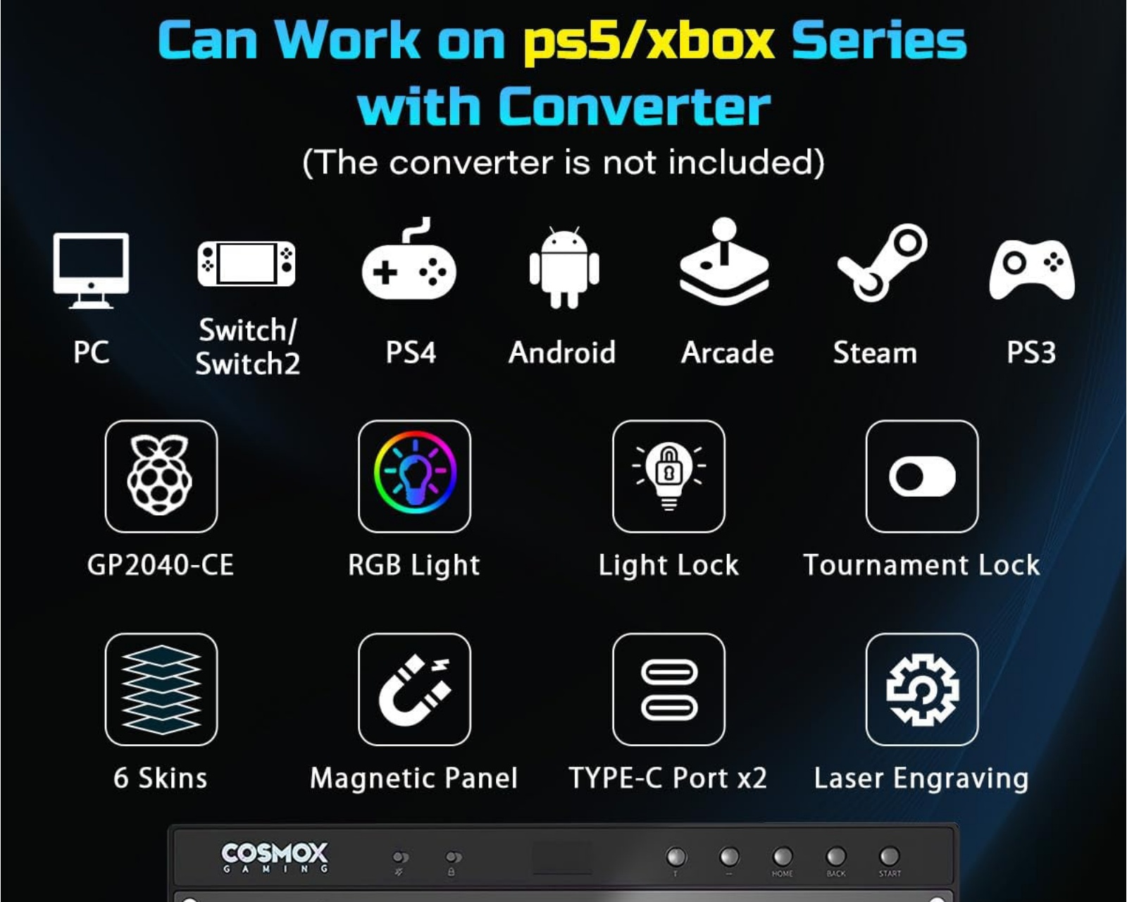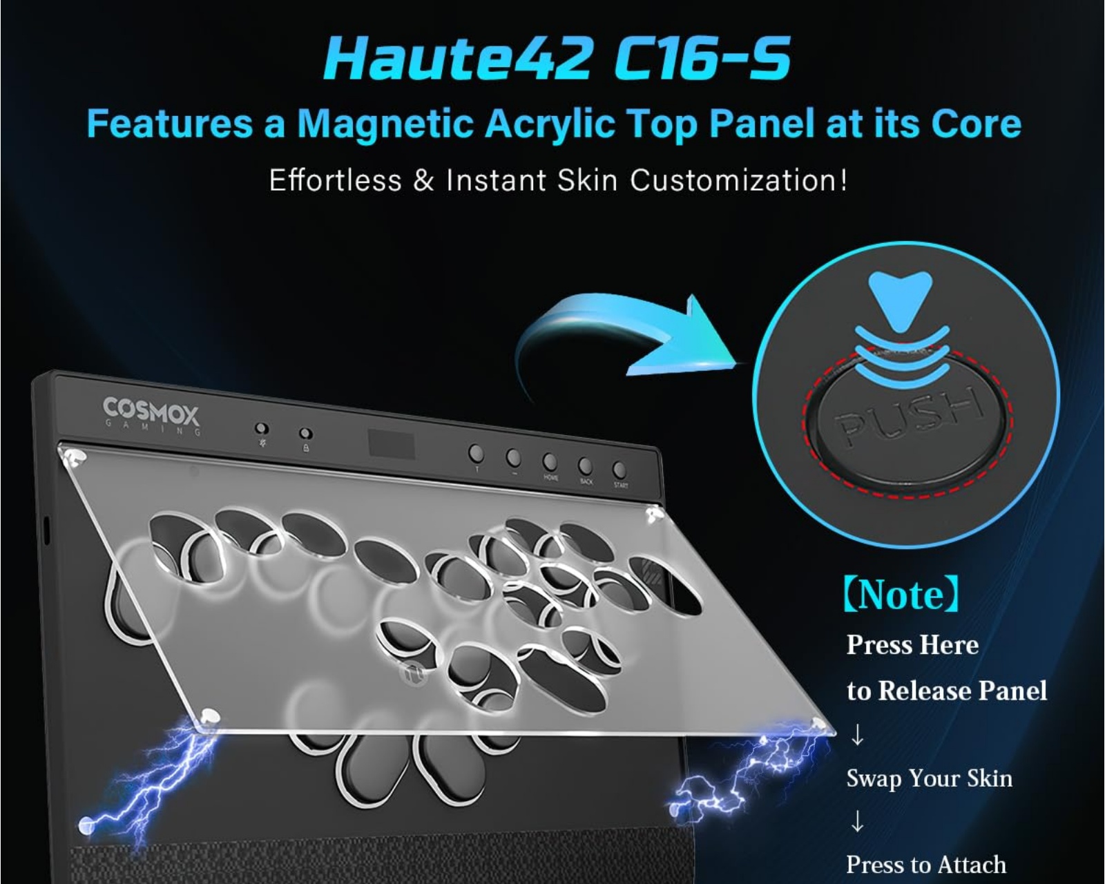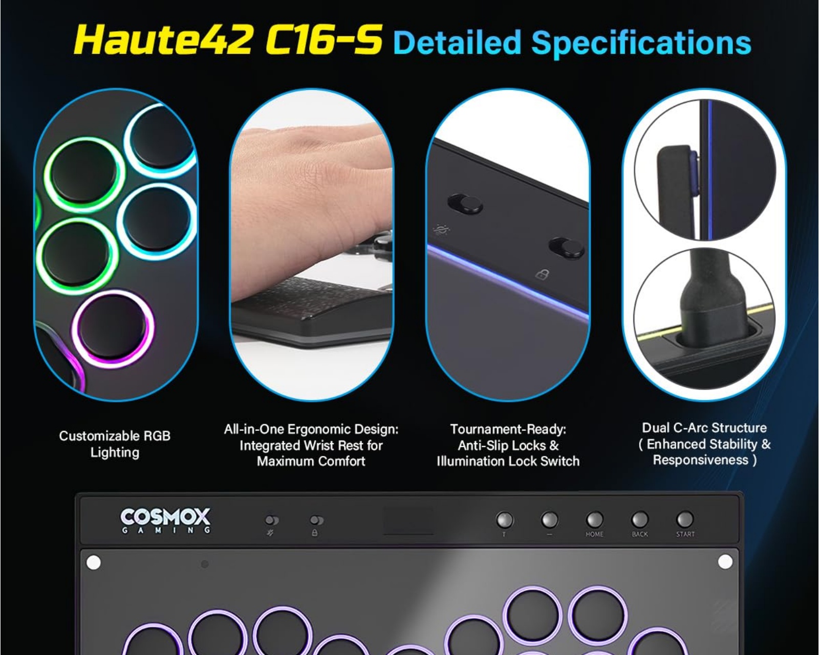 Haute42 C16-S Arcade Controller is a revolutionary game controller that combines modern design with advanced technology. With a unique magnetic panel concept, the user can easily customize their gaming experience without the need for screws.The ergonomic design of the C16-S and the RGB ring lighting around the buttons provide both visual appeal and practical functionality. The package also includes art templates for personal customization, as well as a tournament lock to prevent unwanted presses during intense gaming sessions. With an ultra-low latency of less than 1 ms and support for firmware updates, it guarantees a stable and reliable gaming experience.