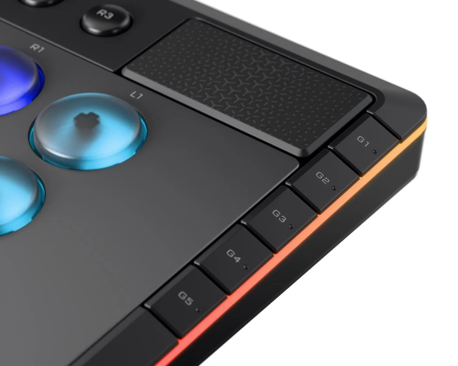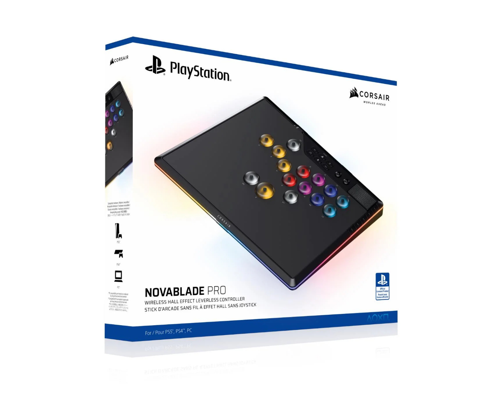Novablade Pro from Corsair is a wireless arcade controller featuring Hall Effect technology, designed to give gamers an edge in battle through faster and more precise control. It offers 15 adjustable buttons with 8 programmable G-keys, and is compatible with PS5, PS4, and PC. With tri-mode connectivity, users can easily switch between wired, 2.4GHz wireless, and Bluetooth connections.The controller is equipped with CORSAIR MGX Hyperdrive Hall Effect magnetic switches that have a lifespan of up to 150 million key presses. This design provides stability and precision with a unique double-rail design that ensures users experience a smooth and wobble-free pressing feel. Adjustable activation points can be set between 0.1mm and 4.0mm, allowing gamers to customize the feel according to personal preferences and play styles.