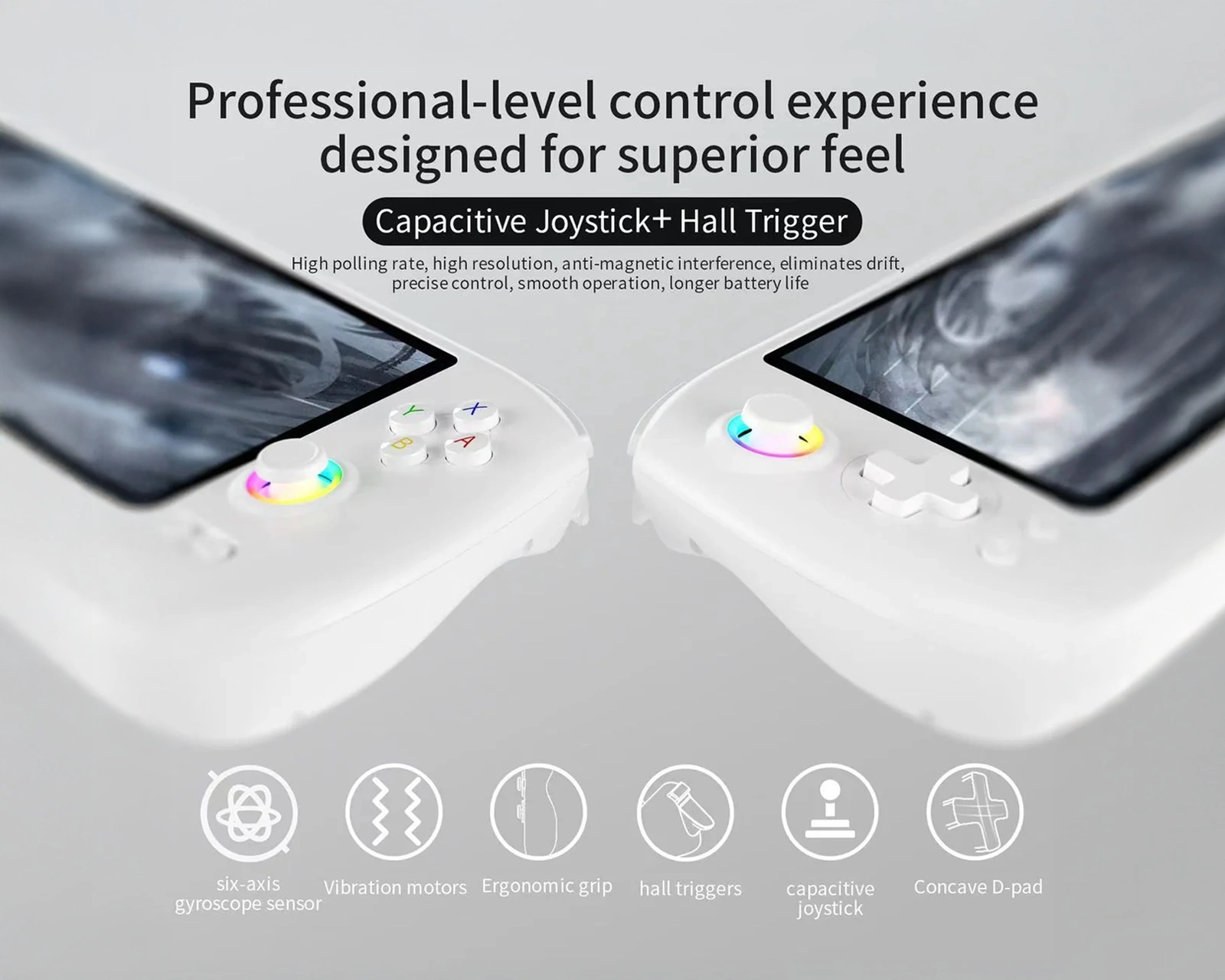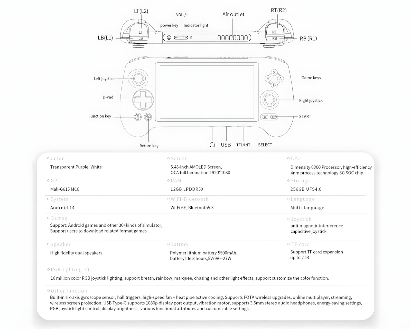 The RG557 is a retro emulator from Anbernic that allows you to play both classic and modern games and emulators. It is built on a Dimensity 8300 processor that supports efficient multitasking and gaming performance. With a 5.48-inch AMOLED display and a resolution of 1920x1080, it is also capable of handling HD content. The RG557 is aimed at gaming enthusiasts and retro gaming fans.This console is equipped with an octa-core processor and a Mali-G615 GPU, providing fast and smooth graphics rendering. With 12GB LPDDR5X RAM and 256GB UFS 4.0 storage, users can store more than 8,000 games. The RG557 runs Android 14 and supports both WiFi 6E and Bluetooth 5.3 for stable wireless connectivity. A 5,500mAh polymer lithium battery provides approximately 8 hours of use, and the console has a comprehensive set of ports including USB Type-C and 3.5mm audio output for headsets. With RGB lighting effects and a built-in six-axis gyroscope sensor, it also offers additional functionality for a more dynamic gaming experience.