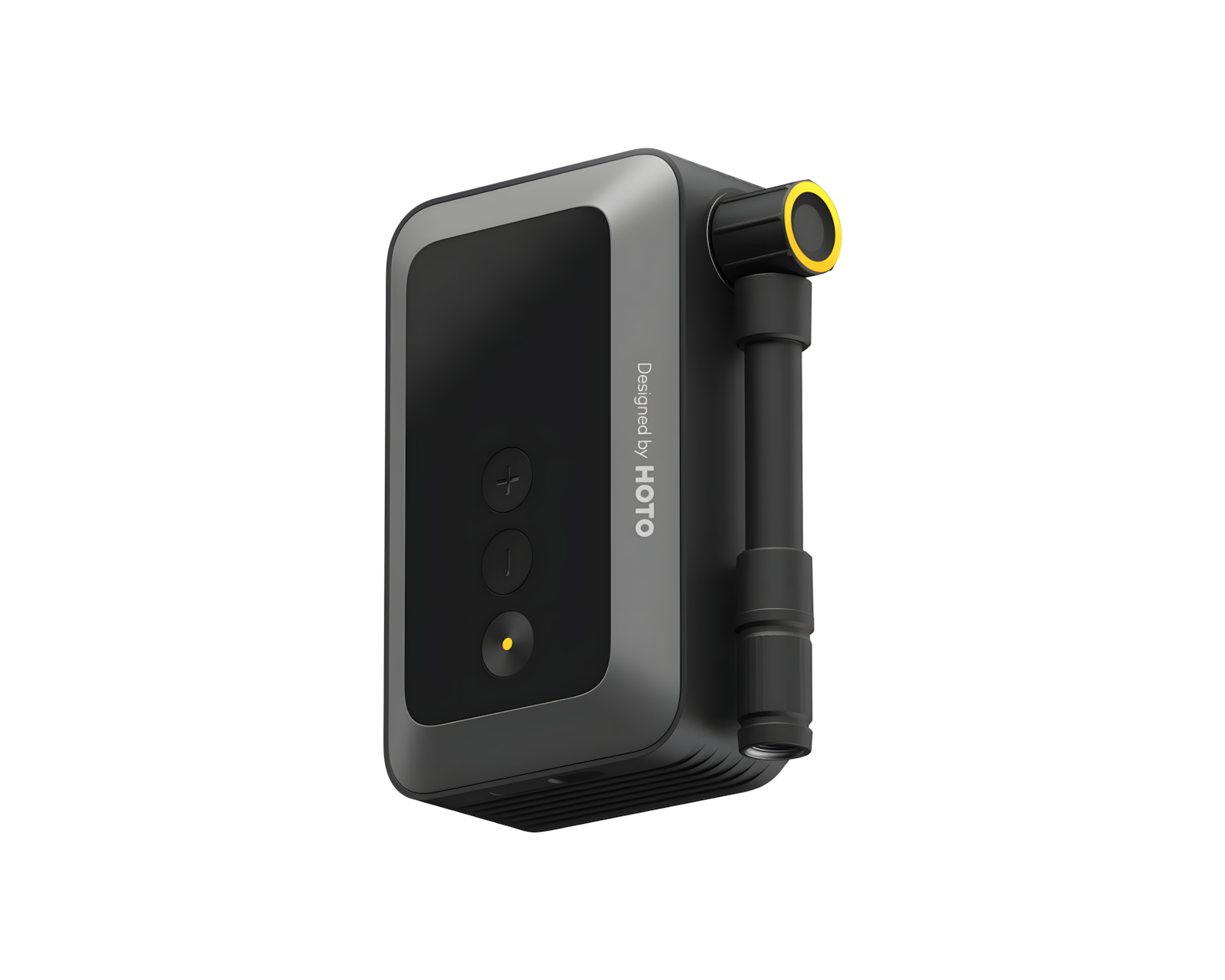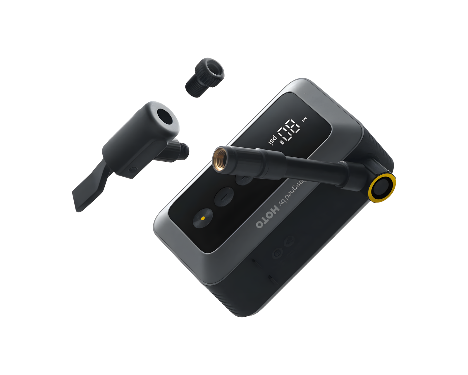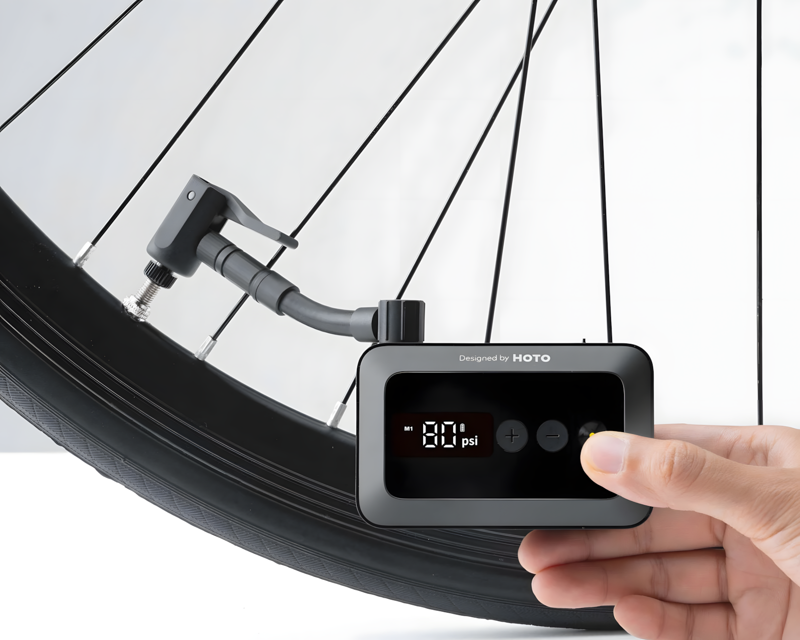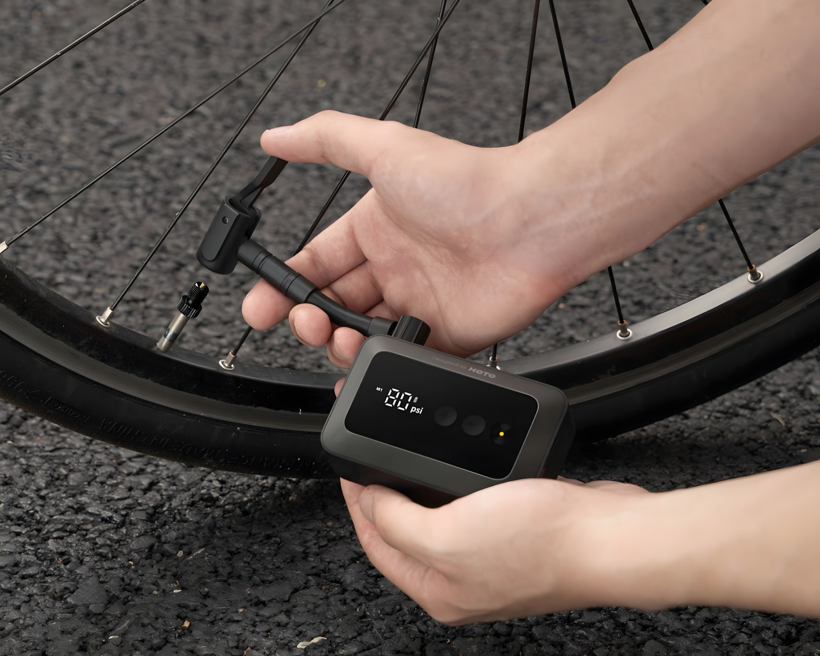 Air Pump Fickformat is a compact electric air pump from HOTO. It is designed for use with bicycles, motorcycle tires, and balls. With a pressure setting that can be digitally adjusted between 3 to 150 psi, the pump automatically shuts off when the preset pressure is reached and remembers the last setting for quick reuse. It is suitable for road bikes, e-bikes, motorcycle tires, and small inflatable items.The air pump's design is both lightweight and compact, making it easy to carry in a bag or pocket. The built-in lithium battery provides enough power to inflate up to eight bicycle tires and can be quickly charged via USB-C. An indicator shows the charging status, and the included adapters provide support for Schrader, Presta, and Dunlop valves as well as for quick connection and needle valves. With these components, the pump is versatile and can be used for a range of inflatable objects.