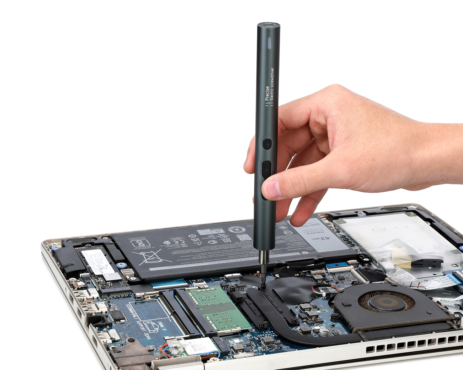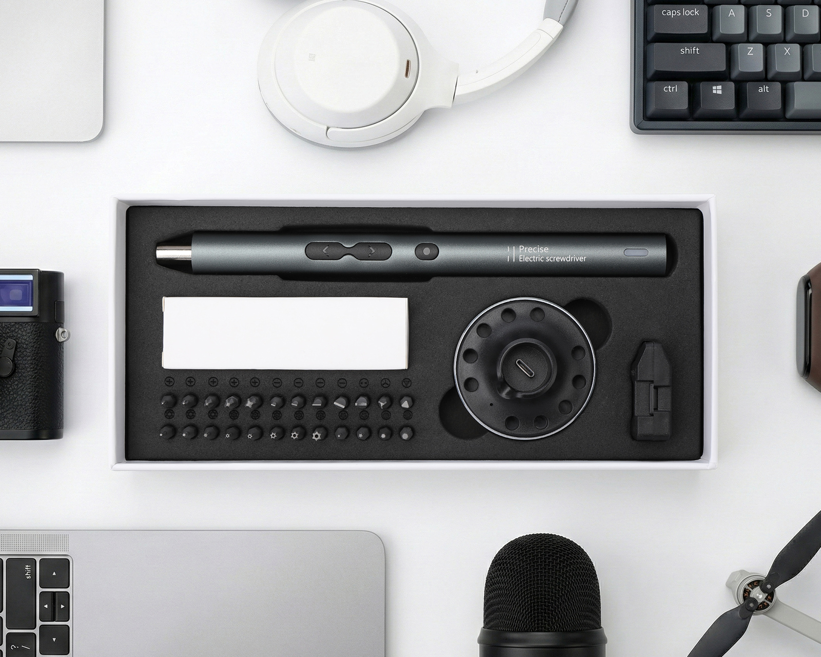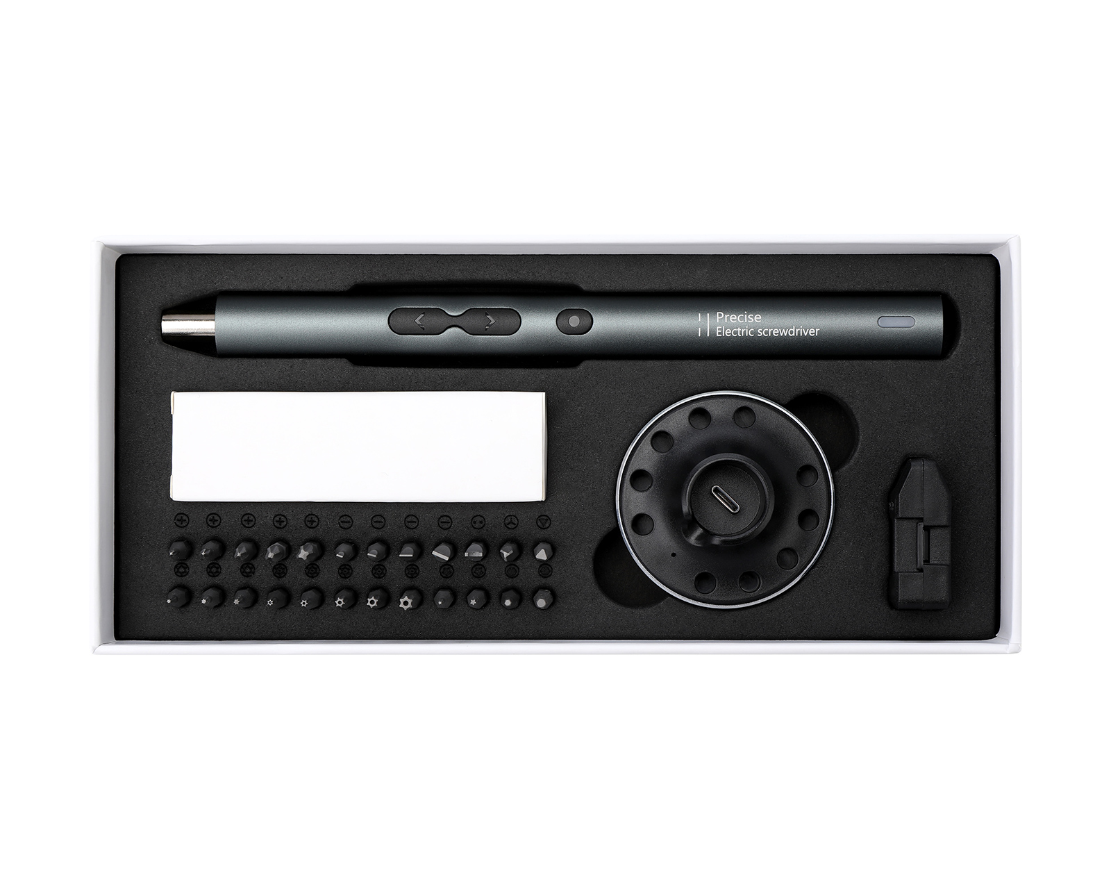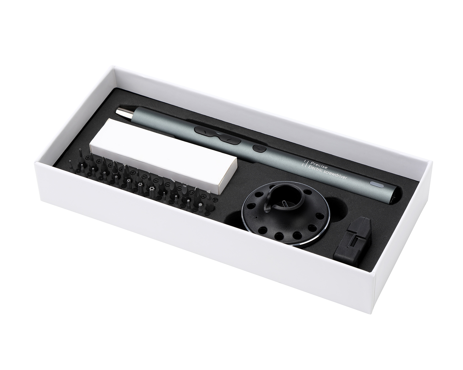 Electric Precision Screwdriver from MaxMount, designed to meet the needs of technically inclined users. This compact screwdriver offers 24 premium S2 steel screwdriver bits and a convenient charging station for easy use. Designed to provide optimal precision and durability, with an ergonomic body that makes screwing easy and comfortable.The screwdriver features a powerful 350mAh lithium battery that offers a full charge in 50 minutes and can screw up to 300 screws per charge. The 360-degree shadowless lighting with three embedded LED lights effectively illuminates the work area. Additionally, the cordless and rechargeable design makes usage flexible and convenient. A smart motor with intelligent protection features guarantees long lifespan and efficient operation. With a maximum speed of 200 rpm and a maximum electric torque of 0.35N.m, this screwdriver is perfect for a variety of applications at home or in the office.