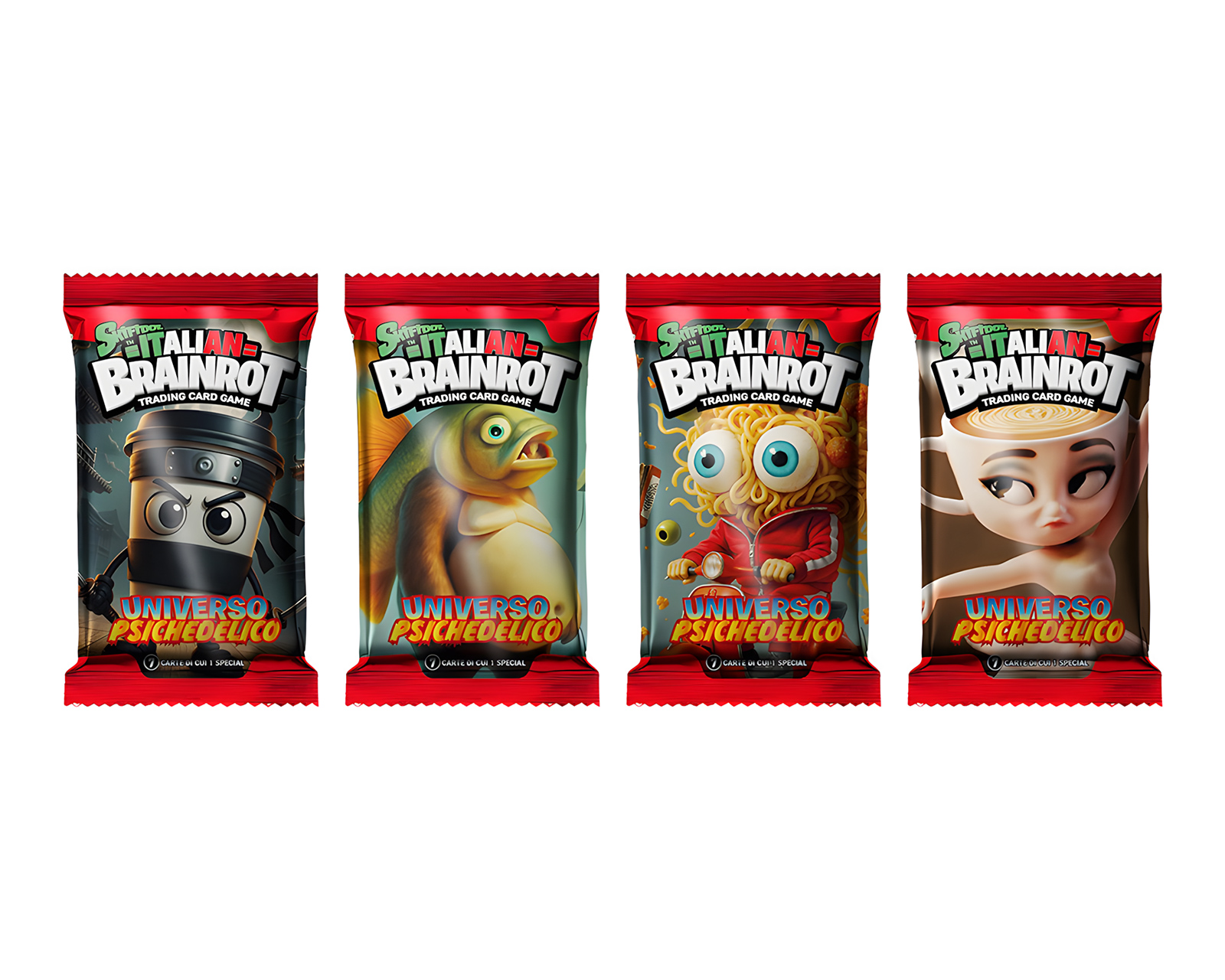 Skifidol Psychedelic Universe Collectible Card Game is a card game from Italian Brainrot, offering a unique collecting experience with a blend of colorful and creative designs. This booster pack contains seven cards, one of which is a special card that players can use to build their own strategies and challenge other gamers. The gaming experience is aimed at both beginners and experienced players of collectible card games. With this game, users can dive into a psychedelic world of cards and imagination.Summary