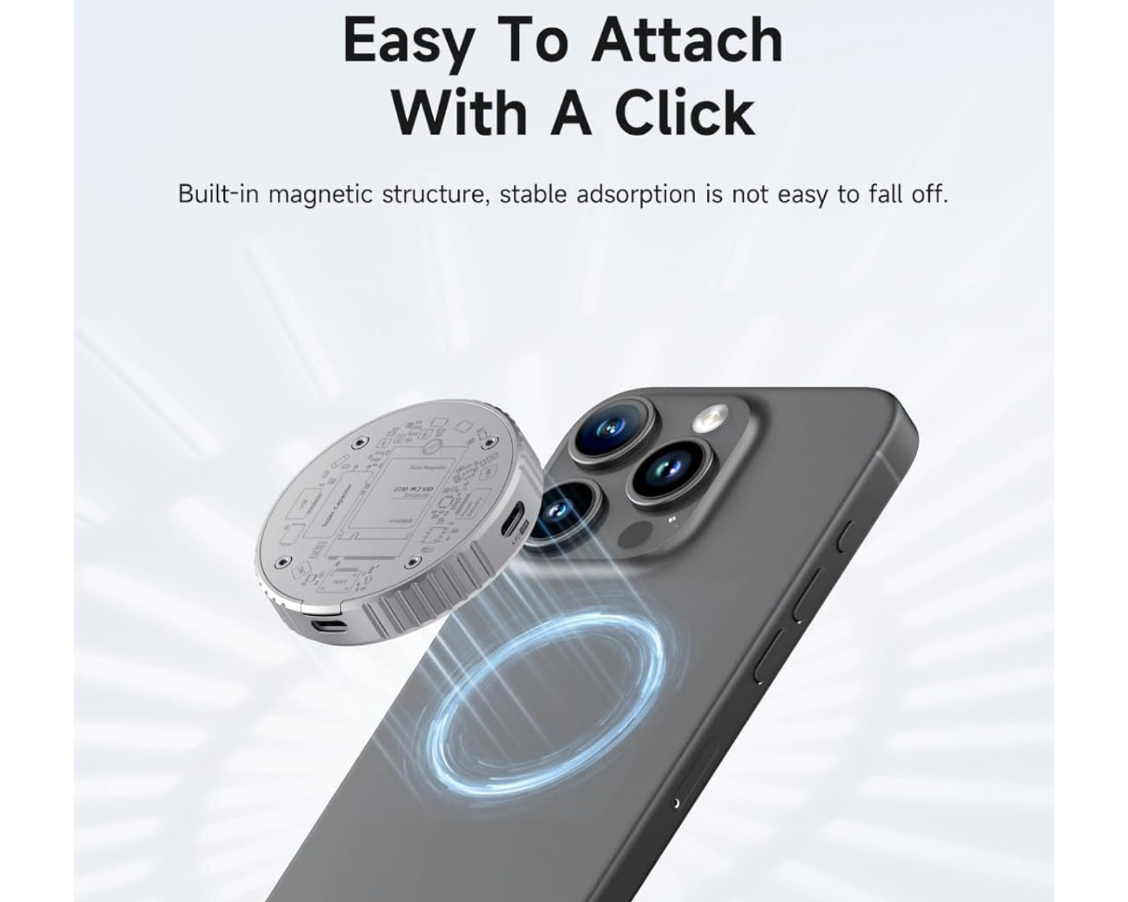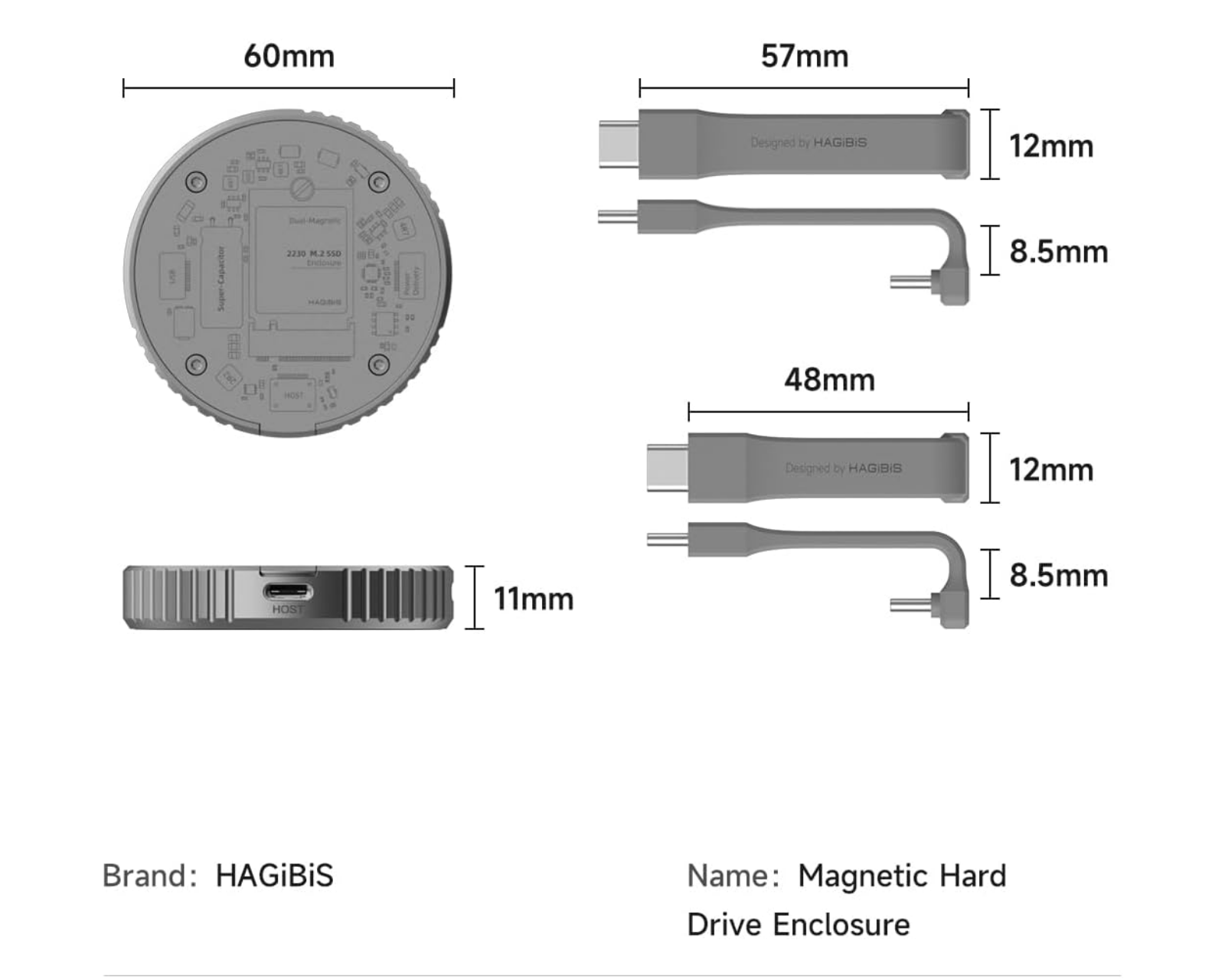 Hagibis M.2 2230 NVMe SSD hard drive enclosure is an aluminum construction that provides protection and functionality for NVMe SSDs in the 2230 format. It is specifically designed to support M-Key and B+M-key devices, offering a transfer speed of up to 10 Gbps with USB 3.2 Gen2. This hard drive enclosure features an integrated magnetic structure that ensures a secure connection with MagSafe, stabilizing it when attached to compatible devices. It is intended for use with devices such as the iPhone 15 Pro/Pro Max and other devices with USB Type-C ports.The hard drive enclosure is made of aluminum, providing good durability and heat dissipation to optimize performance during use. Additionally, it offers double protection against power outages with a supercapacitor and a main controller, which prolongs data protection during power interruptions. Equipped with two USB Type-C cables for data transfer, it is compatible with other devices, including MacBook and Android phones. It supports up to 2 TB capacity and offers plug-and-play usage without complicated installation.