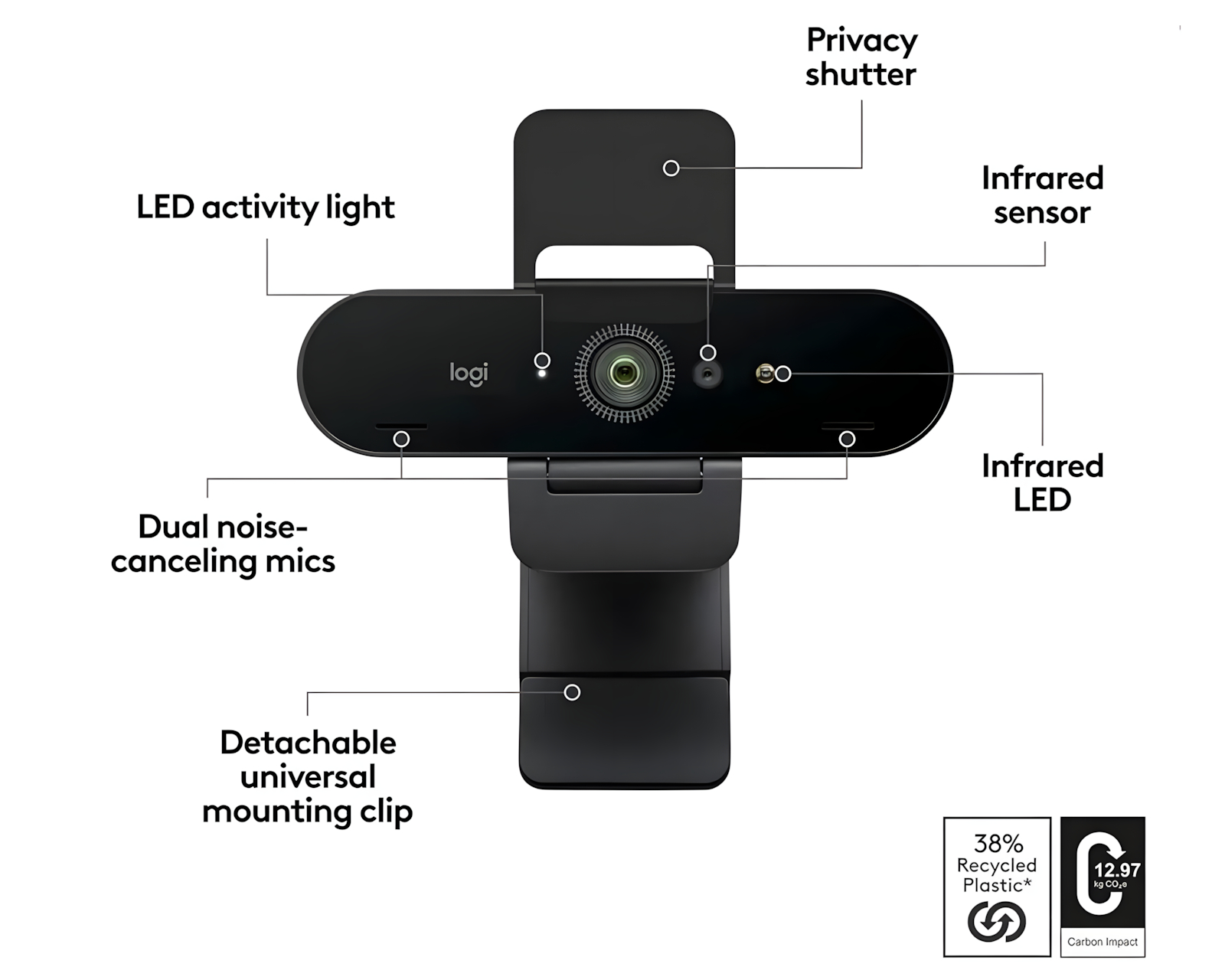 BRIO 4K is a professional webcam from Logitech that offers exceptional video quality and is designed for business use. With a resolution of up to 4K at 30 fps, autofocus, and 5x digital zoom, it ensures that every video conference is clear and detailed. It also supports Windows Hello for secure login via facial recognition.The webcam body is made of low-carbon aluminum, which provides a sustainable construction while minimizing environmental impact. With advanced RightLight 3 technology, the exposure is automatically adjusted to guarantee optimal image quality, regardless of lighting conditions. Additionally, it features dual omnidirectional microphones with noise reduction that capture sound clearly from a radius of up to 1.2 meters, making it ideal for professional calls. The webcam is certified for Zoom and Google Meet, which means easy integration with common meeting programs.