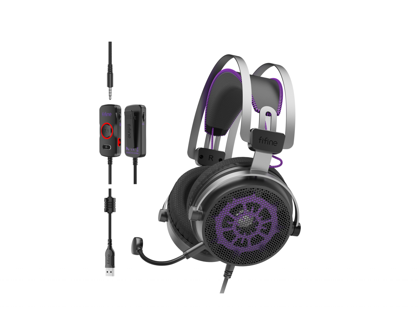 FIFINE H18V is a gaming headset from Fifine that offers an open acoustic design and high-quality 53 mm drivers for superior sound reproduction. This headset is designed to give gamers a tactile advantage during gameplay, focusing on sound details that can determine the outcome of a match. Key features include a detachable microphone that ensures clear communications and an ergonomic adaptive headband for long-lasting gaming.The build quality of the H18V is optimized for comfort and durability, with a lightweight design and a double layer in the headband that ensures an even weight distribution. The extra thick foam ear cups are both soft and ventilated, contributing to a pleasant feel during long gaming sessions. The included USB control allows quick adjustment of volume and microphone sound, making it easy to stay focused during intense moments. With a 3.5 mm jack and USB-A connection, the headset easily connects to multiple platforms such as PC, PlayStation, and Xbox.