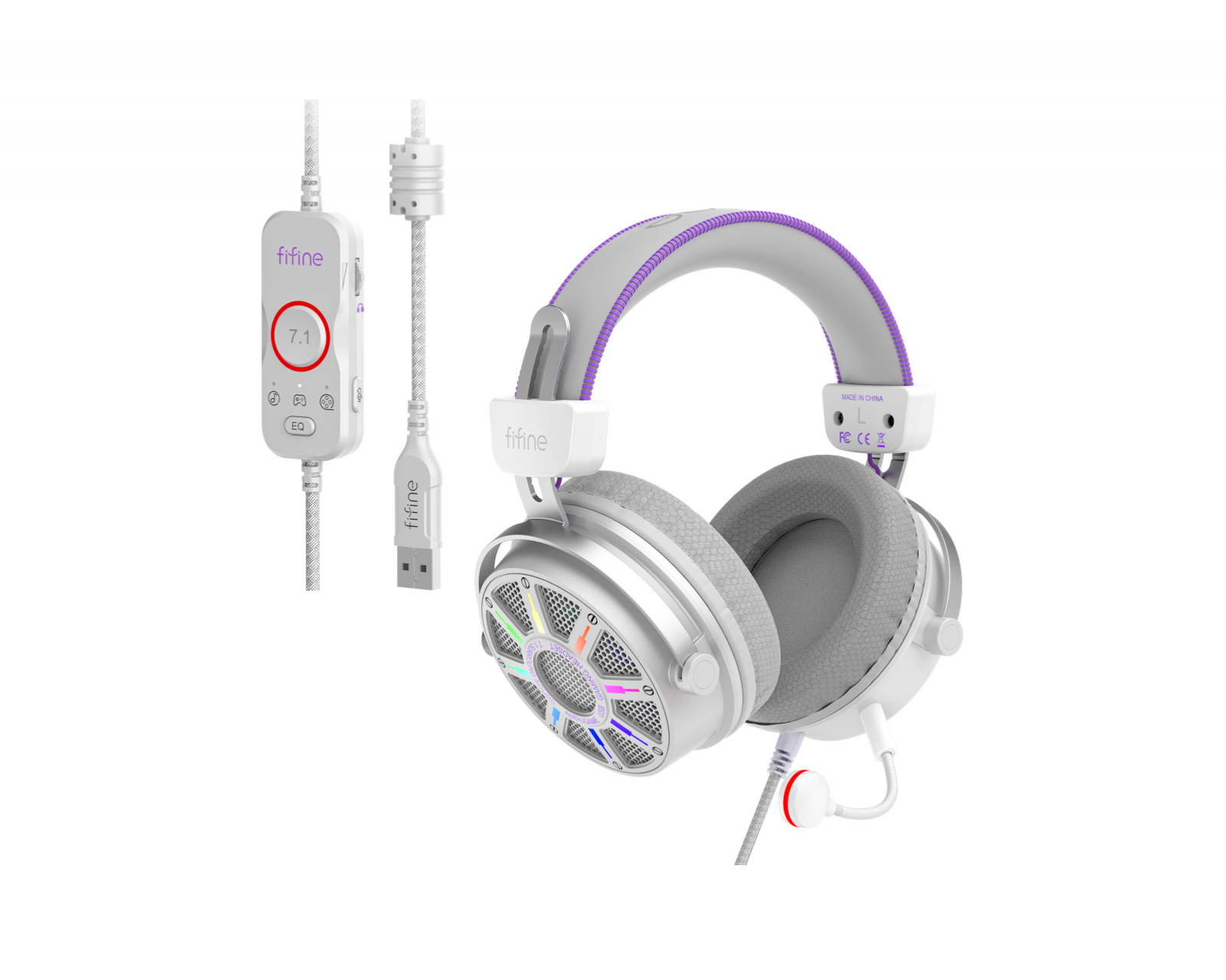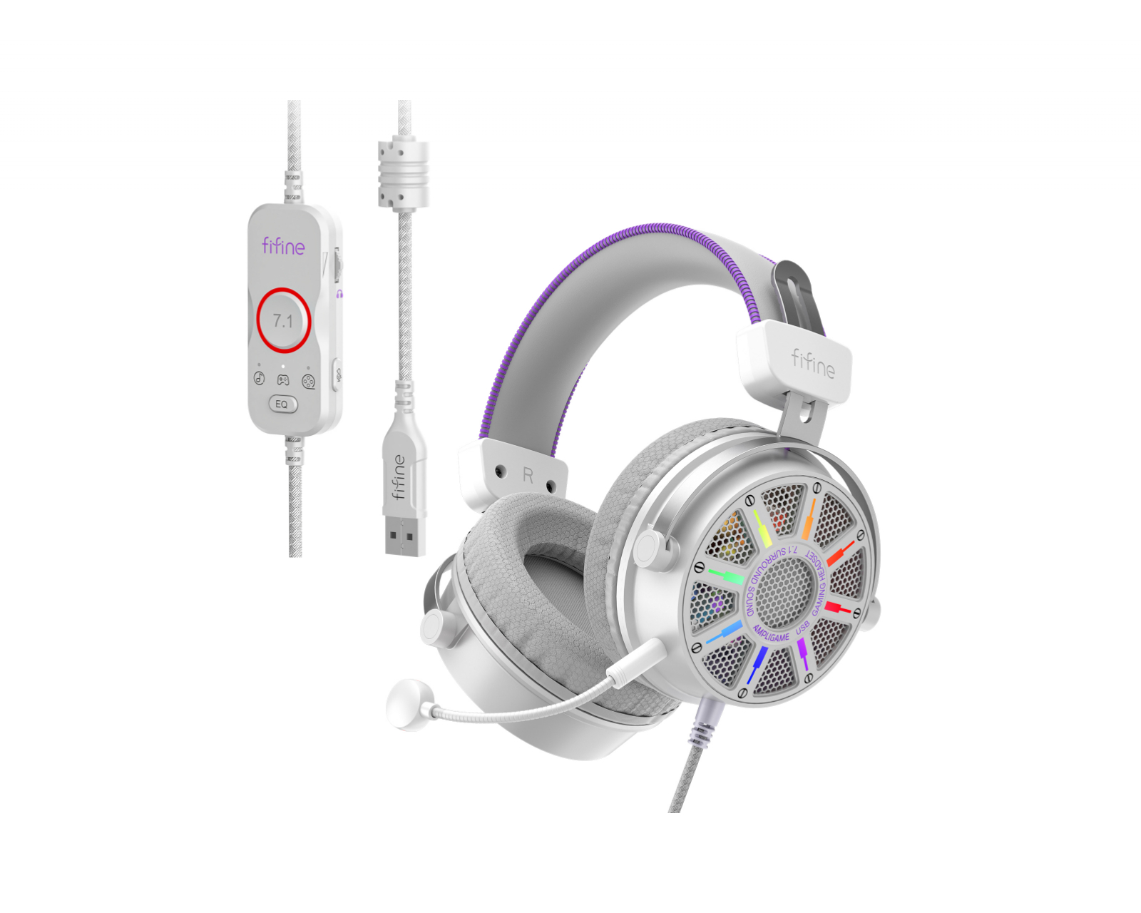 H19 is a gaming headset from Fifine, designed to provide a superior audio experience during gaming and streaming. The headset delivers 7.1 virtual surround sound, offering a detailed soundstage and allowing gamers to hear exactly where the sound is coming from. Equipped with a detachable microphone, it ensures clear and crisp communication during gameplay. The build quality of the H19 is of the highest standard, featuring soft ear cushions designed to provide comfortable support during long gaming sessions.The RGB lighting is customizable, giving gamers the ability to tailor their headset to match the rest of their equipment. With various EQ settings, you can also adjust the sound profile based on the game you are playing, providing an additional level of customization to optimize the audio experience. The headband is adjustable, ensuring a perfect fit for different head sizes and offering high ergonomics during use.