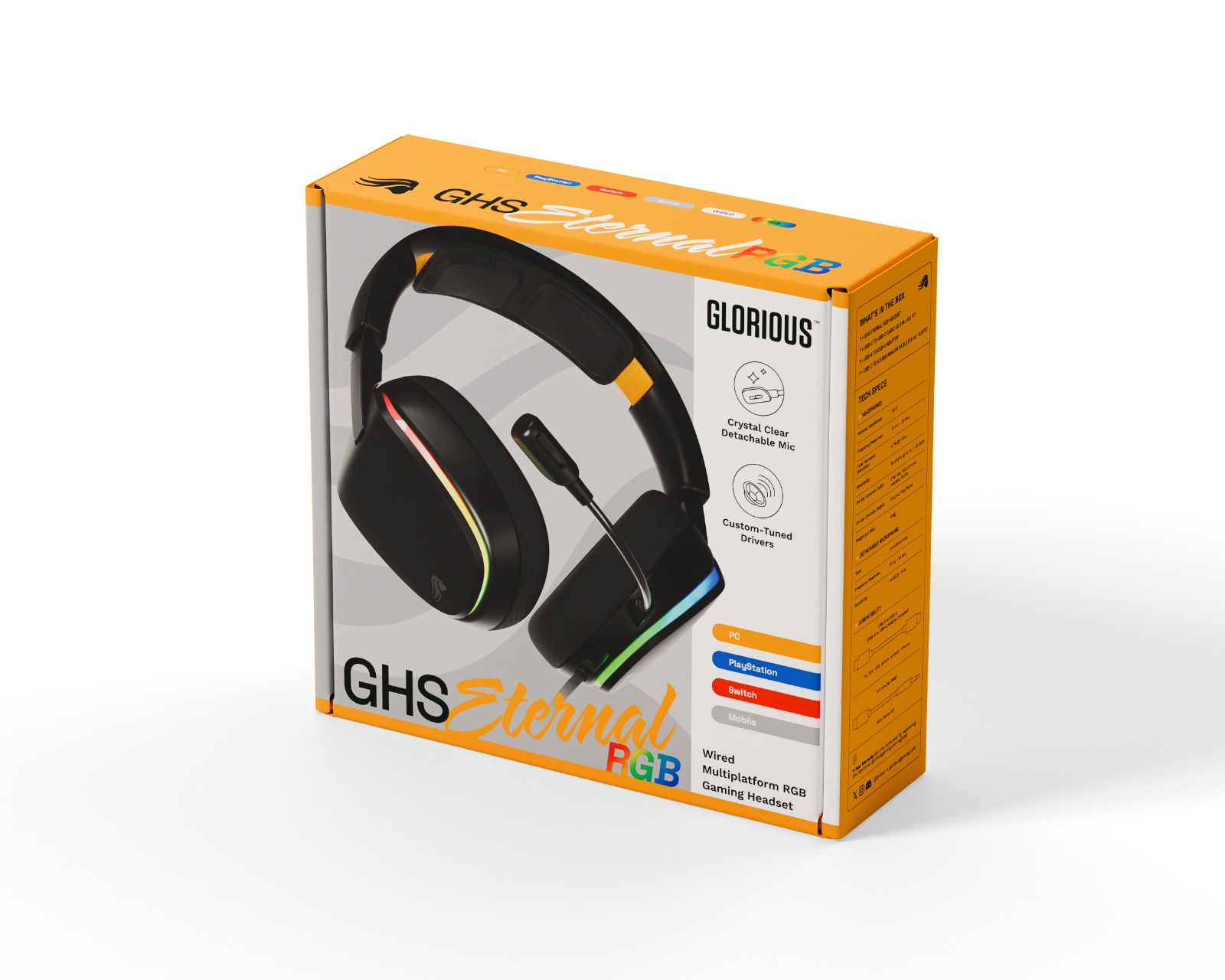 Glorious GHS Eternal RGB is a wired gaming headset from Glorious, designed to deliver a high-quality sound experience and comfort during long gaming sessions. It features custom angled drivers to provide a balanced sound profile and a detachable microphone that ensures clear communication. It connects via USB-C and 3.5 mm jack and is compatible with multiple platforms including PC and Xbox.The build quality of the GHS Eternal RGB is high, with reinforced materials that protect against intense use and provide extra durability. The headset has memory foam ear cushions and adjustable ear cups, which contribute to comfort during extended use. The built-in volume control and mute button are easily accessible, making adjustments during gameplay smooth. The RGB lighting can be customized through the Glorious CORE software, allowing the headset to match your gaming setup.
