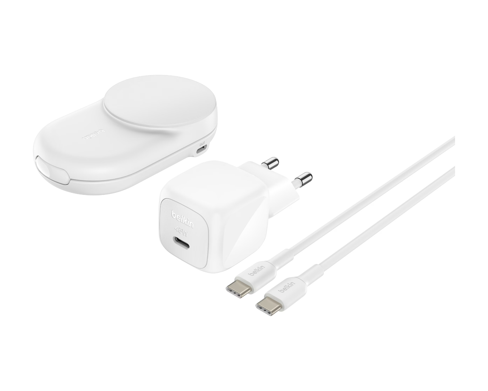 UltraCharge 2-in-1 Qi2 wireless charger is a product from Belkin that offers wireless charging with high efficiency. It has a maximum strength of 25 W and a USB power delivery of up to 45 W. The charger is designed to quickly charge devices, making it suitable for users who need efficient recharging of their mobile phones and accessories.The charger is constructed in white and comes with a 1.5 m long cable and a 45W USB-C power adapter. It features a foldable and travel-friendly design that makes it easy and portable. With ChillBoost, a passive cooling technology, users can minimize heat development during charging to protect the battery. It enables charging an iPhone from 0-50% in just 29 minutes. The charger also has a separate 5W USB-C port, which allows for charging a smartwatch simultaneously.