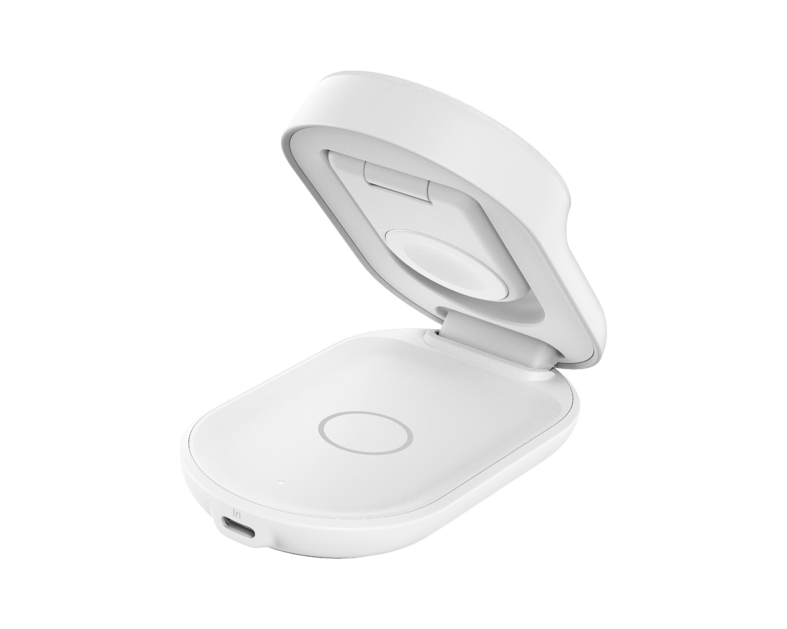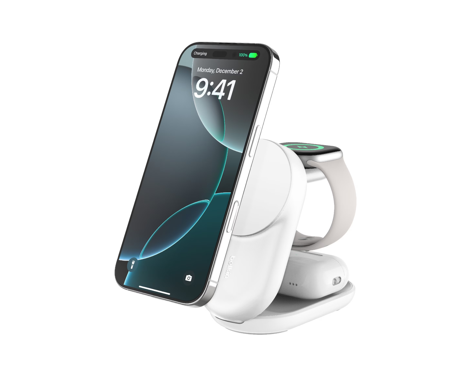 UltraCharge 3-in-1 Qi2 wireless charger is a wireless charger from Belkin that offers extensive charging capabilities. With a maximum power of 25 W and a USB-C power output of up to 45 W, it is designed to efficiently charge multiple devices simultaneously. The charger has a cable length of 1.5 m and a foldable, lightweight design that makes it ideal for both home and travel.The device is powered by Qi2 technology, which enables faster wireless charging. With ChillBoost, a passive cooling technology, heat production during fast charging is reduced, protecting the battery of your devices. For example, the charger can charge an iPhone from 0-50% in 29 minutes and an Apple Watch, series 10, from 0-80% in 30 minutes. It also supports charging AirPods with a power of up to 5 W. The non-slip base and magnetic snap-on adjustment ensure stable charging and an adjustable angle for displaying the device in both landscape and portrait mode.